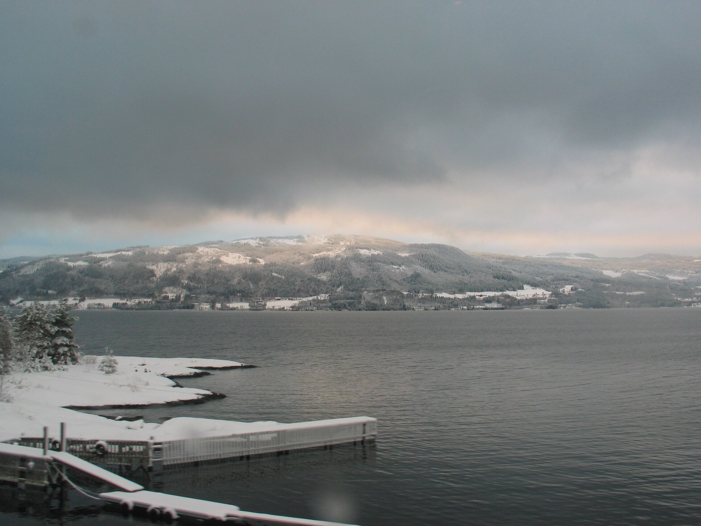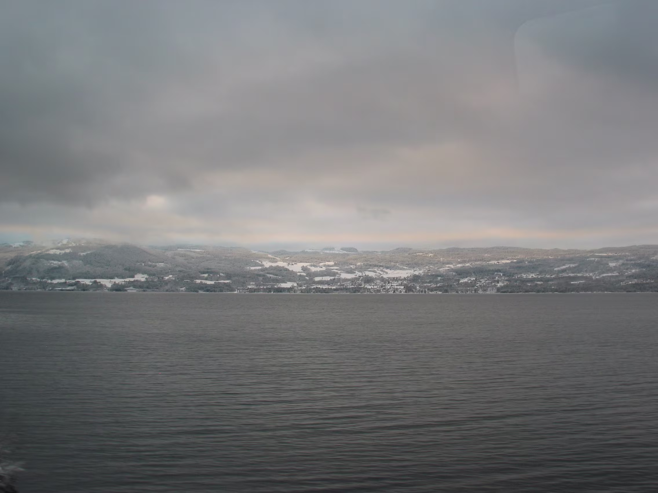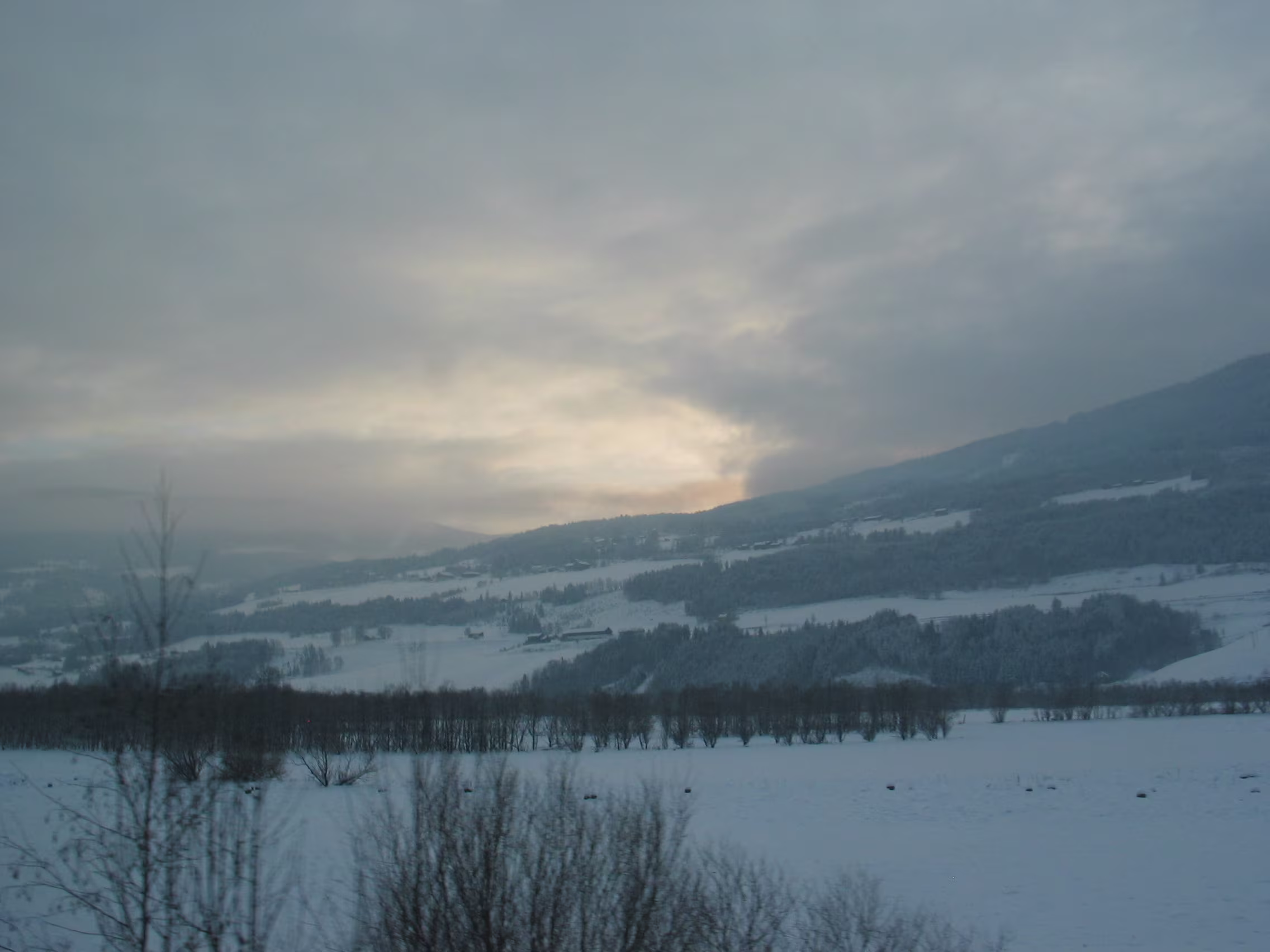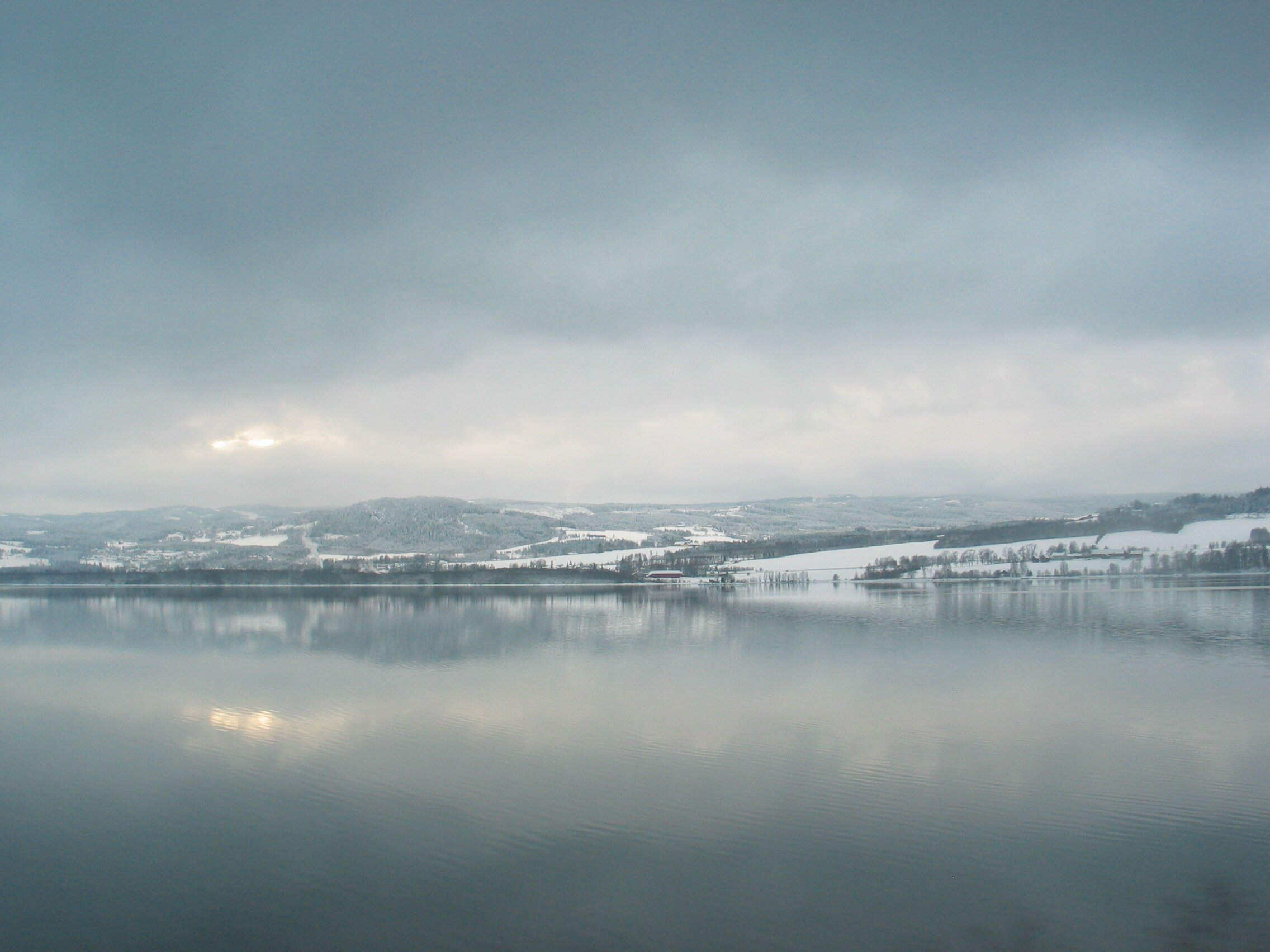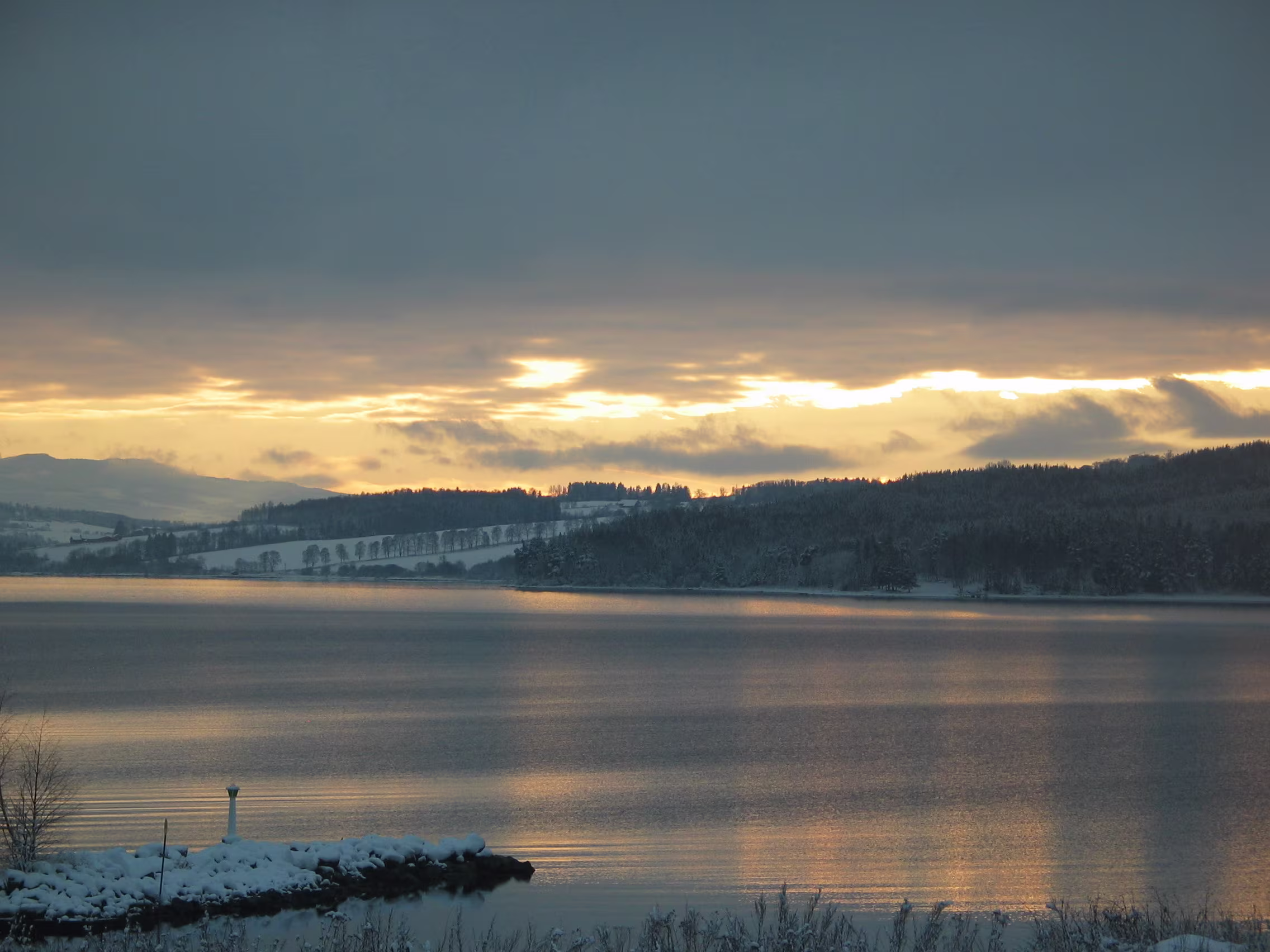 Direkt am Rande des Mjøsa-See kommt der Zug zum Stillstand. Die Sicht ist frei und gibt den Blick frei auf die langsam untergehende Sonne die sich teilweise durch die dichten dunklen Wolken bahn bricht. Fasziniernd.