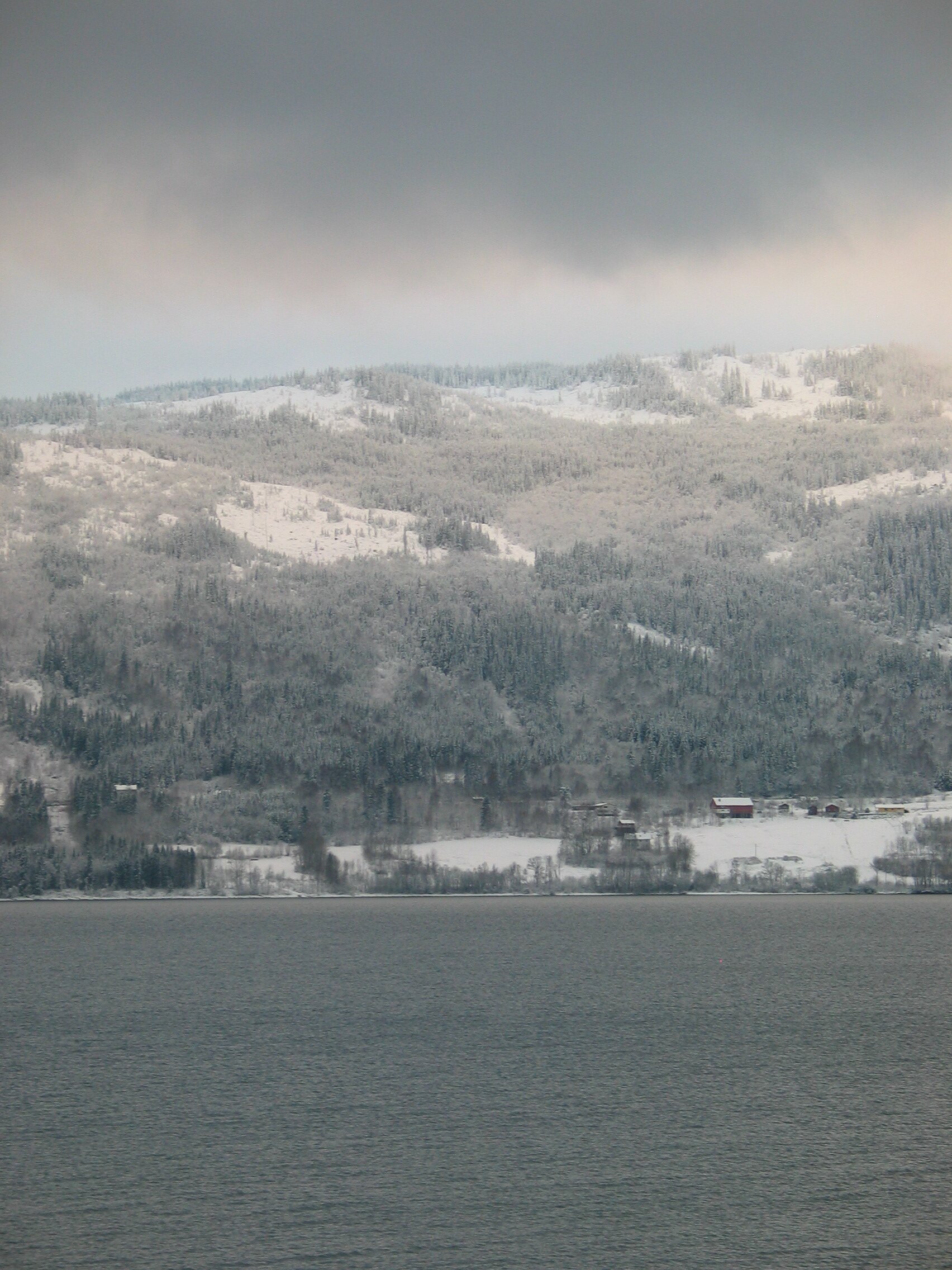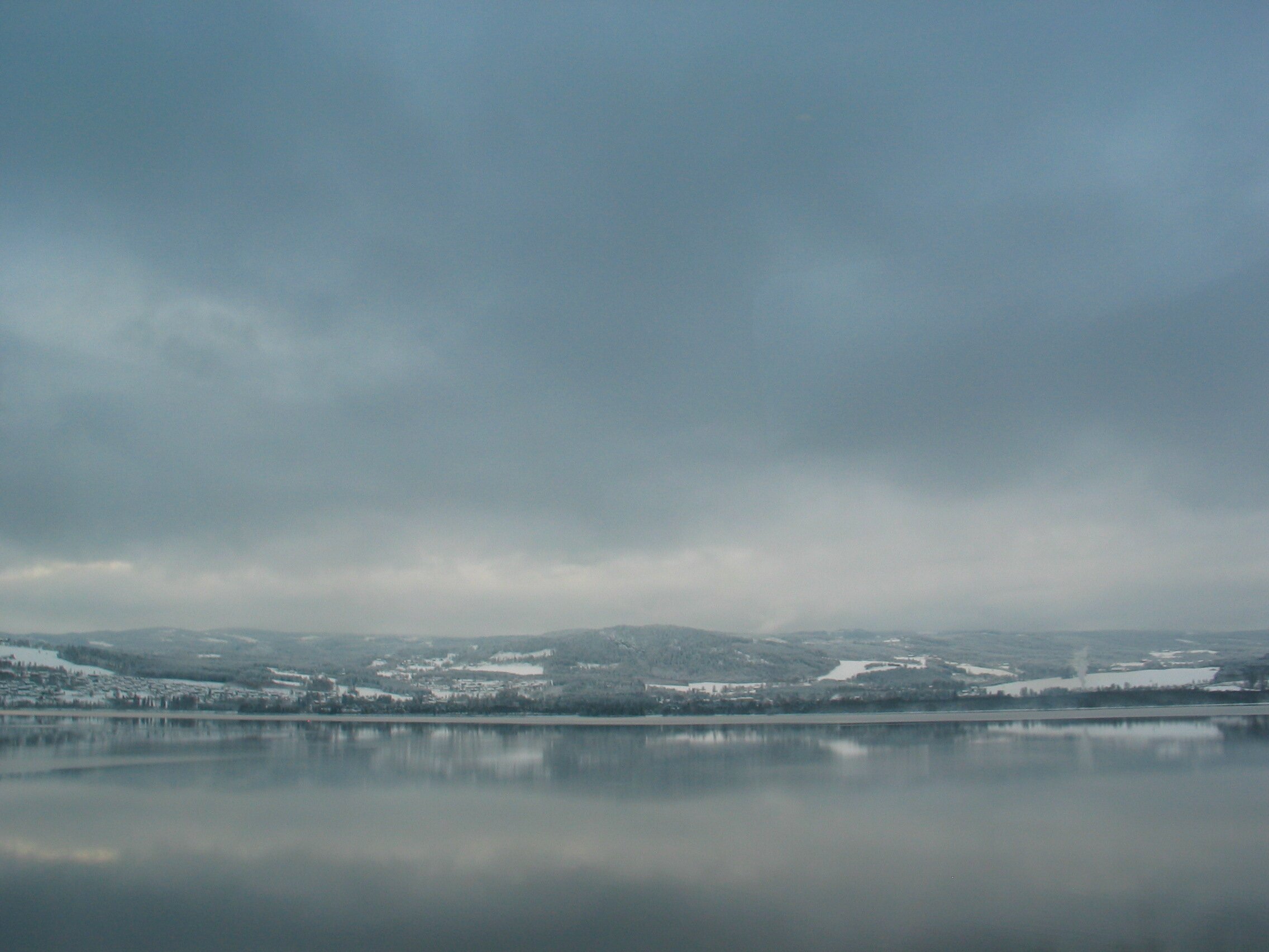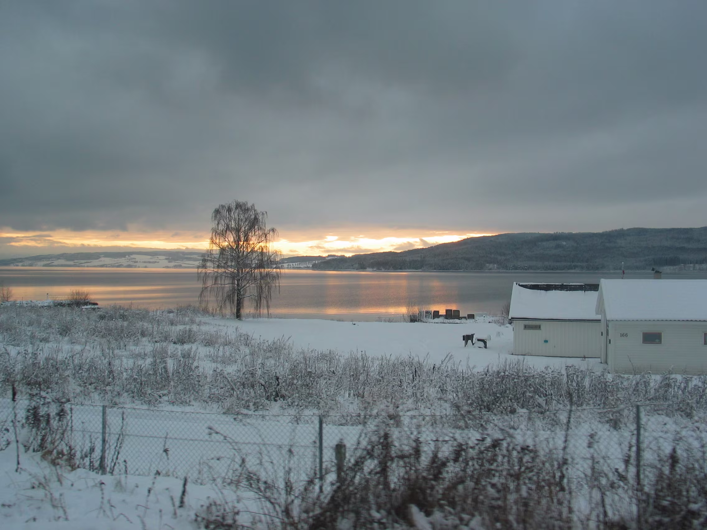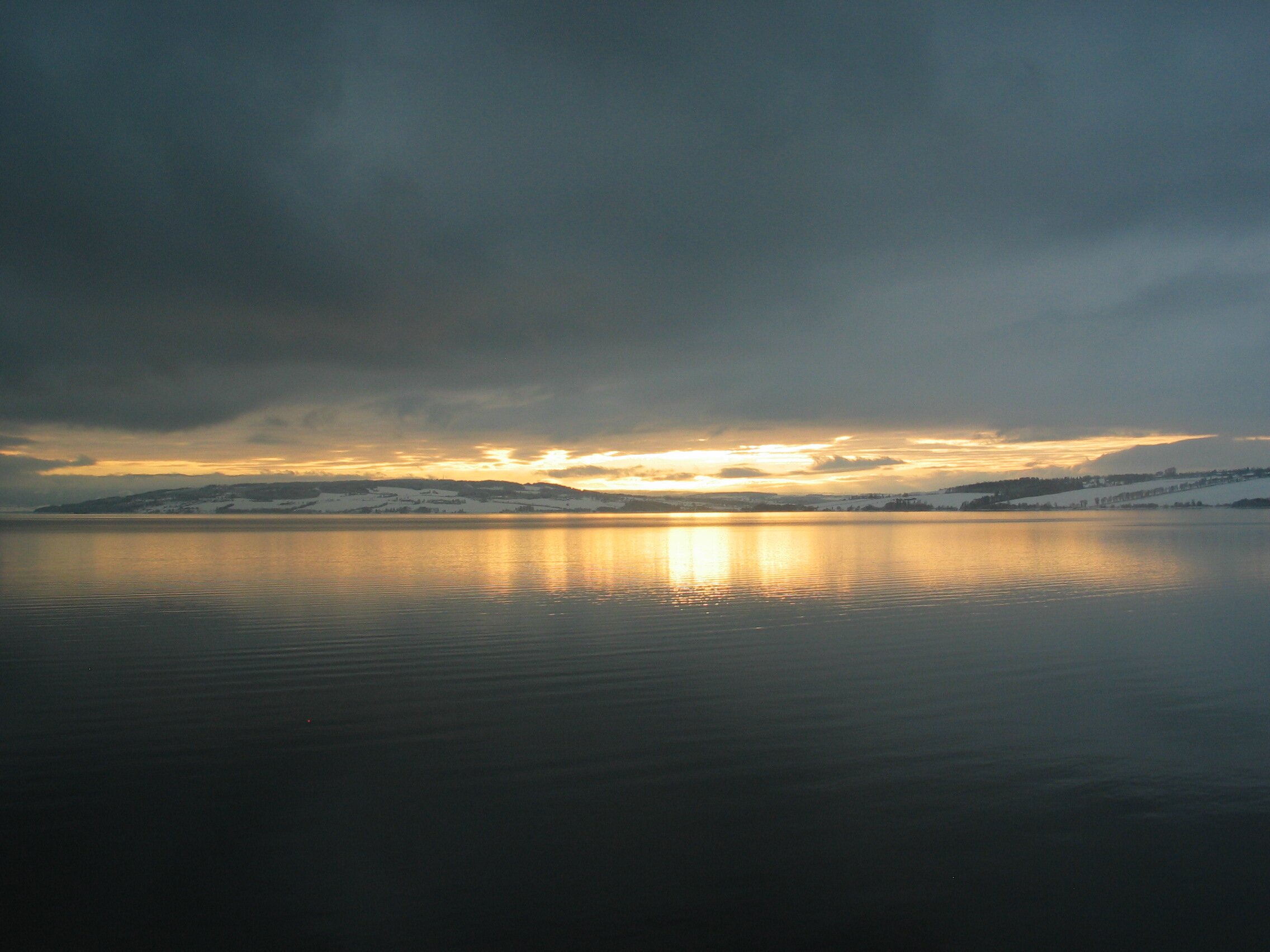 Direkt am Rande des Mjøsa-See kommt der Zug zum Stillstand. Die Sicht ist frei und gibt den Blick frei auf die langsam untergehende Sonne die sich teilweise durch die dichten dunklen Wolken bahn bricht. Fasziniernd.