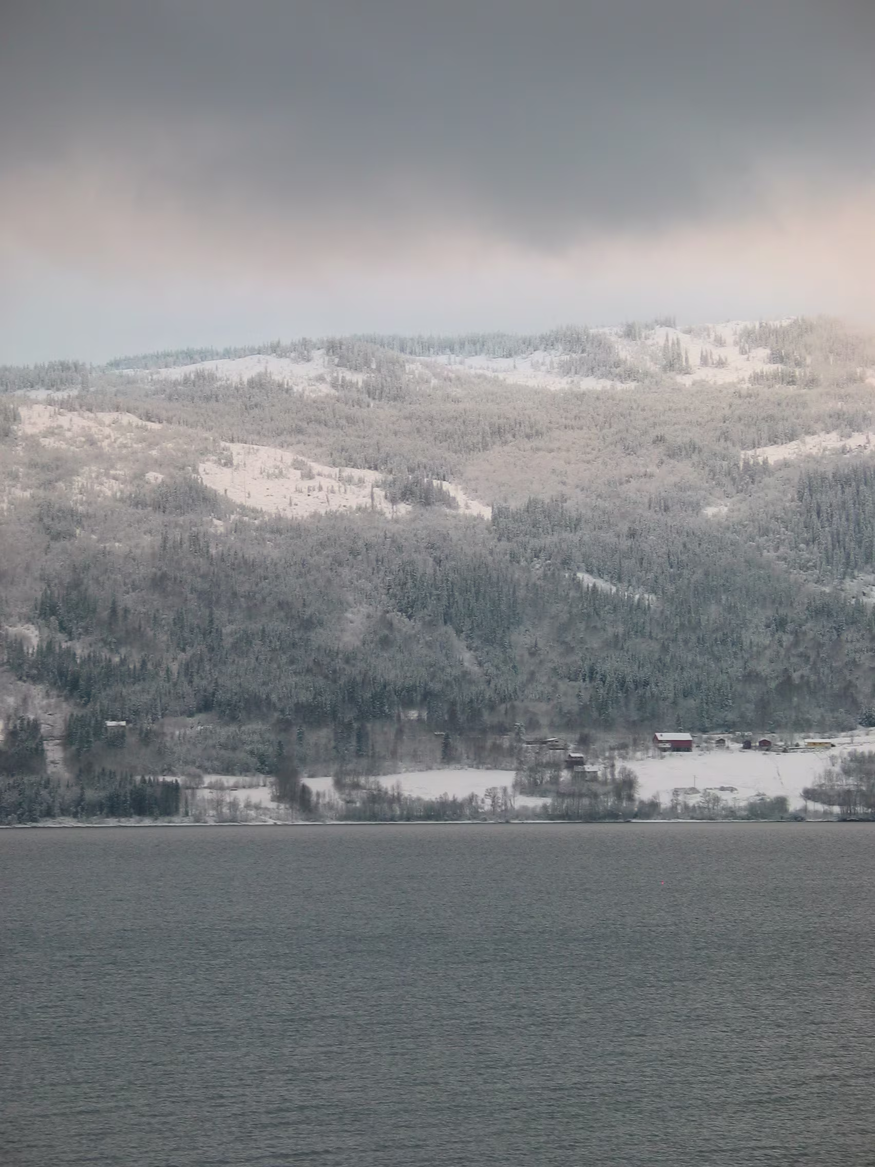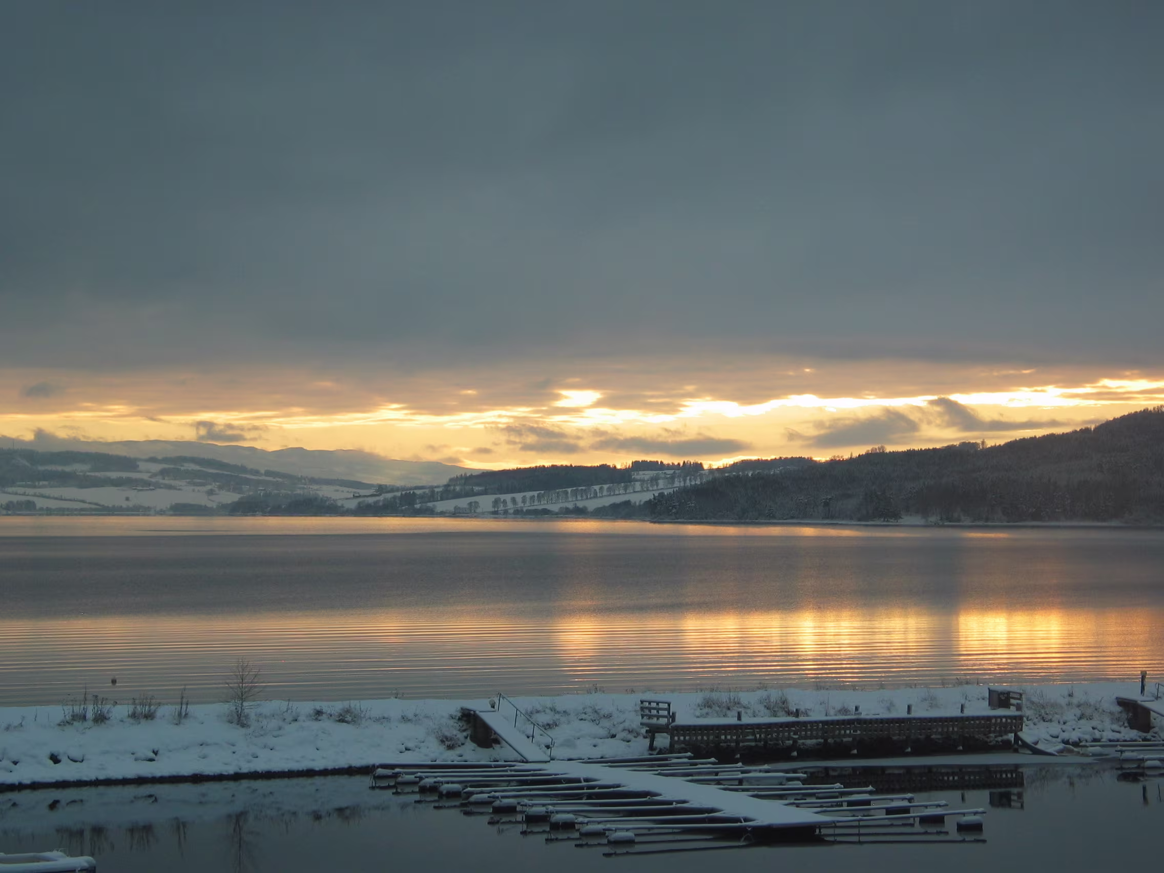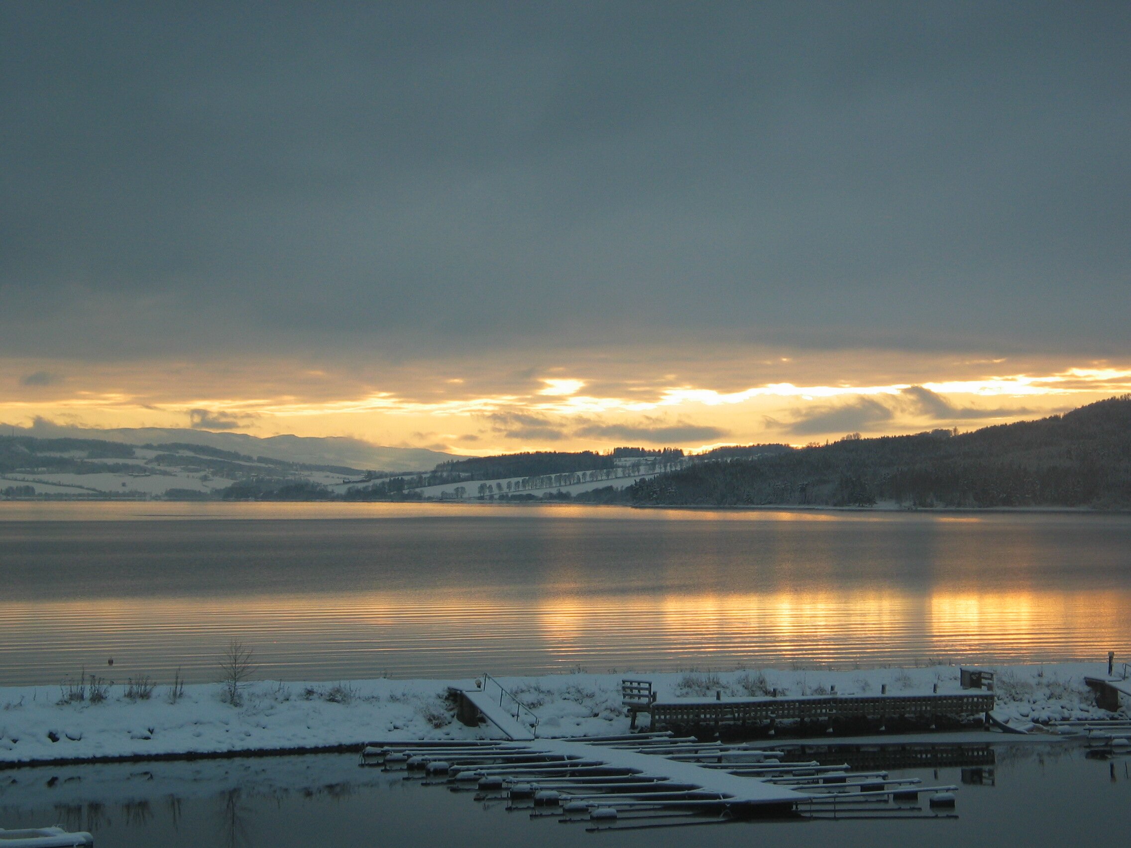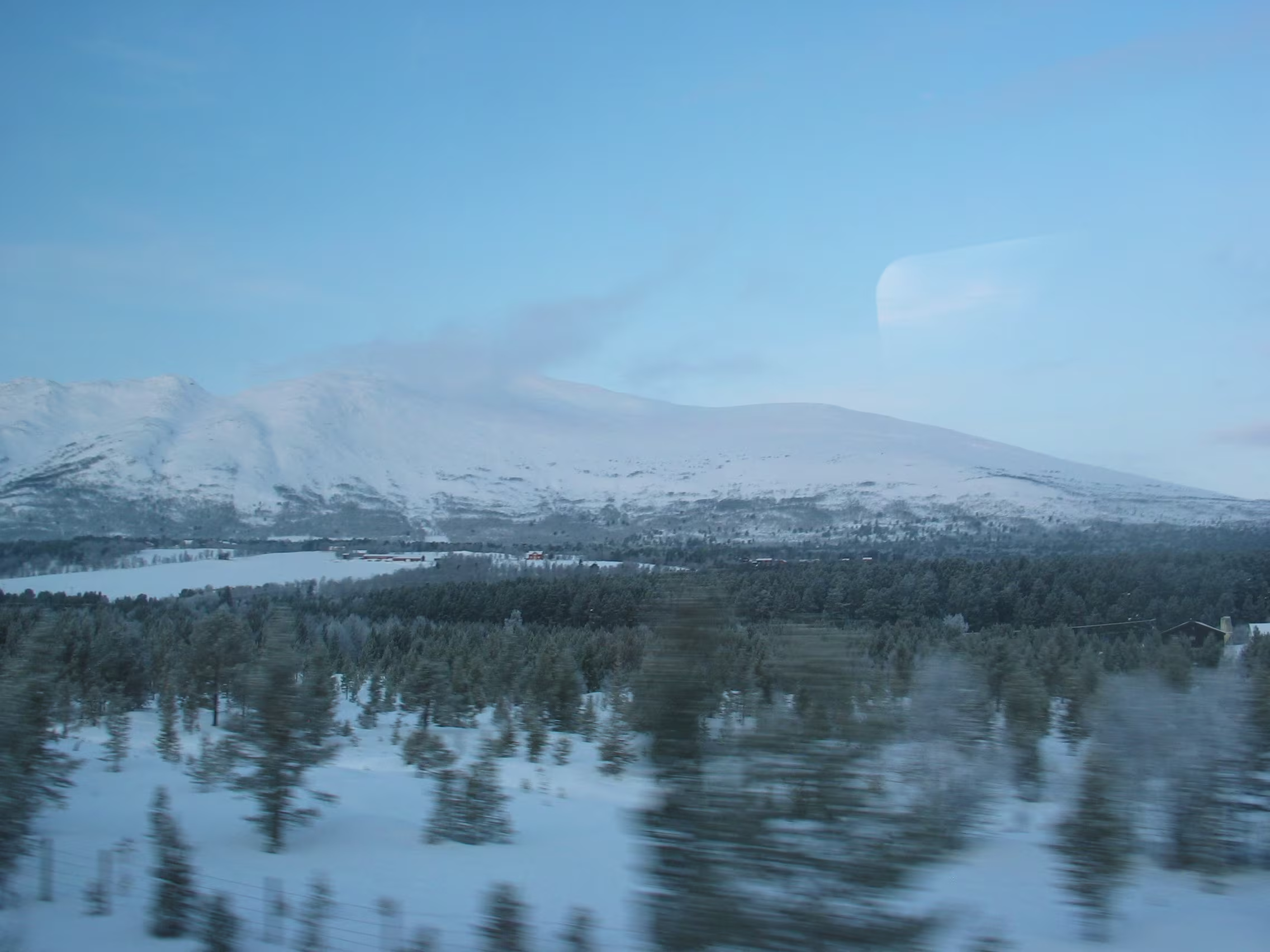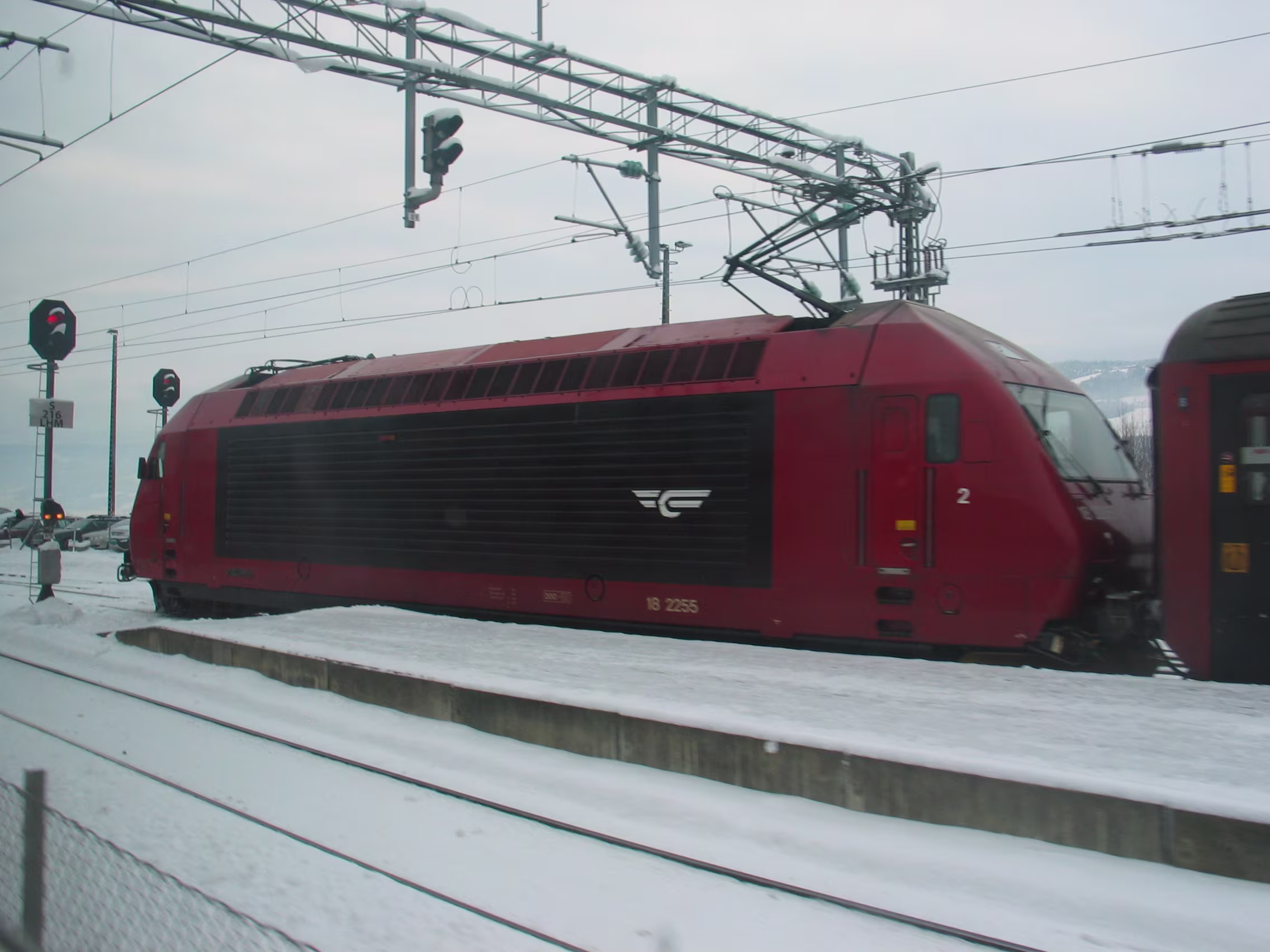 Direkt am Rande des Mjøsa-See kommt der Zug zum Stillstand. Die Sicht ist frei und gibt den Blick frei auf die langsam untergehende Sonne die sich teilweise durch die dichten dunklen Wolken bahn bricht. Fasziniernd.