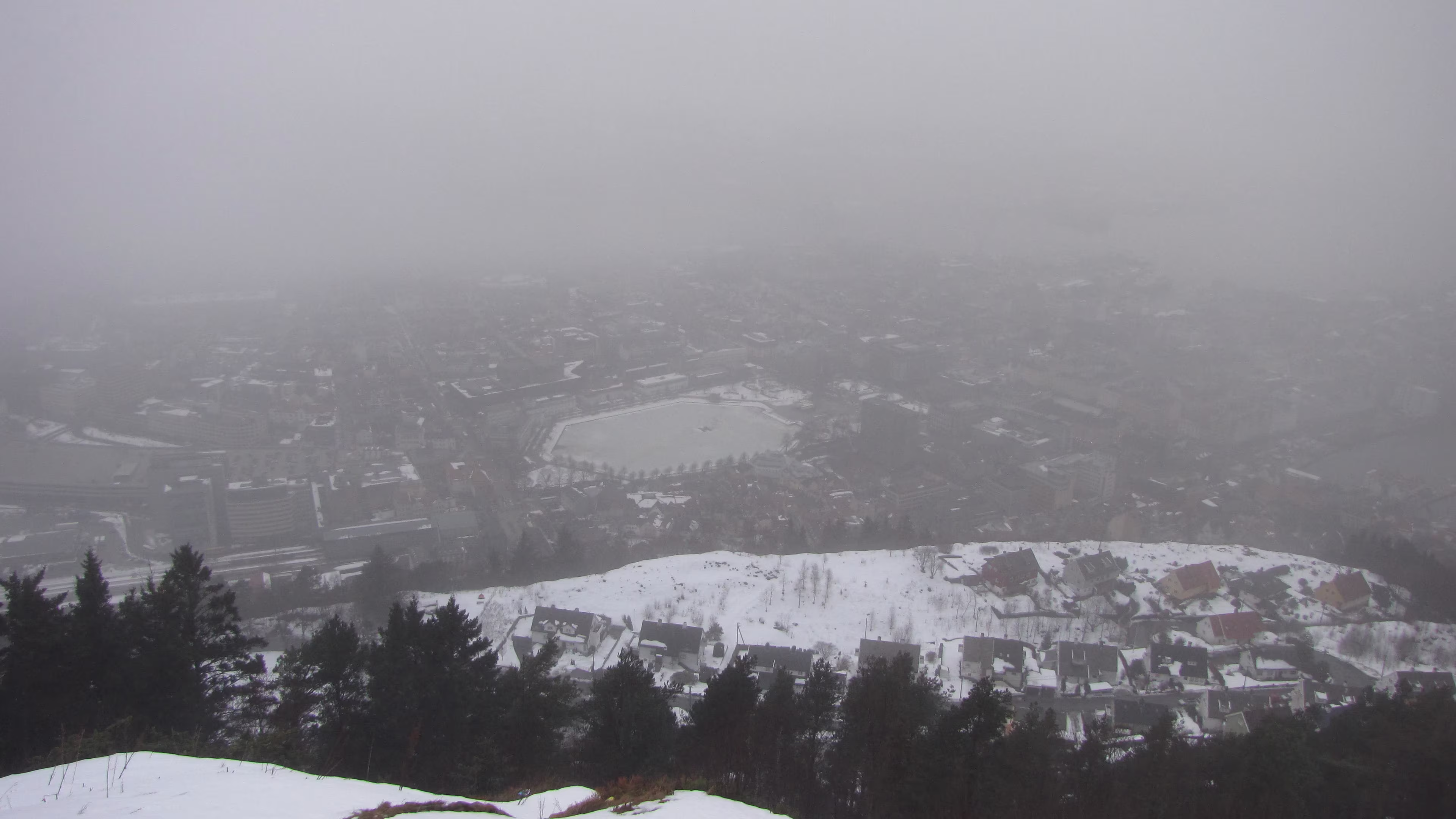 Blick von der Bergstation auf Bergen, soweit etwas zu sehen ist