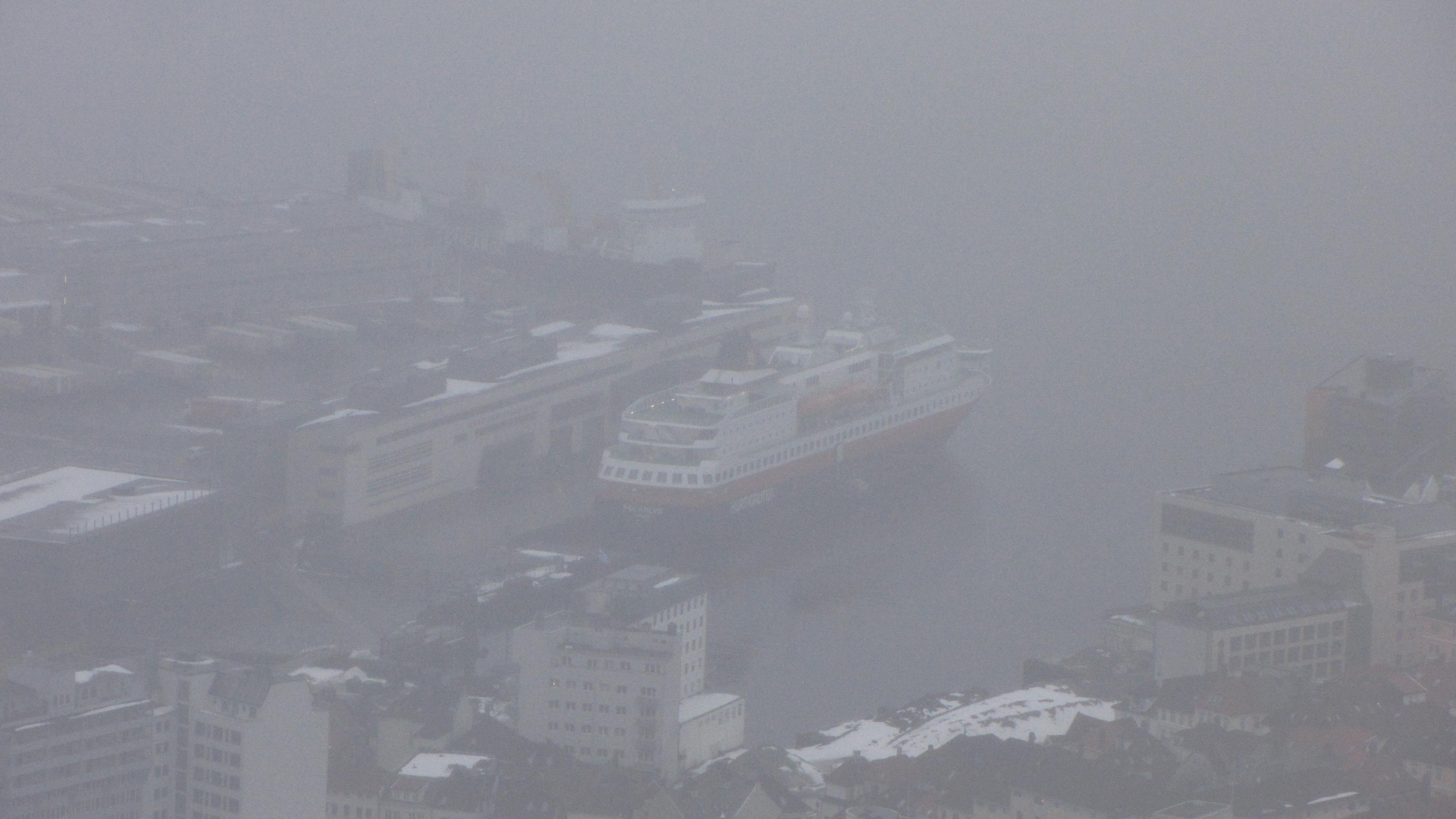 Bergen Das Hurtigruten-Schiff taucht aus dem Dunst auf