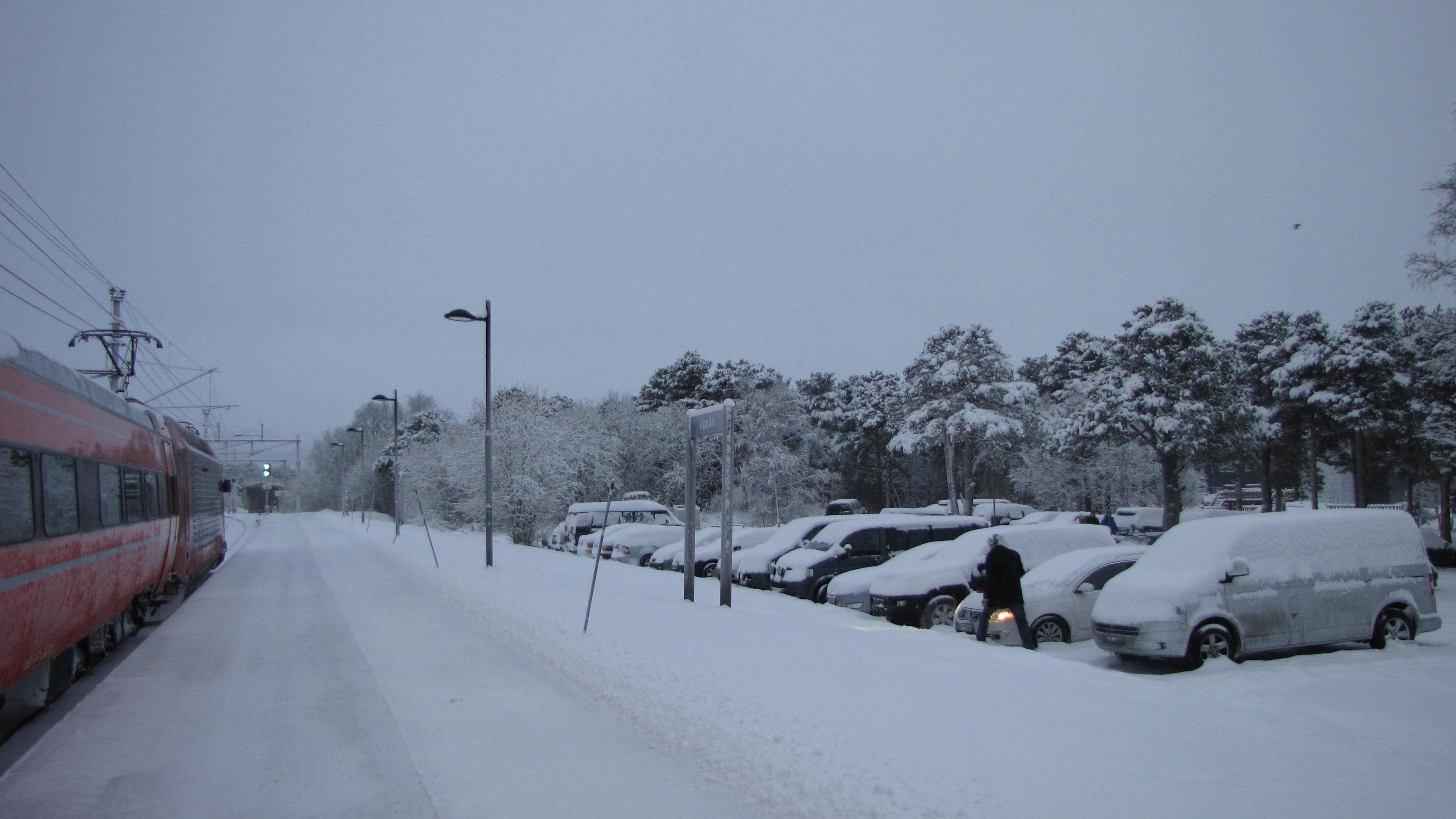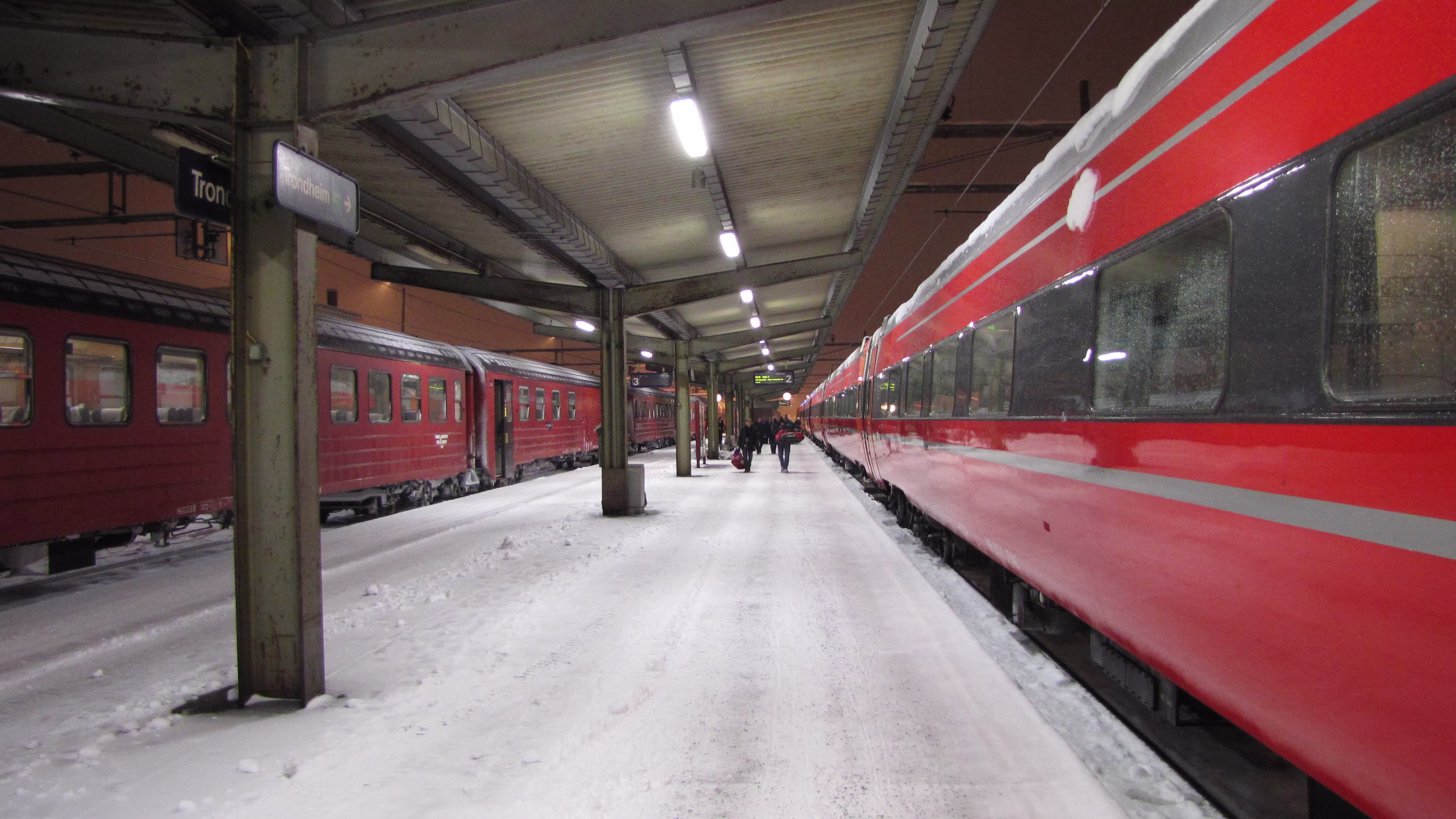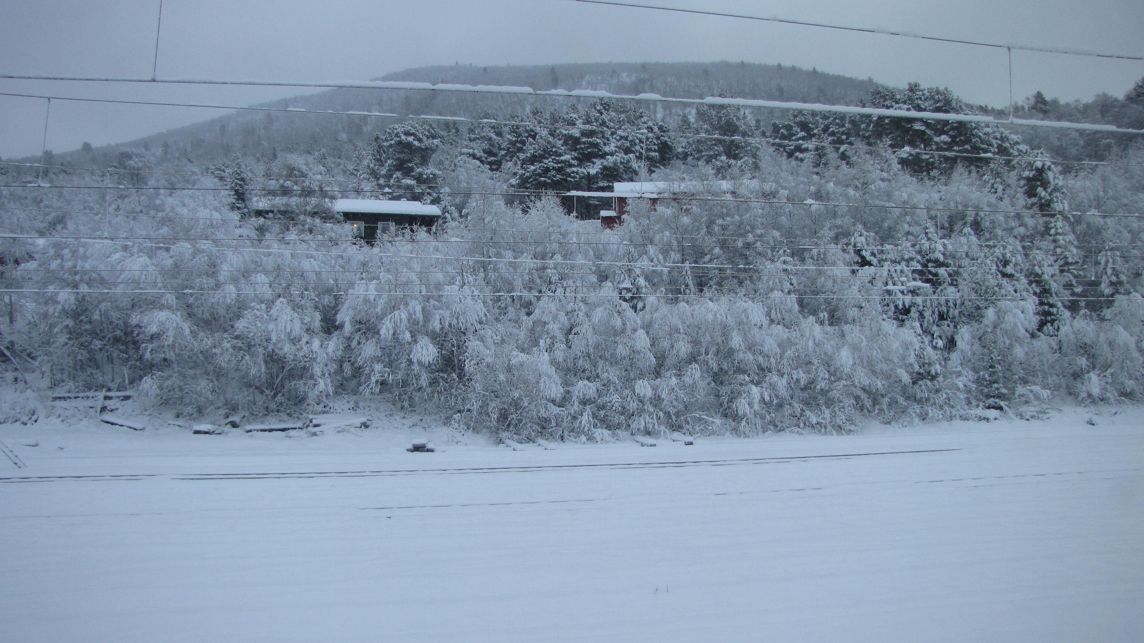 Heftiger Schneefall bei der Ankunft in Trondheim. Die Schneemassen sind gewaltig. Der Wagen von Trondheim nach Oslo war wohl von einer anderen Baureihe und längst nicht so schön wie auf der Fahrt von Oslo nach Trondheim. Aber auch hier gab es im NSB komfort Bereich wieder Zeitungen, Kaffee und Tee gratis, eine feine Sache. Fast alle Sitze des Wagens waren besetzt. Gegen 9 Uhr dämmert es langsam.