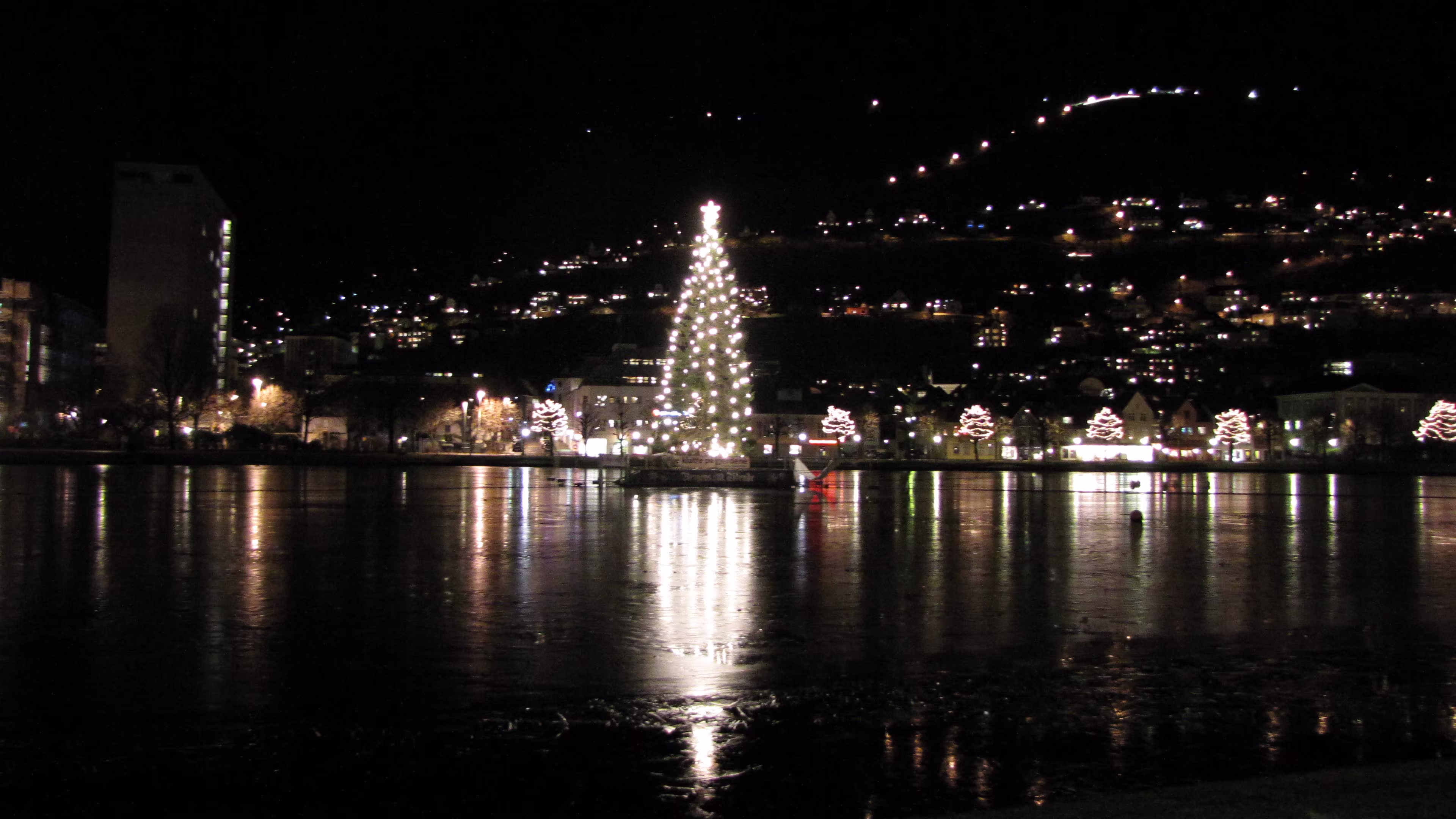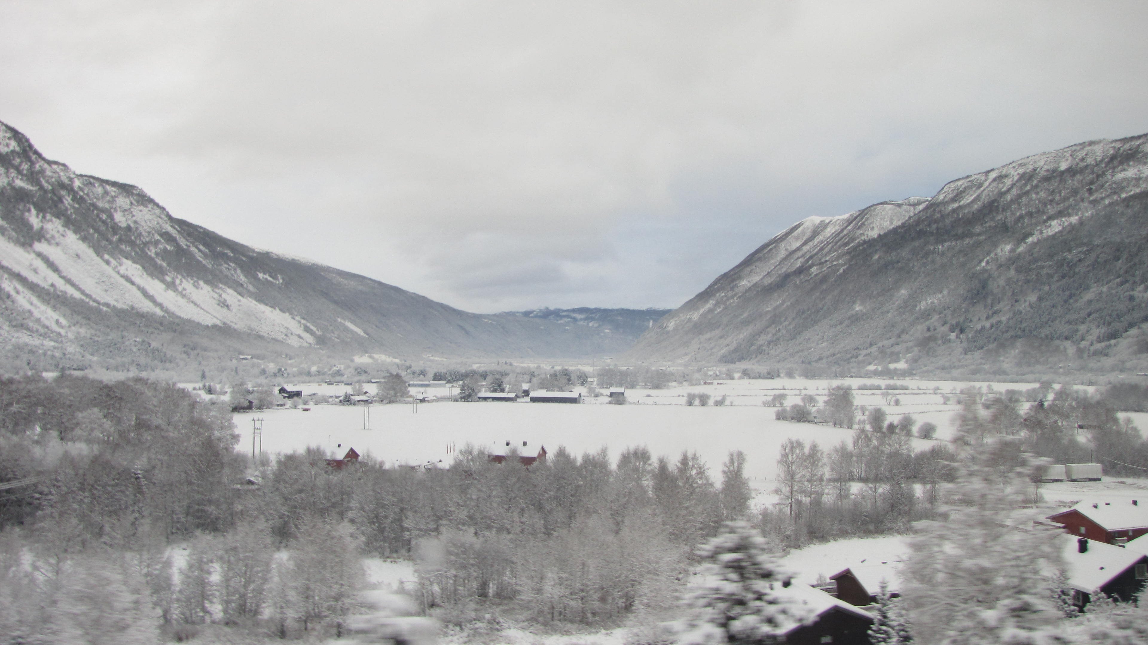 Je näher Bergen rückte und man draußen einen Blick in der Dunkelheit auf die Witterungsverhältnisse erhaschen konnte wurde sichtbar, daß es keinen Krümel Schnee hatte. Noch nicht mal zusammen geschobene Schneereste, einfach gar nichts. Man muss wohl schon damit zufrieden gewesen sein, dass es nicht in Strömen regnete…