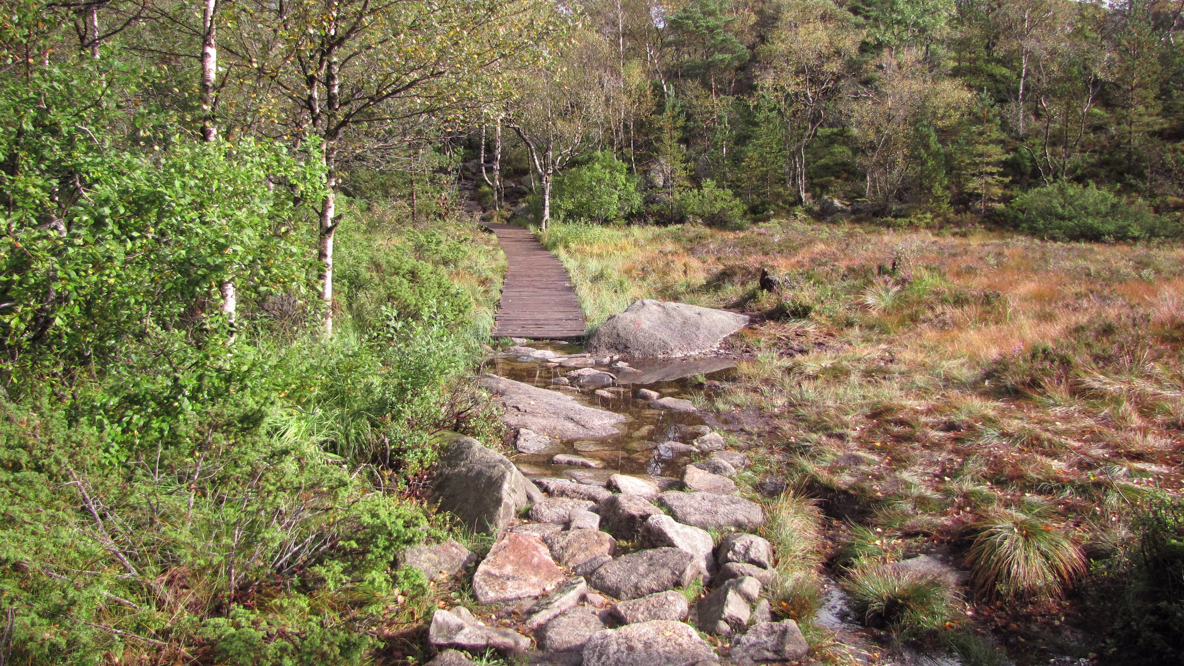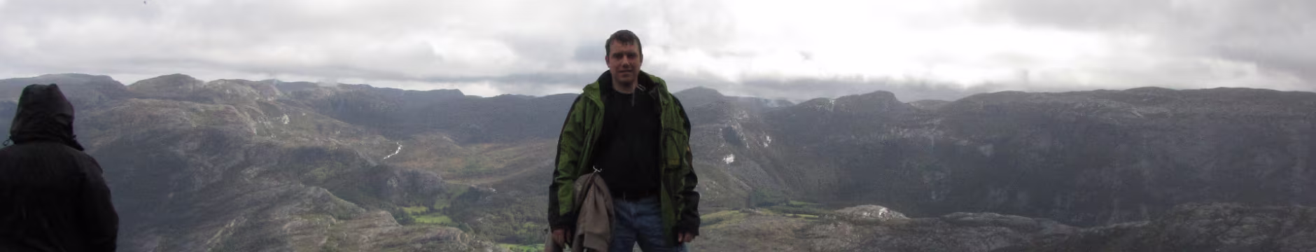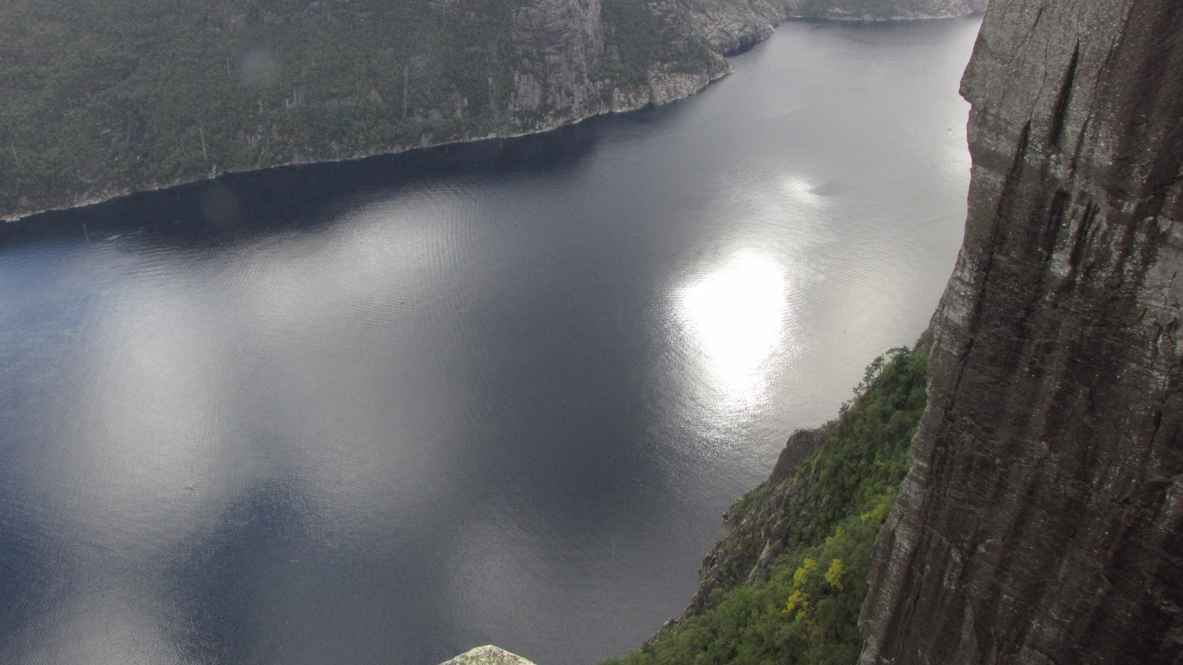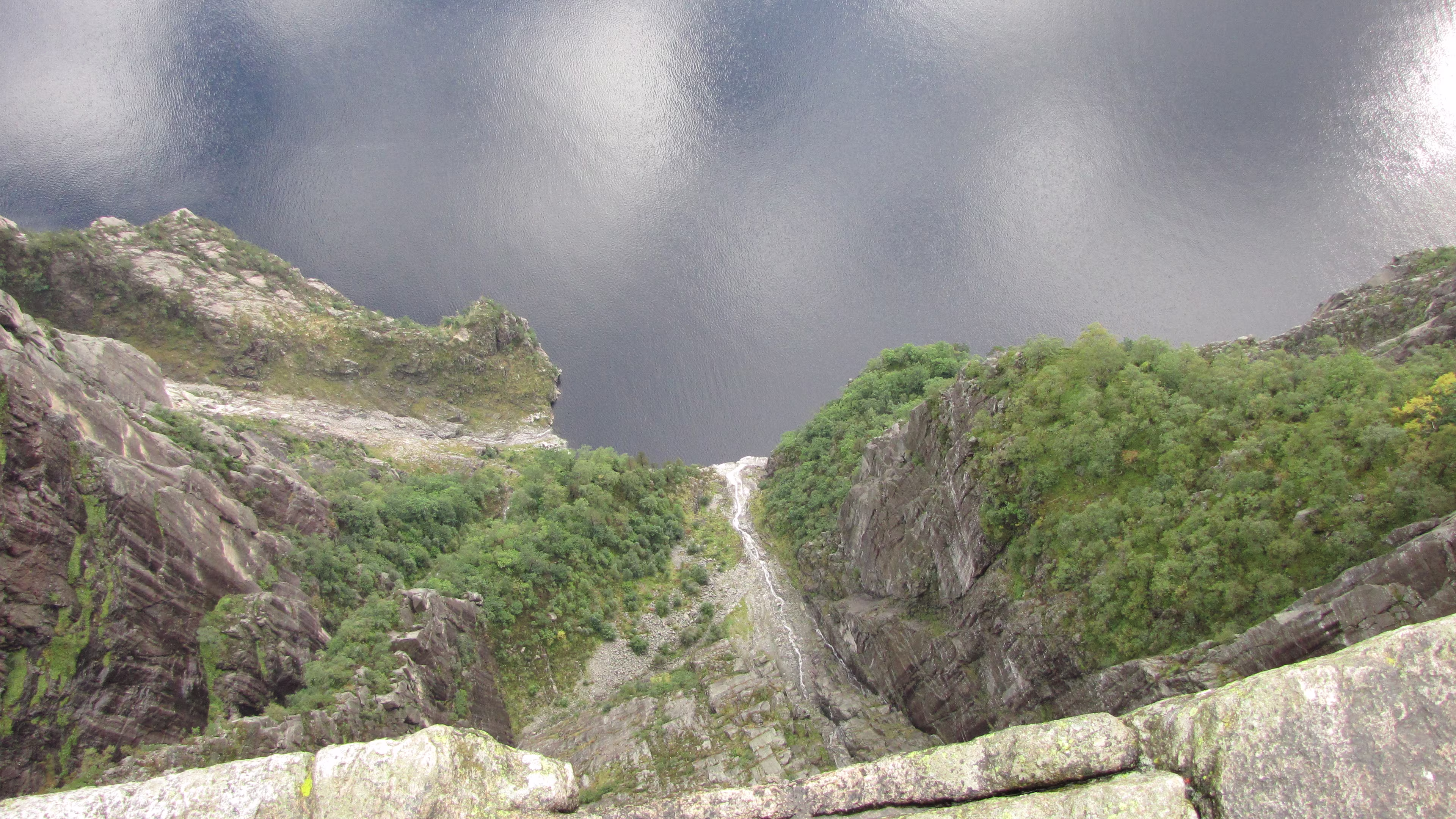 An der Preikestolen fjellstue begann der Aufstieg gegen 11:15, ohne Regen, bei Bewölkung. Nach einer ganzen Weile kam dann der erste Schauer, relativ kurz und leicht, also nicht so tragisch. Aber der Weg hat es in sich. Teilweise gleicht er einem kleinen Bach. Unterwegs tröpfelt es immer mal wieder kurz, nix ernstes. Dann endlich die letzen Meter, es klart auf und die Sonne kommt etwas durch. Einfach grandios. Es ist windstill, man kan sich ohne Probleme bis an die Kante wagen, an der geht es 600 m in die Tiefe, kein Geländer, keine Sicherung, nichts. Einige sitzen mit baumelnden Beinen auf der Felskante. 😎