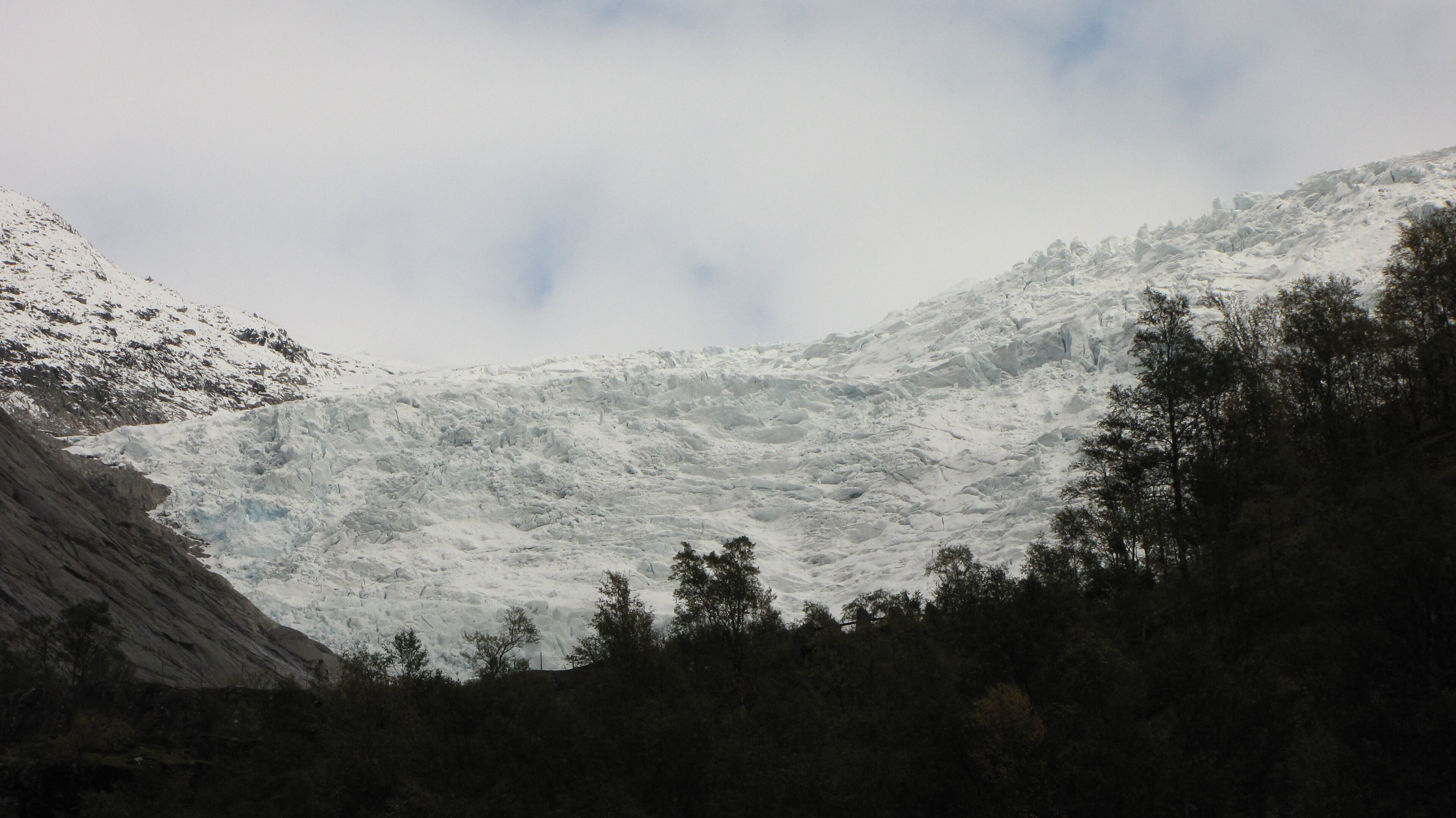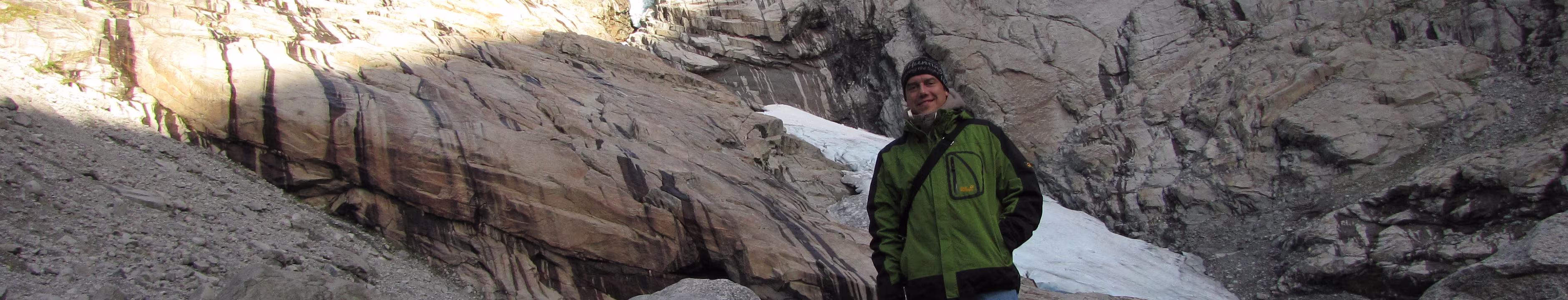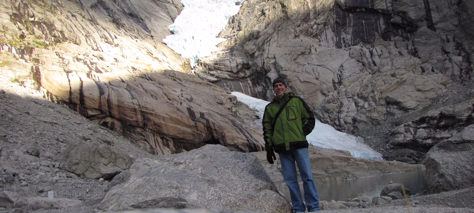 Aber, vielleicht war die ganze Aktion auch für was gut. Denn, beim Abmarsch von der Briksdalsbre Fjellstove (ich war der einzige Übernachtungsgast 😎) war der Himmel noch ziemlich bewölkt, bei der Ankunft am Gletscher wurde der Himmel aber immer blauer, einfach grandios. Dummerweise habe ich den GPS-Logger im Auto liegen lassen, die Bilder haben also nicht die korrekten Koordinaten [Nachtrag, habe die GPS-Daten noch per Hand nachgetragen]. Die Berge am Gletscher scheinen bis in den Himmel zu ragen, fast senkrecht geht es steil nach oben. Irgenwann haben sich dann alle Wolken verzogen, blauer Himmel und die Sonne fällt direkt auf den Gletscher, welch ein Anlick. Handschuhe und Mütze waren übrigens wohl gelitten 😎.