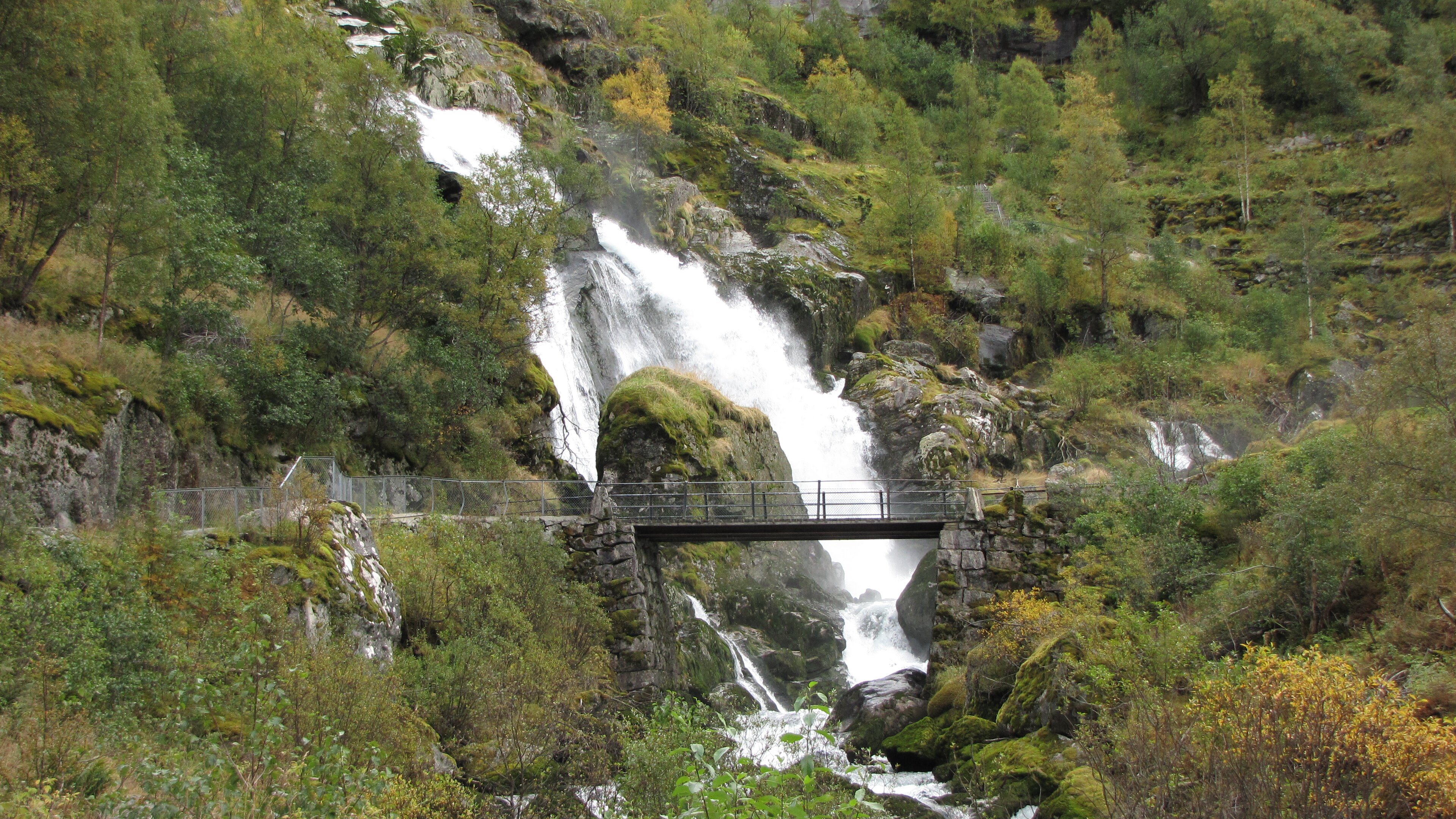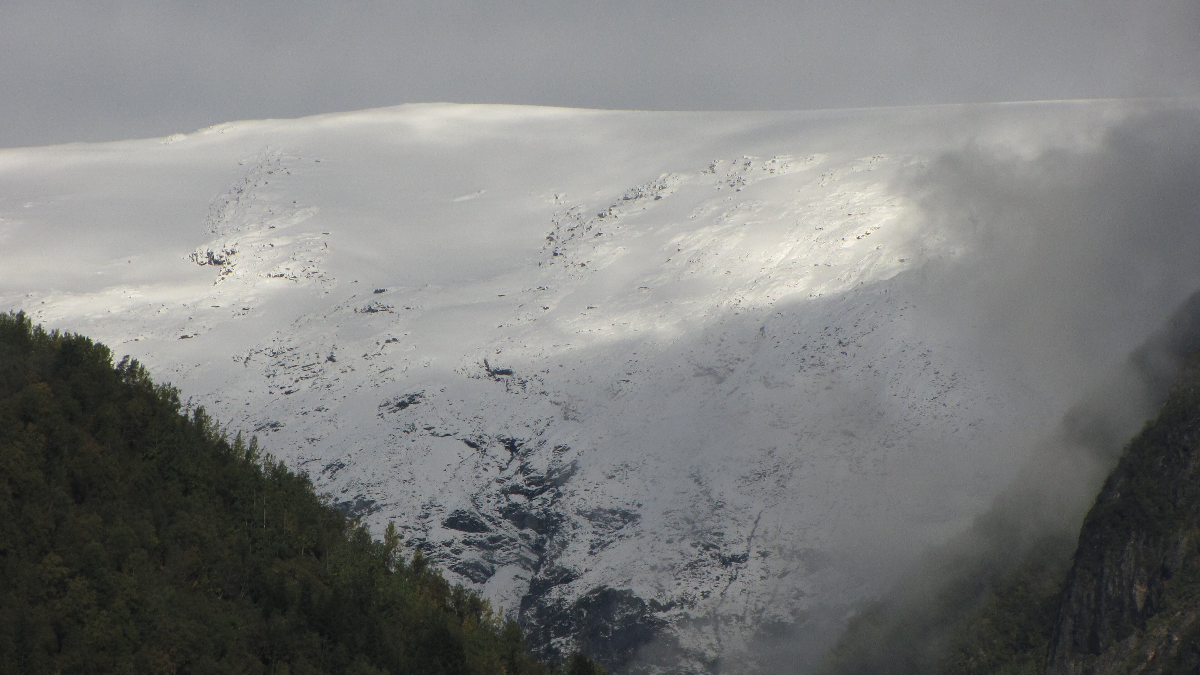 Das Wetter bei der Abfahrt in Flåm schon mal nicht ganz so schlecht, bewölkt zwar, aber kein strömender Regen.