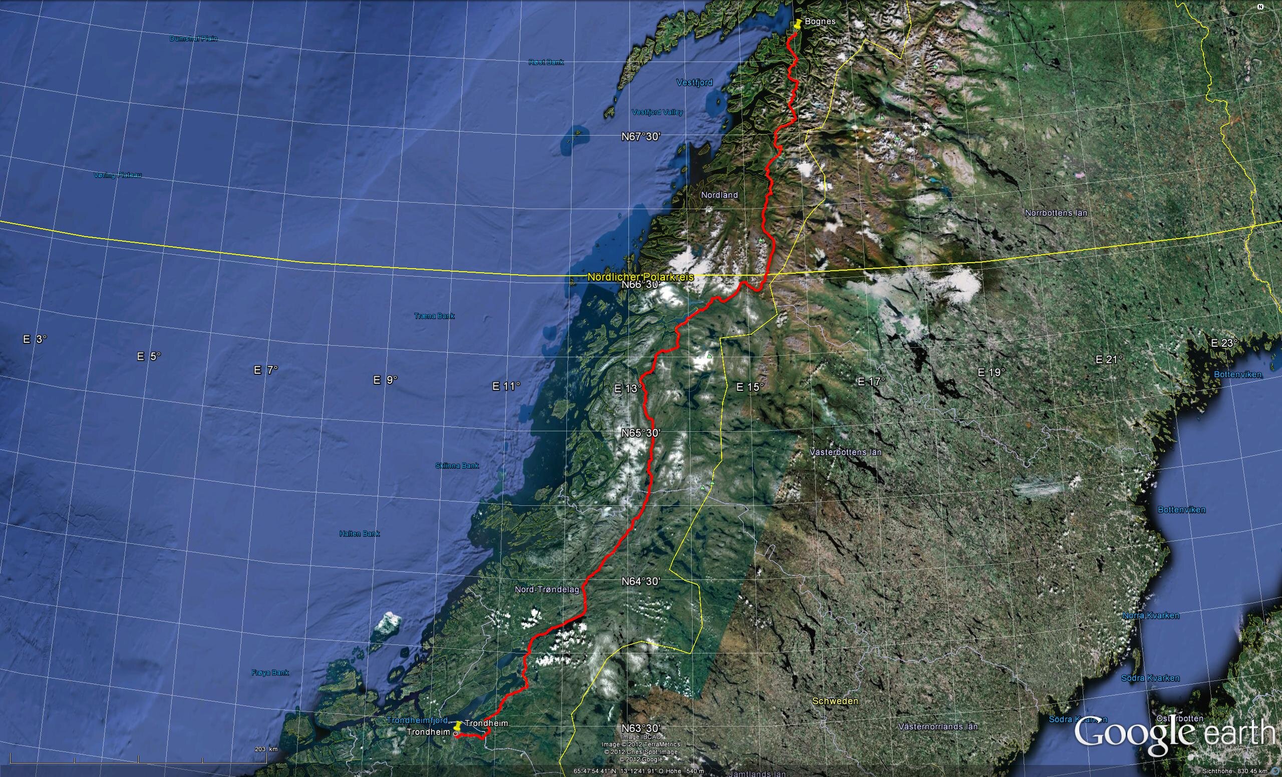Lange Tour heute, gut 800 km von Trondheim bis kurz vor Bognes, dort setze ich morgen mit der Fähre über nach Skaberget. Fast der gesamte Sonntag-Vormittag war wie ausgestorben auf den Straßen, absolut nichts los.