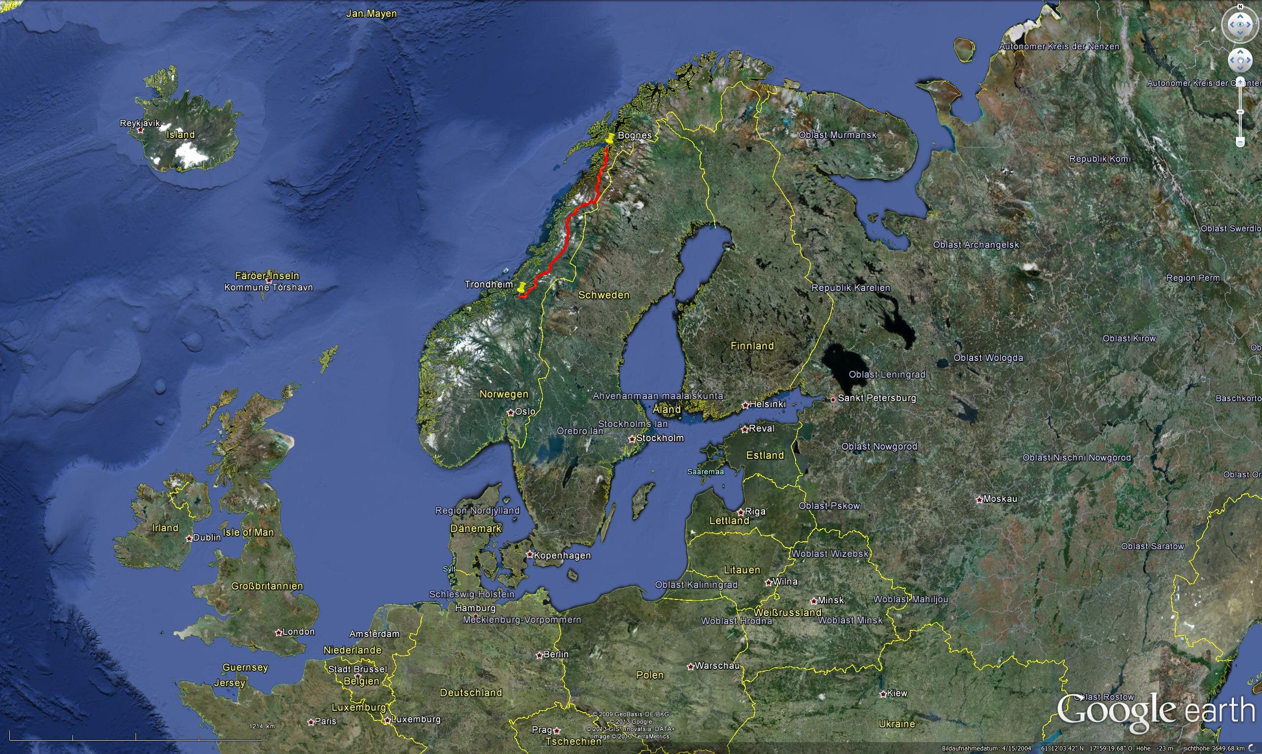 Montag/Dienstag, Gesamtstrecke 509 km, Fahrzeit incl. Pausen und Hurtigrute 24:17 h