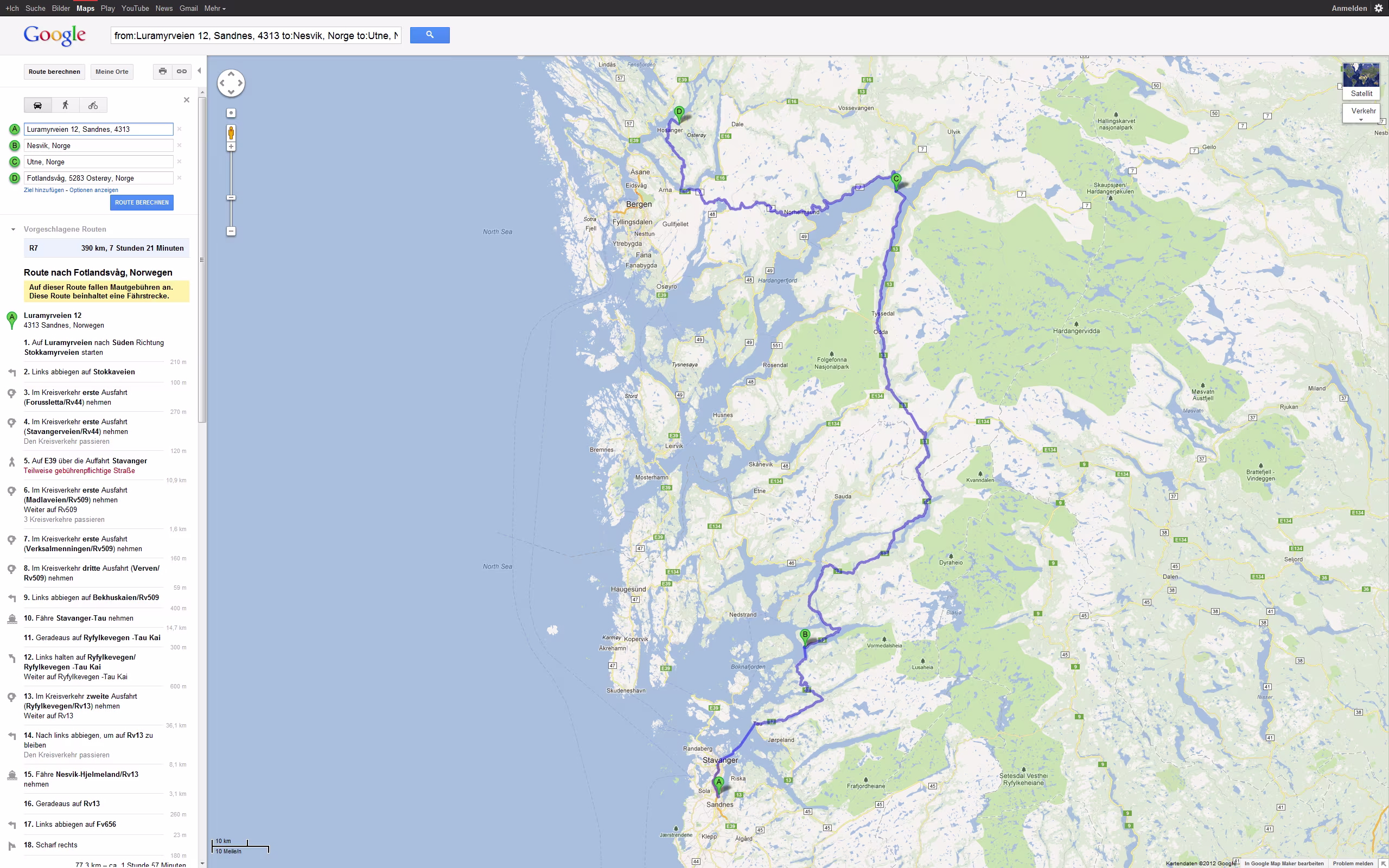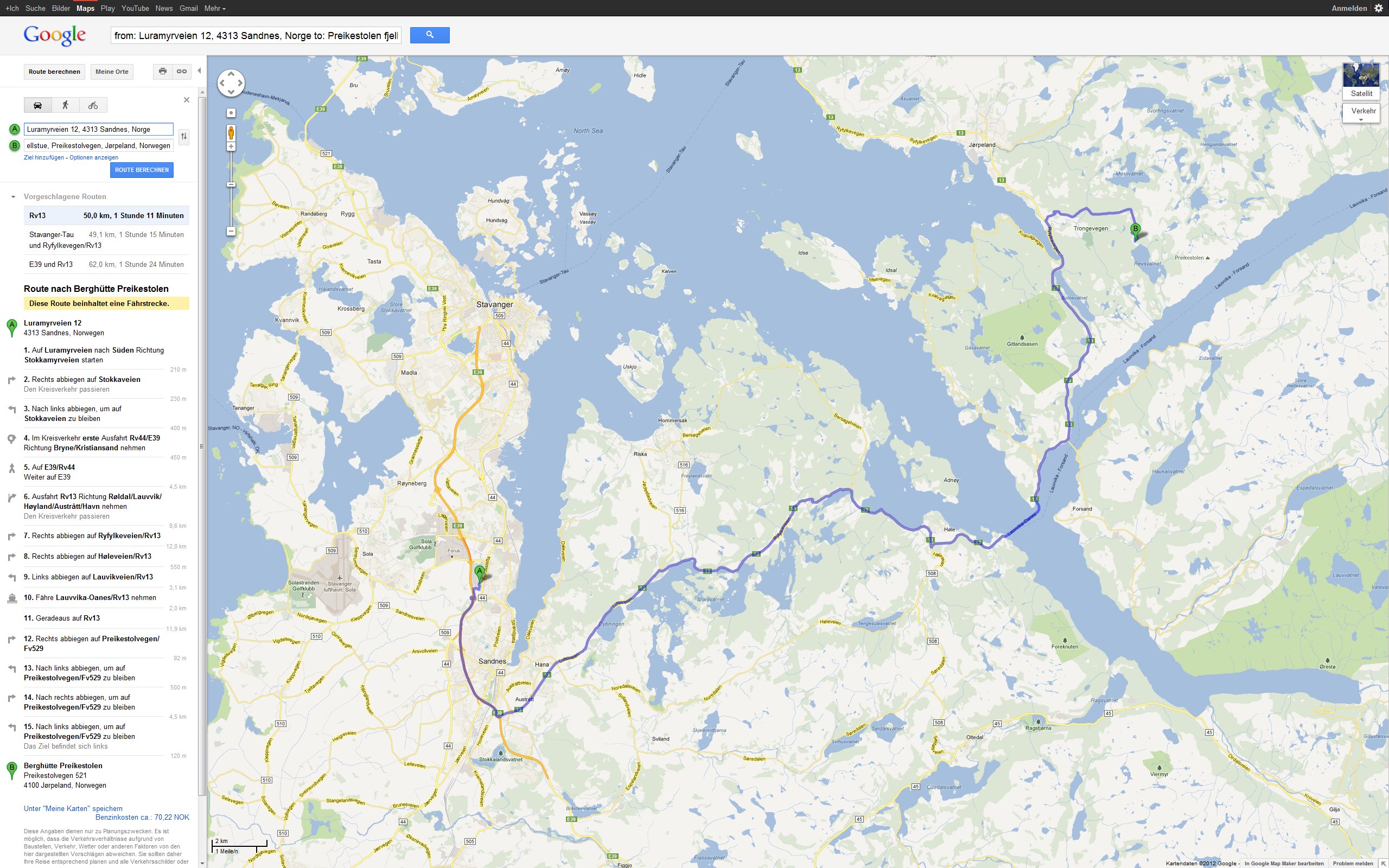 Tour Planung 04 - Luramyrveien 12, 4313 Sandnes, Norwegen nach Berghütte Preikestolen - Google Maps - Opera Di 18.09.2012 – Sandnes - Preikestolen Größere Kartenansicht