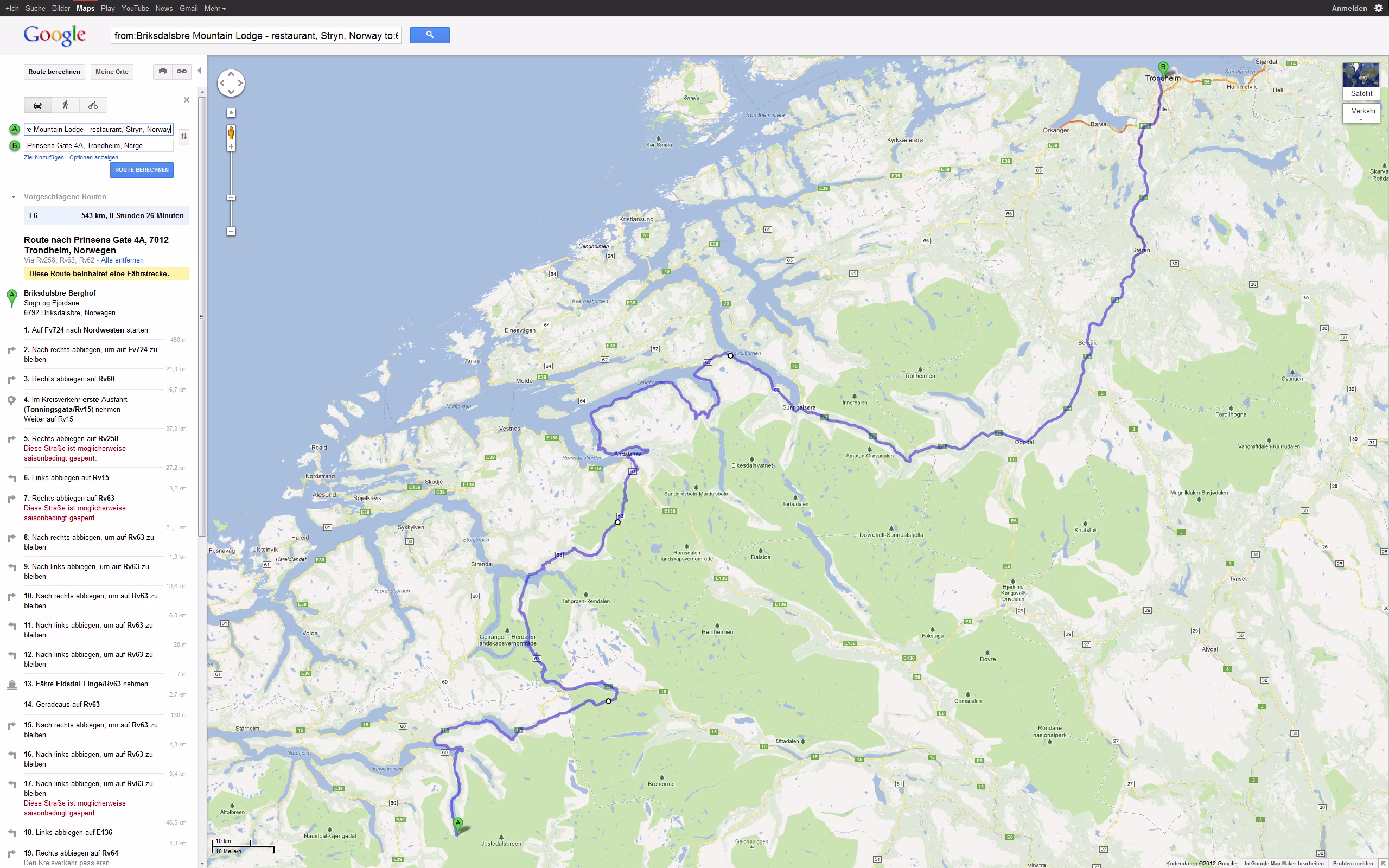 Tour Planung 09 - Briksdalsbre Berghof nach Prinsens Gate 4A, 7012 Trondheim, Norwegen - Google Maps - Opera Sa 22.09.2012 – Briksdalsbre - Trondheim Größere Kartenansicht