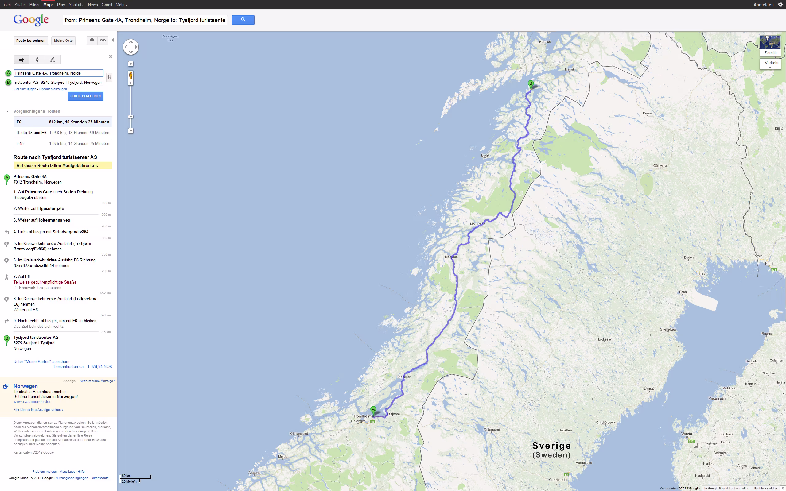 Tour Planung 10 - Prinsens Gate 4A, 7012 Trondheim, Norwegen nach Tysfjord turistsenter AS - Google Maps - Opera So 23.09.2012 – Trondheim - Storjord Größere Kartenansicht