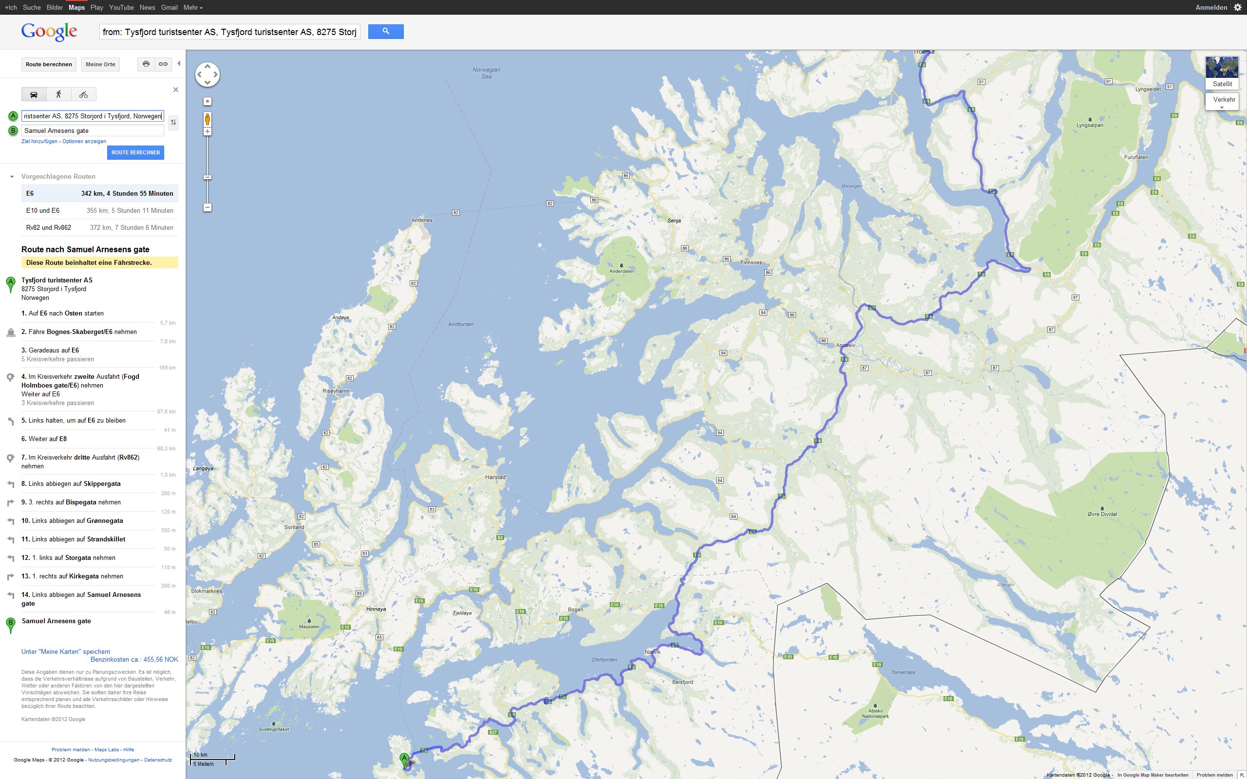 Tour Planung 11 - Tysfjord turistsenter AS nach Samuel Arnesens gate - Google Maps - Opera Mo 24.09.2012 – Storjord - Tromsø Größere Kartenansicht