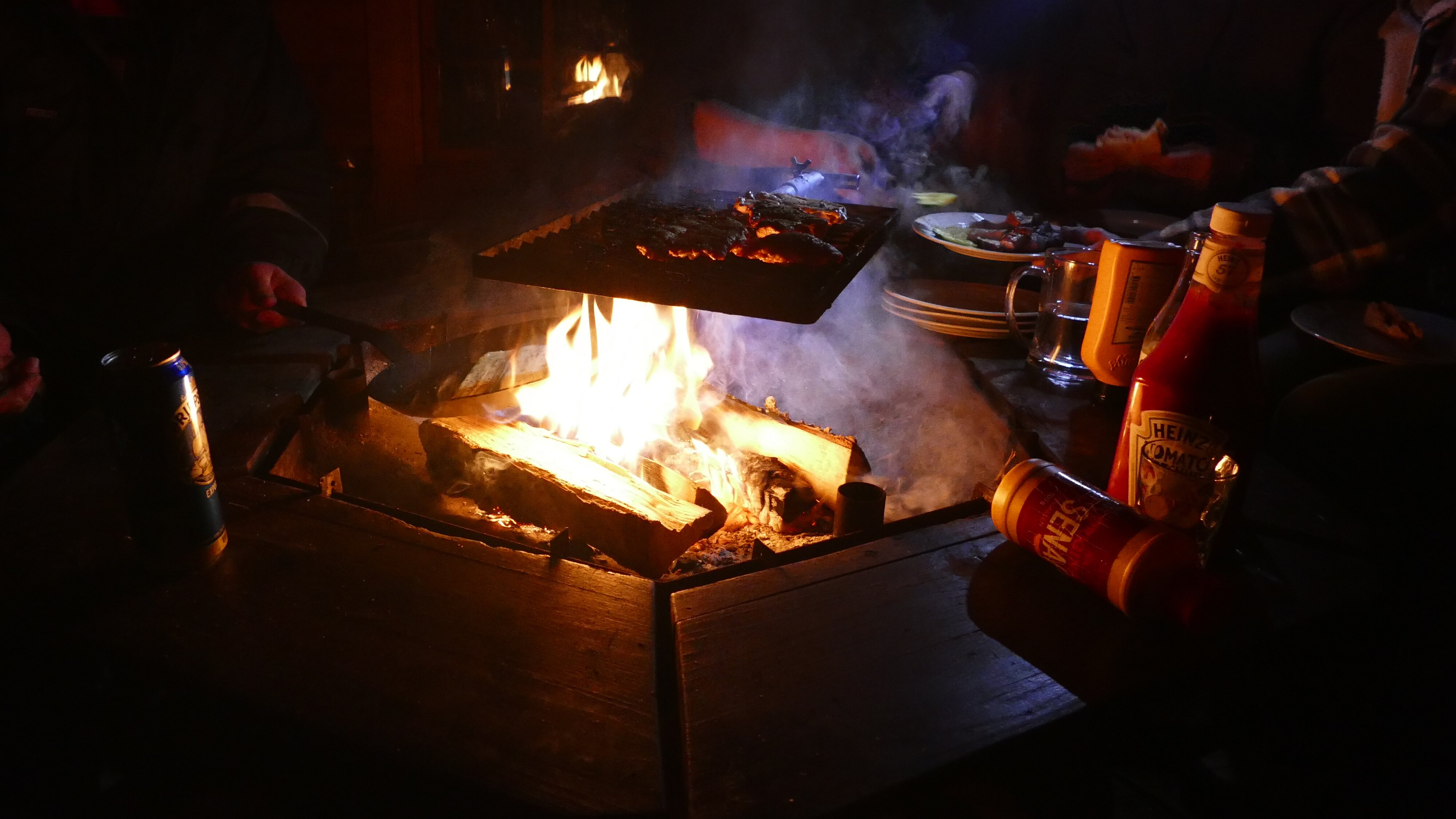Das Abendessen wurde in einem kleinen Kotten geboten. Darin brannte ein schönes offenes Feuer und es gab gegrilltes Fleisch, gegrillte Zucchini und geröstetes Brot. Bei einer angenehmen Unterhaltung verflog die Zeit wie im Flug. Das zweite Standbein neben dem Hotel sind Touren mit dem Schnee Scooter. Die Gastgeber erzählten von der Grube in Malmberget, sie haben sie besucht, was jederzeit, sogar für Einzelpersonen möglich sei. Alles dort sei (mindestens) eine Nummer größer als man es vielleicht bisher schon gesehen hat. Speziell die ganzen Maschinen seien gigantisch.