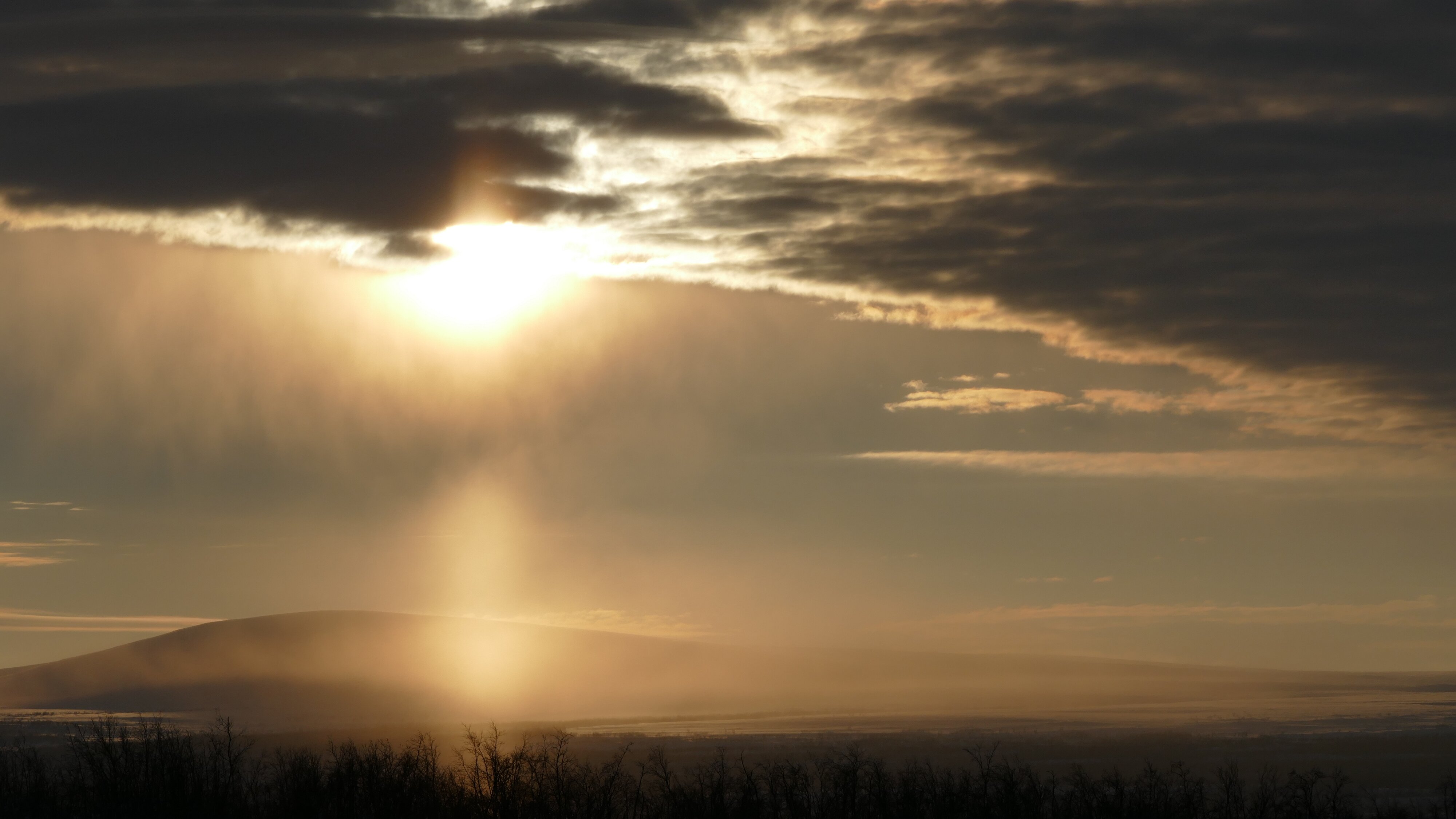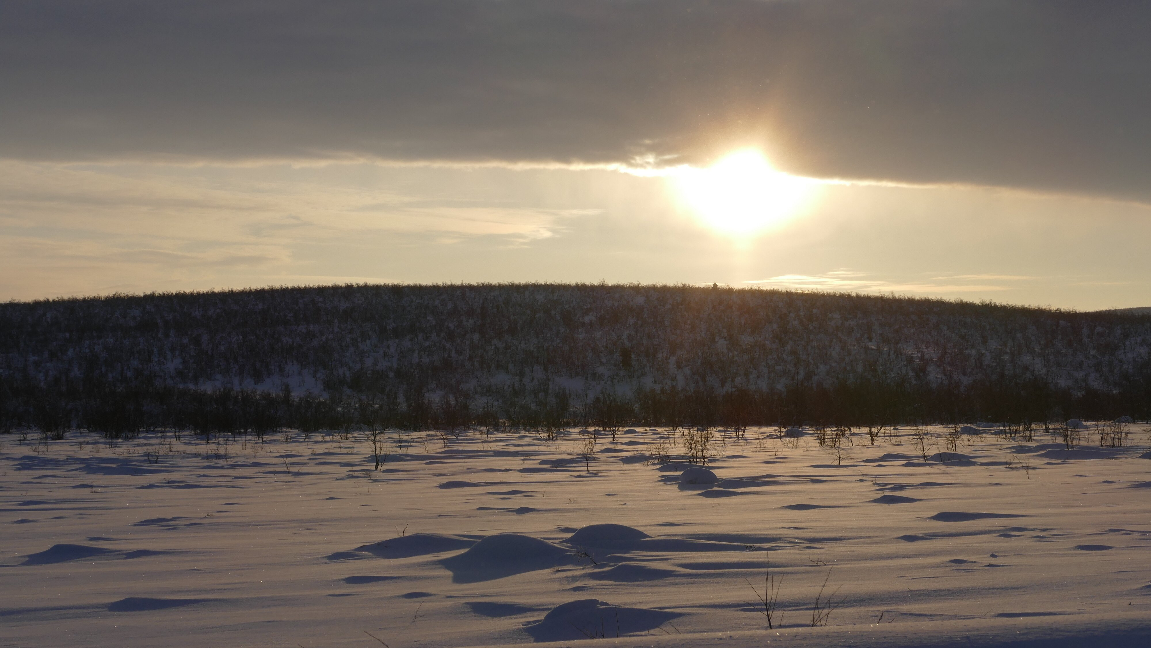 Abfahrt Koskullskulle um 08:30, das Thermometer am Skogshotell zeigte -16 °C, das Auto war leicht beschneit, aber es schneite nicht mehr. Sehr wenig Verkehr auf der Straße in Richtung Suomi. Je näher die Grenze zu Suomi rückte desto offener wurde das Gelände, man konnte sogar richtige kleine Berge ausmachen. Nach kurzer Fahrt in Suomi kam dann plötzlich die Sonne zum Vorschein, mit ganz irren Effekten, nämlich links und rechts der Sonne waren zwei weitere helle Lichter zu sehen. Keine Ahnung wie sich dieses Phänomen nennt [Anmerkung später: es sind Nebensonnen (norsk: Bisol; english: sun dogs)], aber es war einfach grandios anzusehen. Und da sehr wenig Verkehr herrschte war es auch kein Problem auch mal mitten auf der Strecke einfach rechts anzuhalten, zum Foto-Shooting. Das Thermometer war zwischenzeitlich auf -18 °C gefallen, ohne Jacke, nur mit Schal und Handschuhen wurde es schon nach wenigen Minuten verdammt frisch um die Nase. 😎