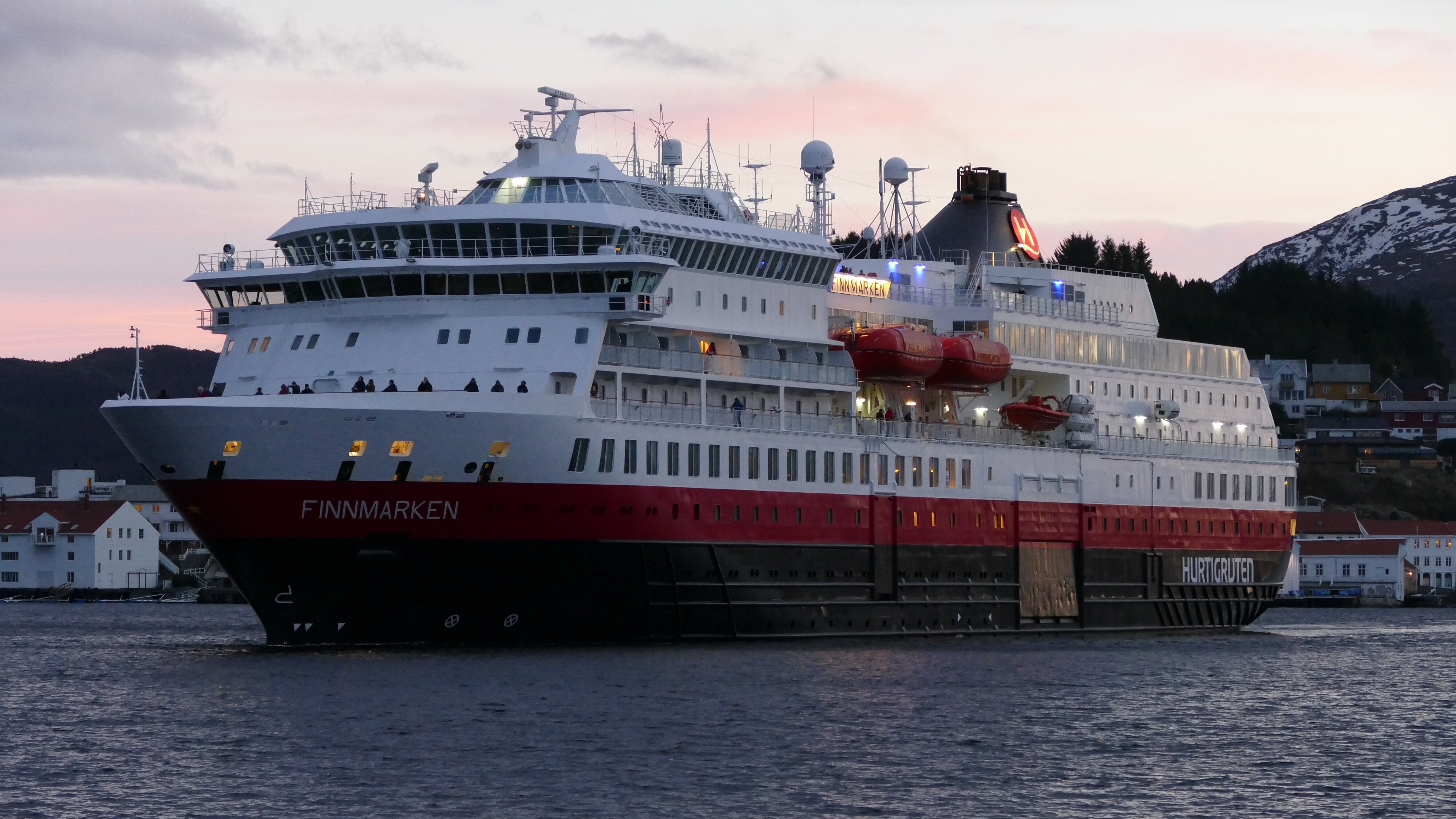 Um kurz nach 17 Uhr dröhnte dann ein Schiffshorn und wenige Minuten später bog dann die MS Finnmarken um die Ecke. Woher die Verspätung rührte war mir dann da schon wieder egal, ob ich morgen nun 1-2 Stunden später in Bergen ankomme spielt keine Rolle. Von dort bis zum Hotel sind es nur ca. 80 km.