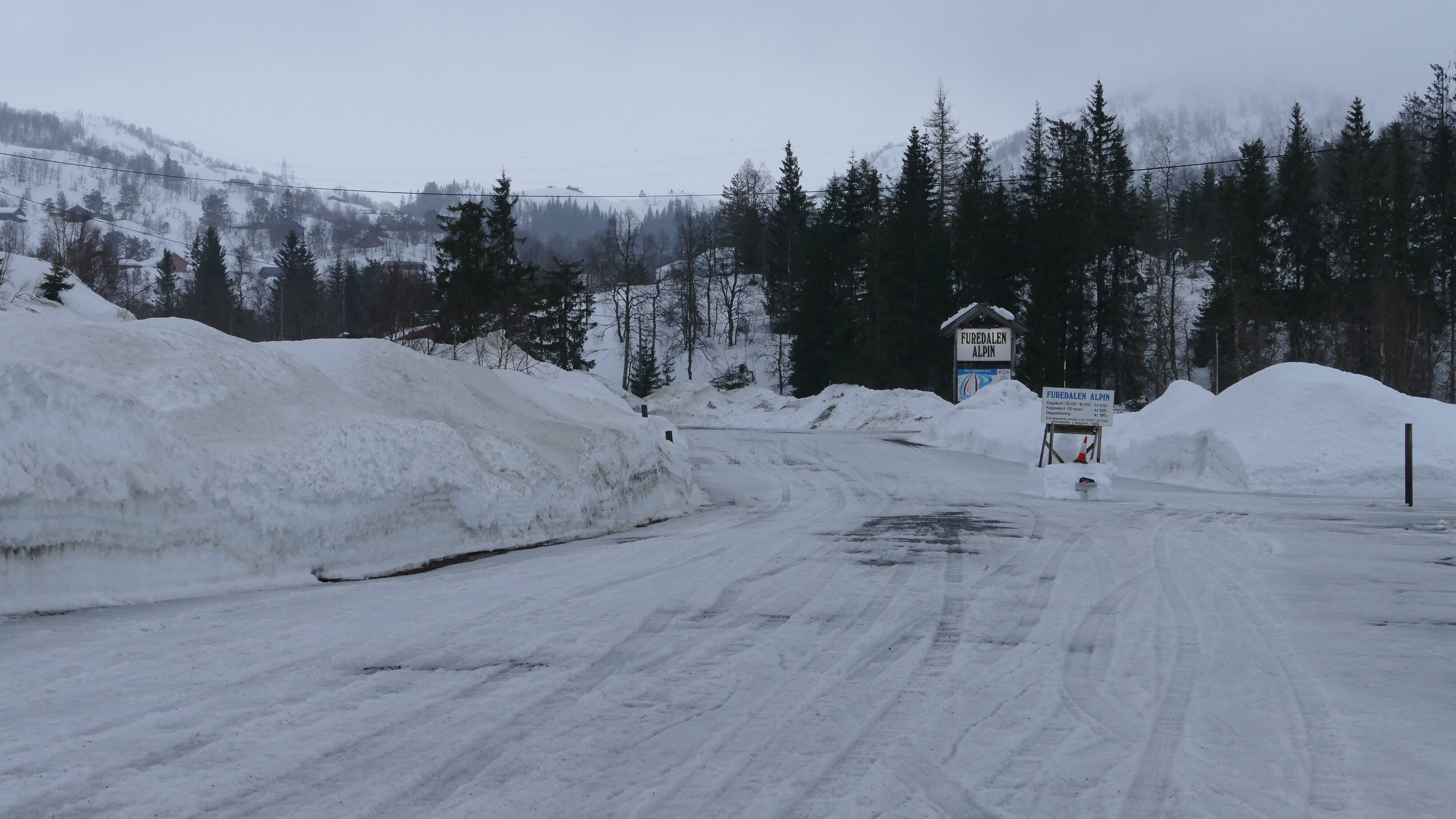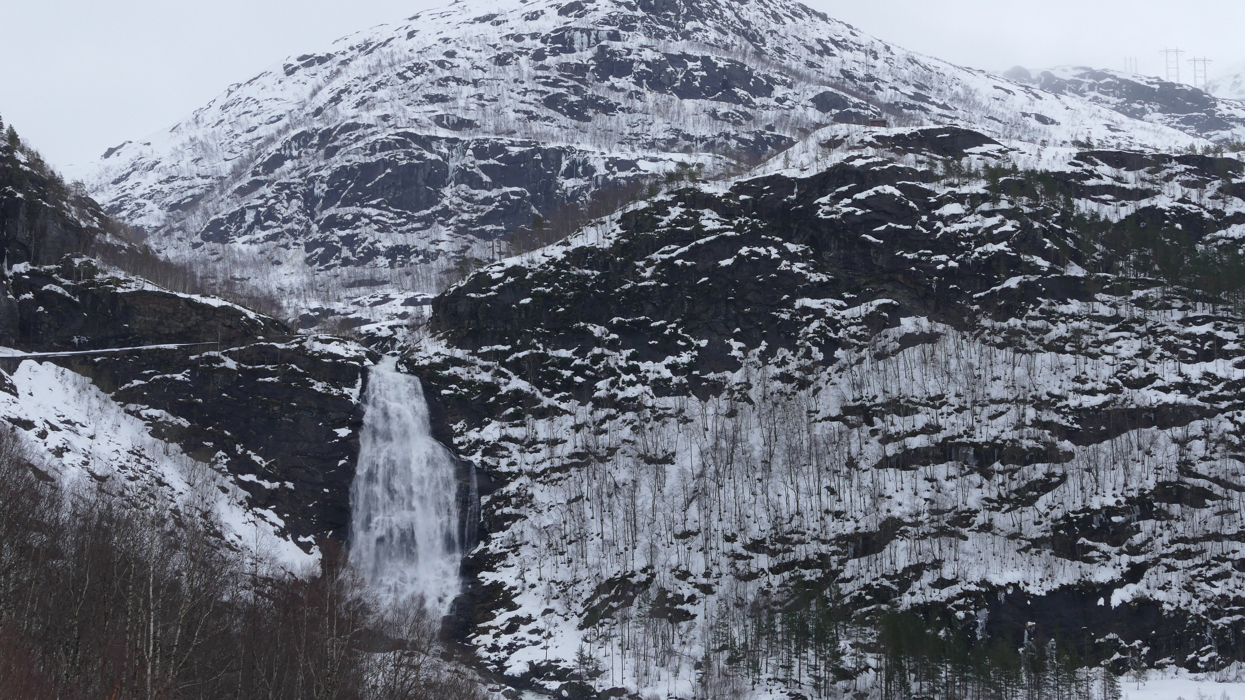 Unterwegs fuhr ich die [7], ab dem Abzweig Rinsnestunnelen [E16], entlang. Sie steigt lediglich auf ca. 450 m an, aber was da noch für Schneemassen am Rand der Straße lagen, bei +2 °C, absolut irre. Im Internet lese ich, dass im Tal 250 cm Schnee liegen und auf den Bergen (bis 920 m) sind es 270 cm Schnee. Als ich in Bergen vom Schiff fuhr hätte ich mir nicht träumen lassen, heute noch mal so viel Schnee zu sehen.