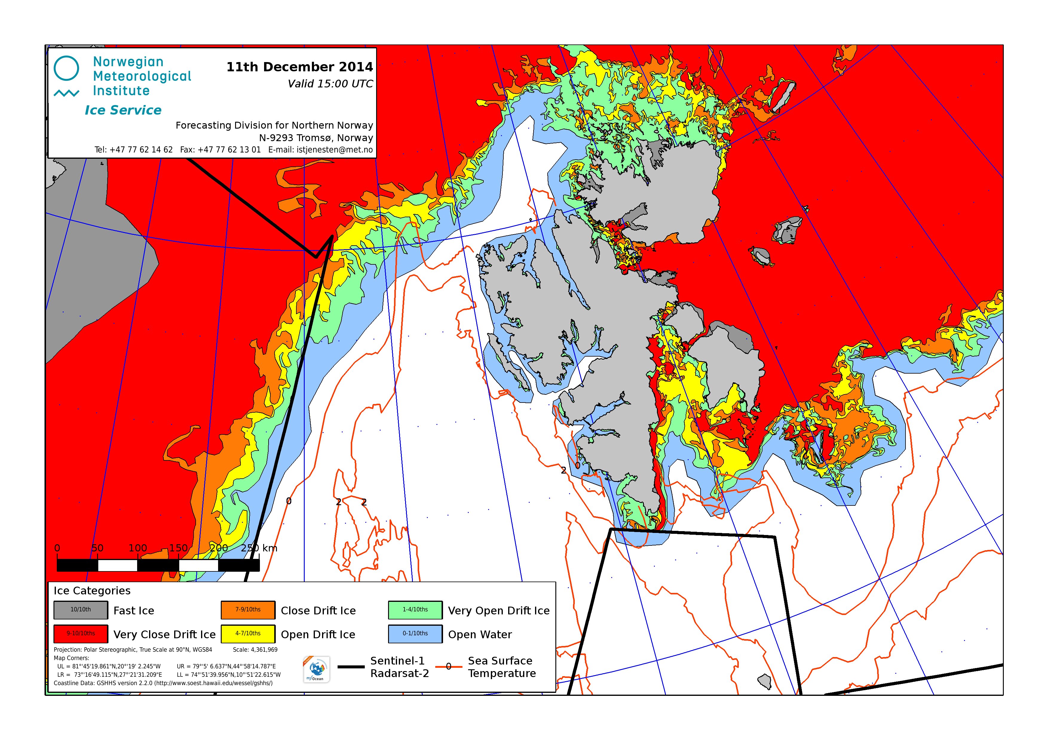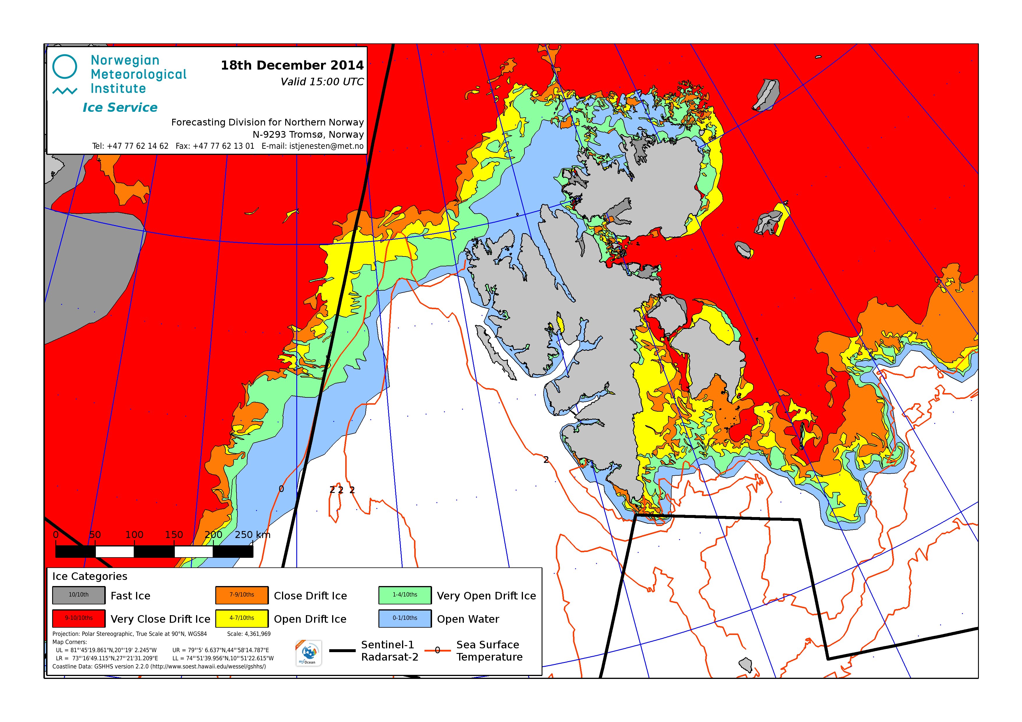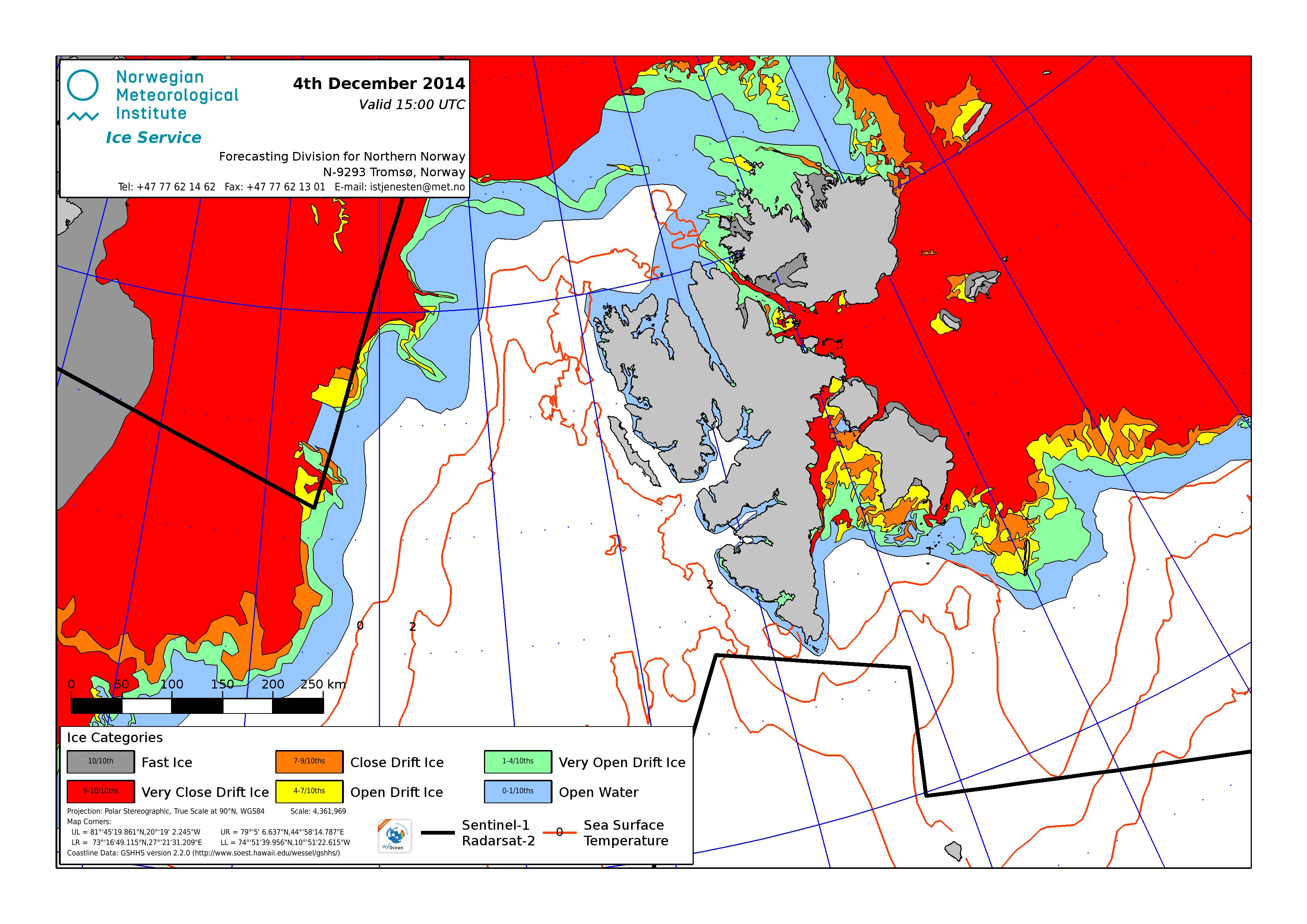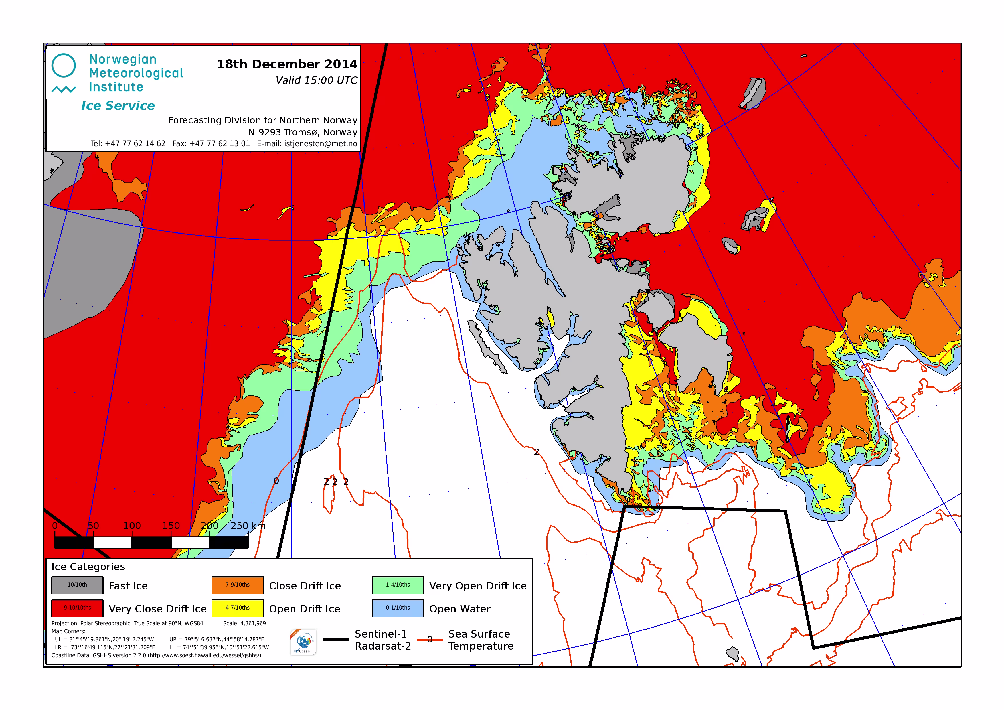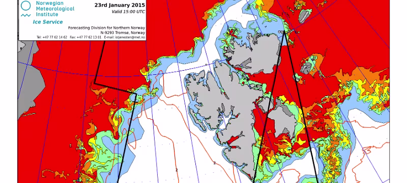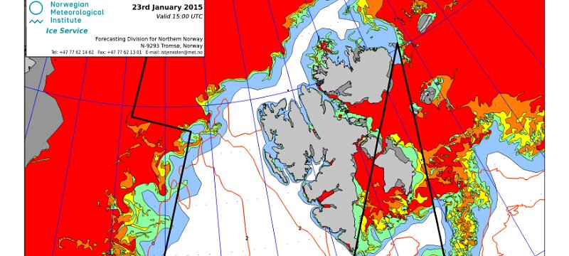 Hier werden immer die gerade aktuell gültigen Eiskarten angezeigt. Üblicherweise werden die Karten so gegen 16 Uhr aktualisiert. Allerdings nur an Werktagen, nicht am Wochenende oder (norwegischen) Feiertagen. Die Originaldaten hole ich mir von einem FTP-Server ftp.met.no, dort liegen die gewünschten Karten unterhalb von /projects/icecharts.