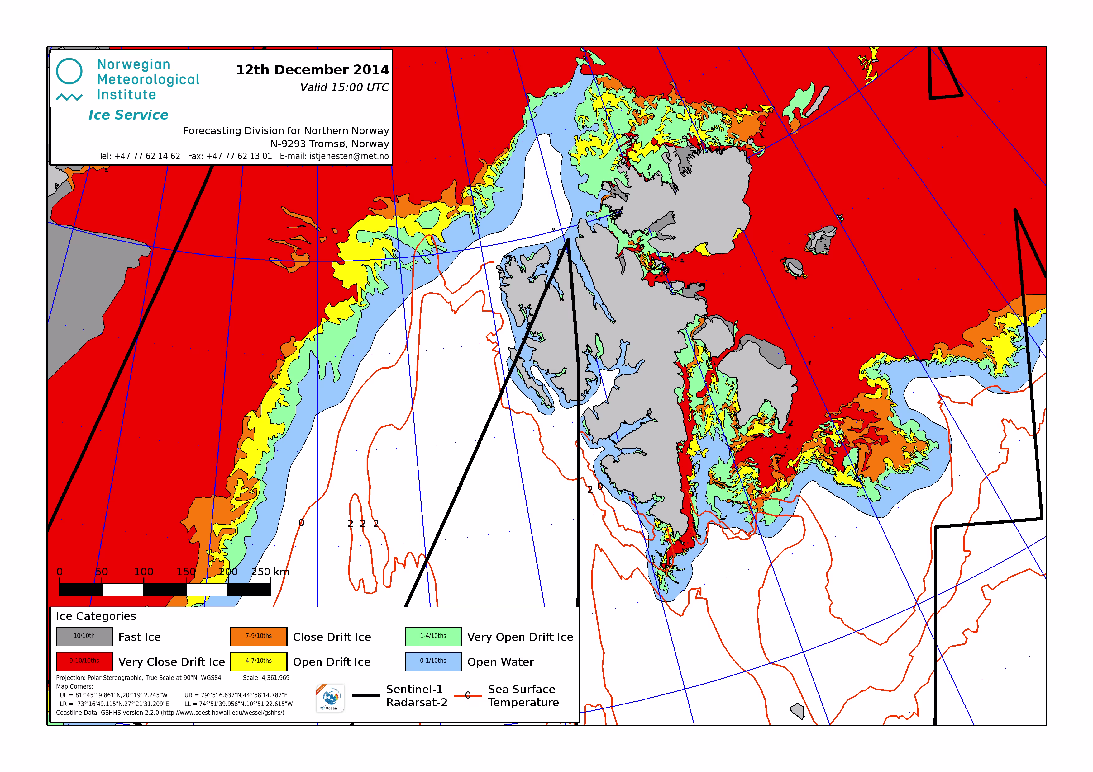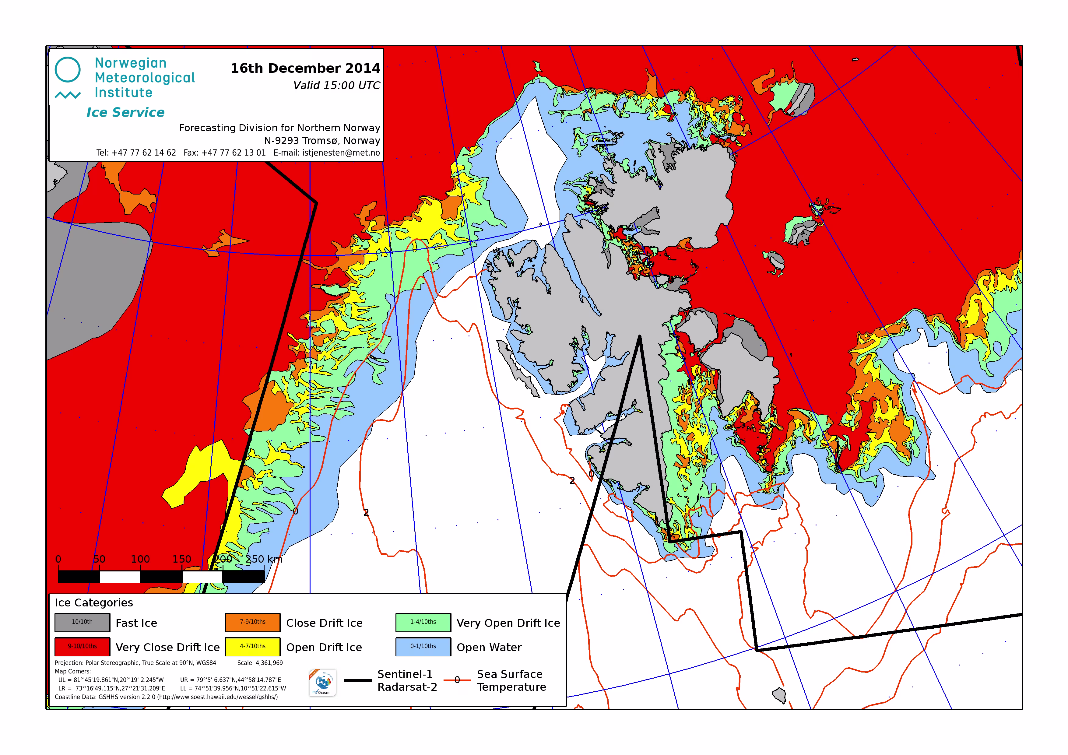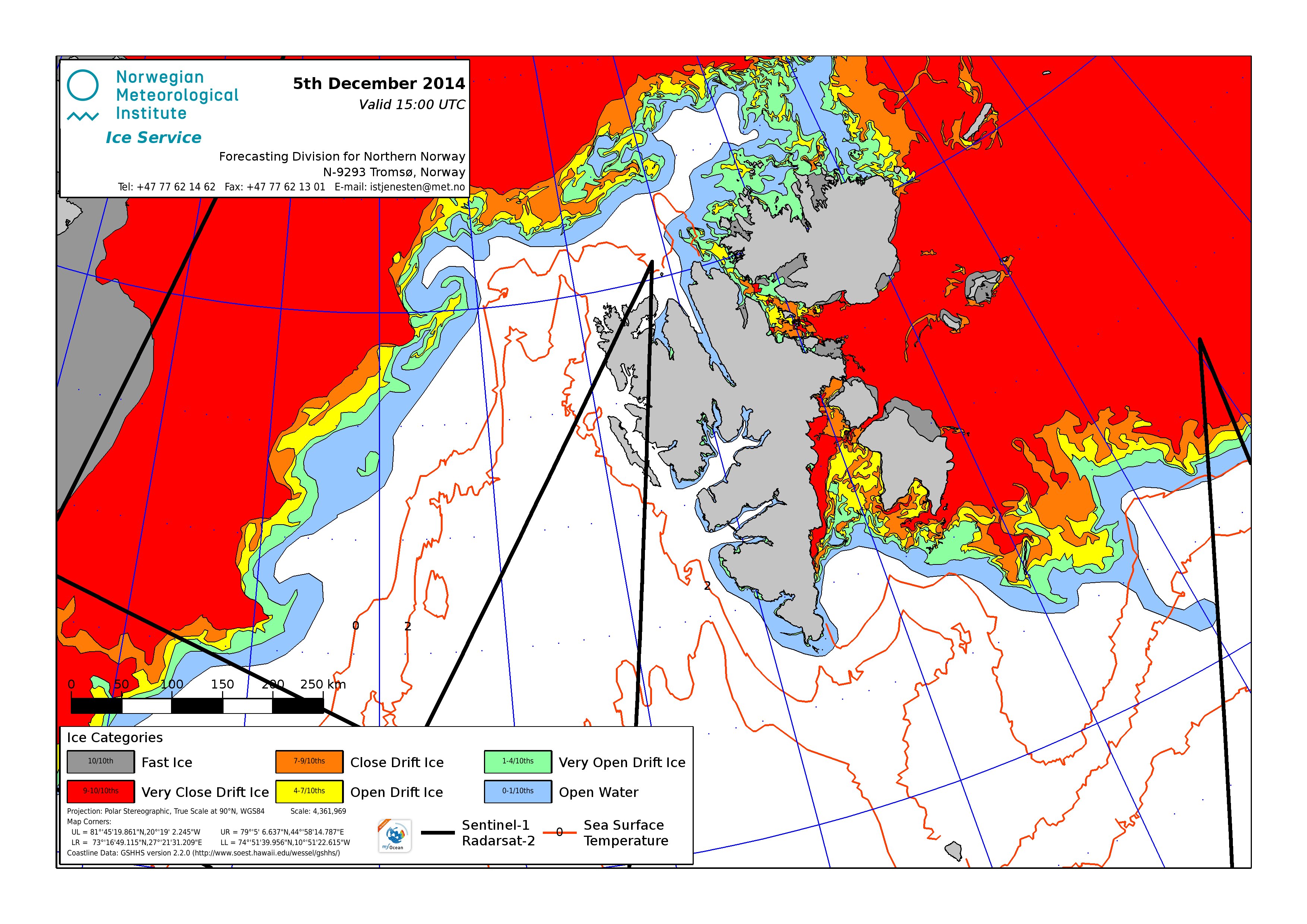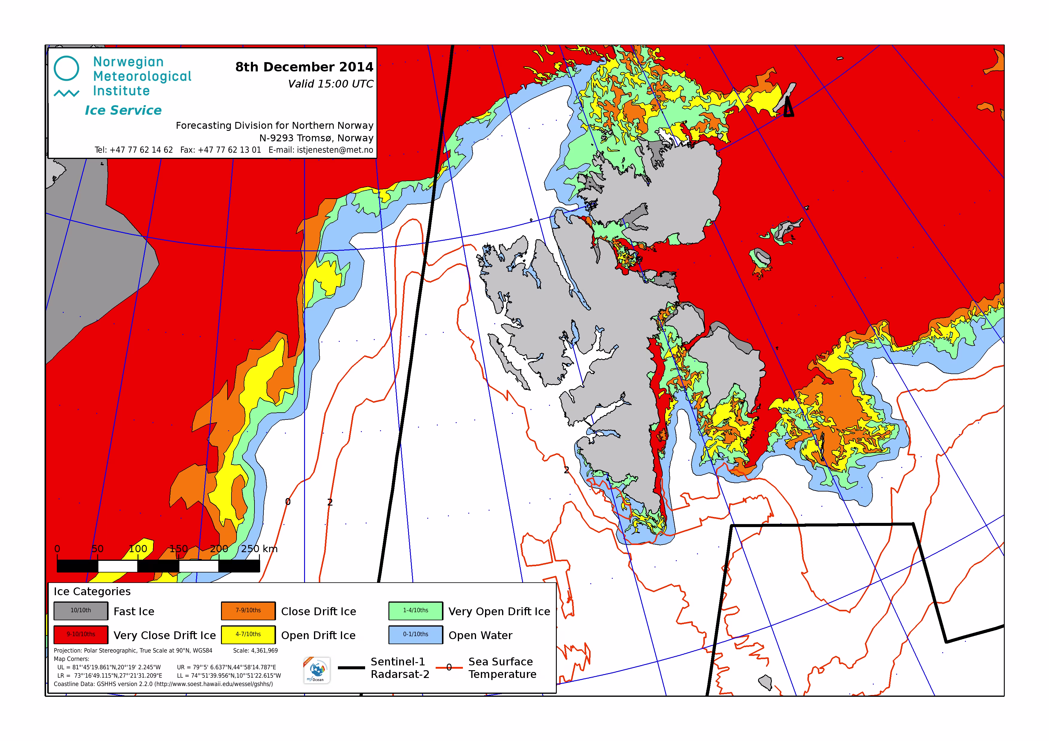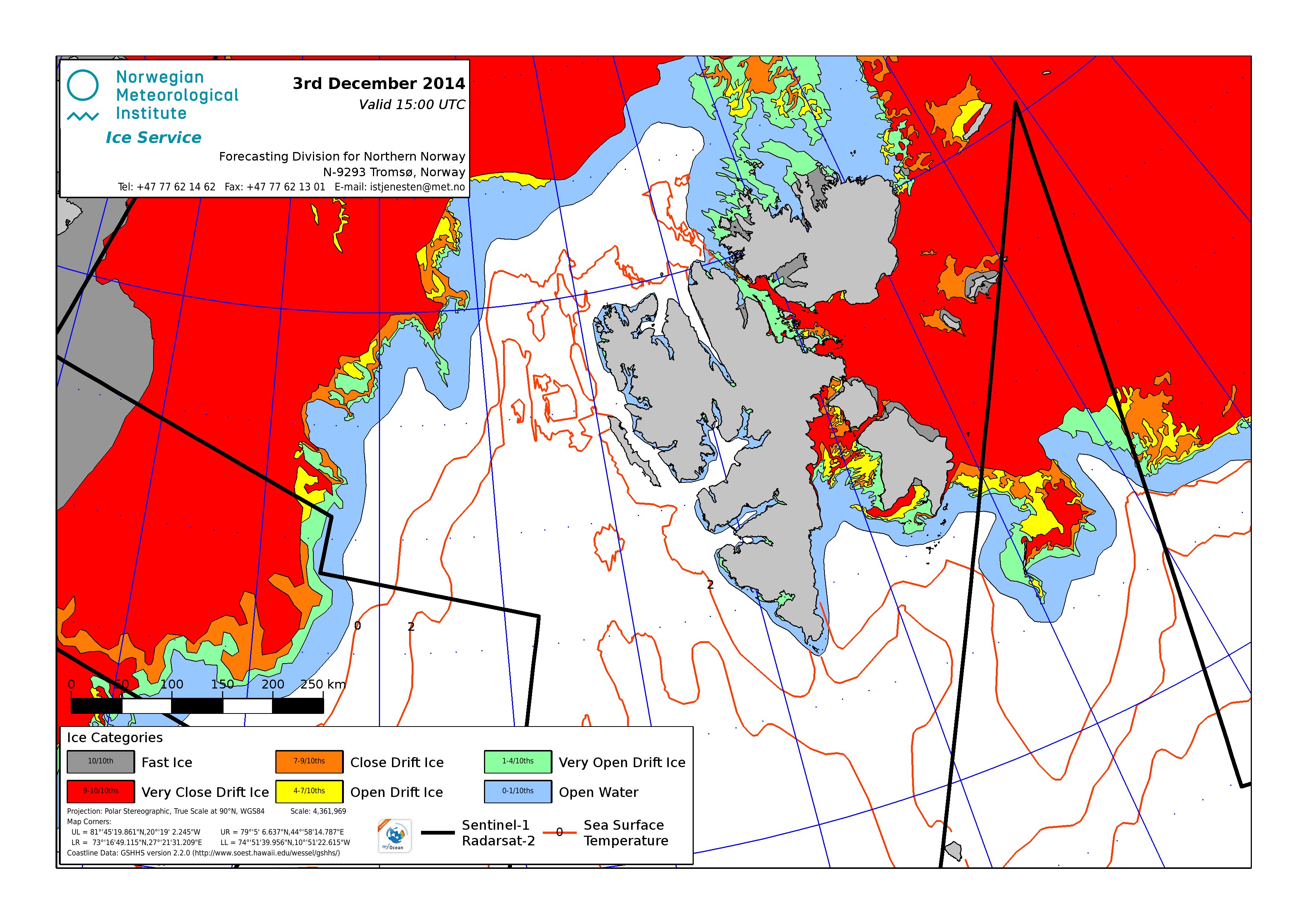 Hier werden immer die gerade aktuell gültigen Eiskarten angezeigt. Üblicherweise werden die Karten so gegen 16 Uhr aktualisiert. Allerdings nur an Werktagen, nicht am Wochenende oder (norwegischen) Feiertagen. Die Originaldaten hole ich mir von einem FTP-Server ftp.met.no, dort liegen die gewünschten Karten unterhalb von /projects/icecharts.