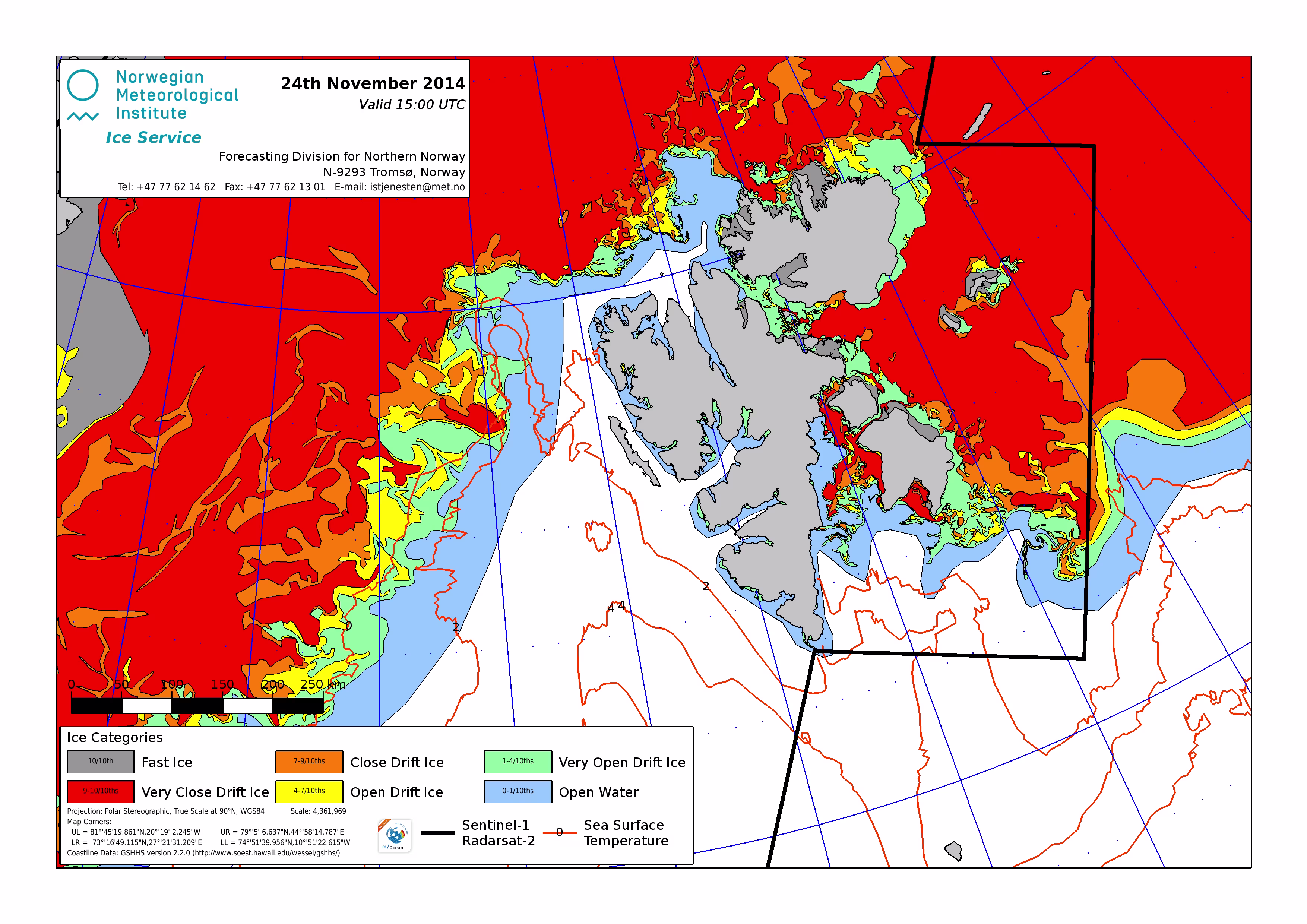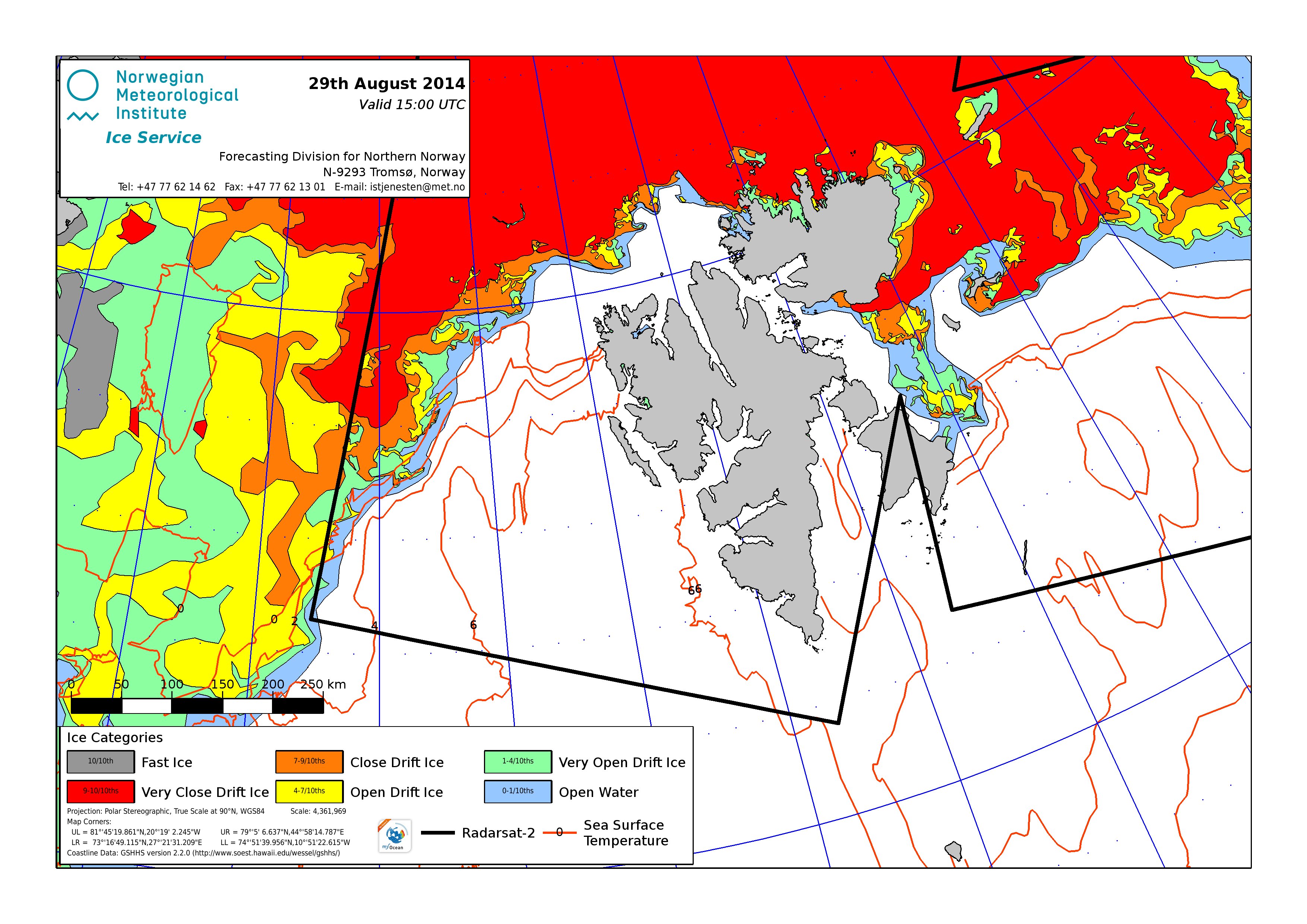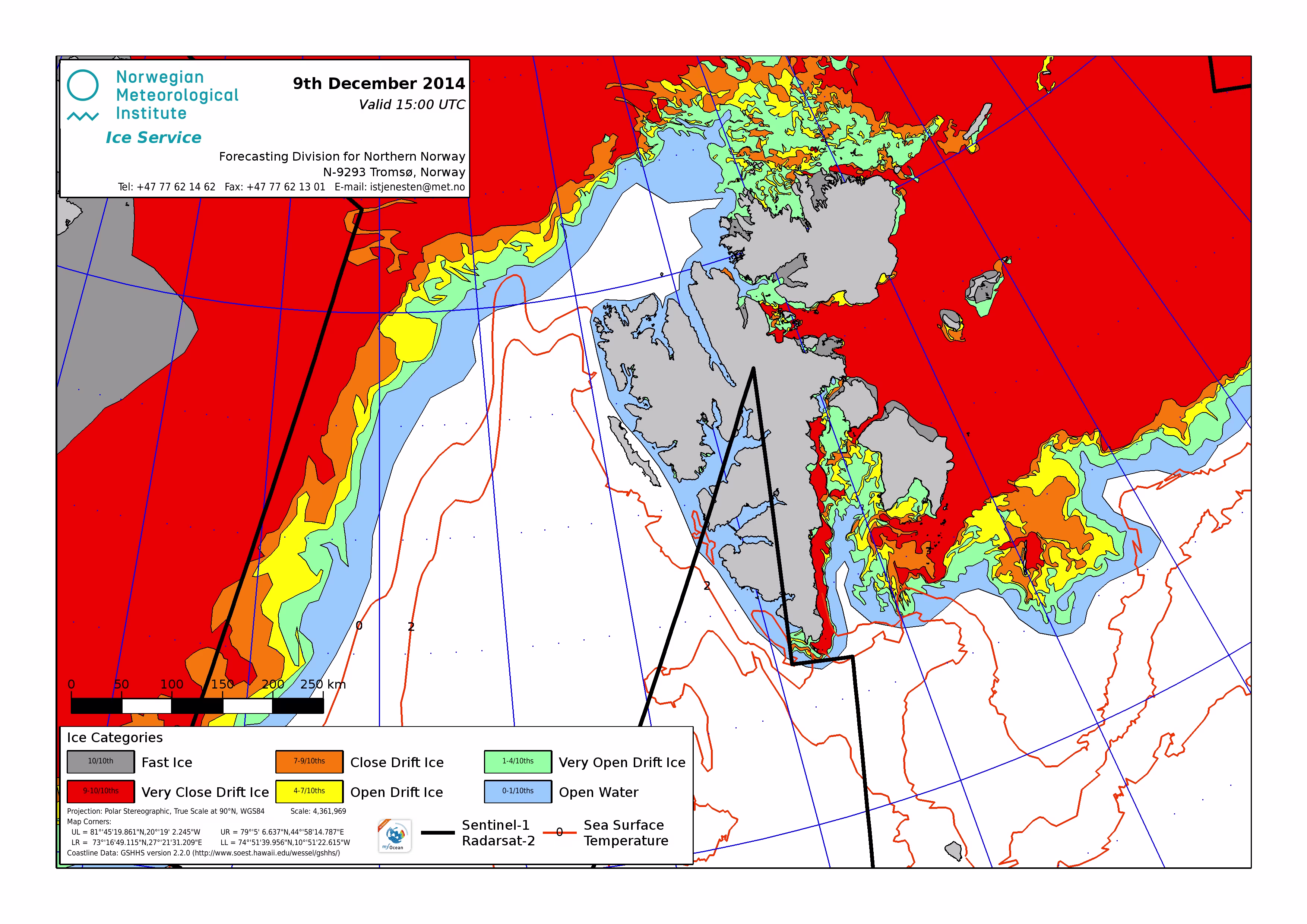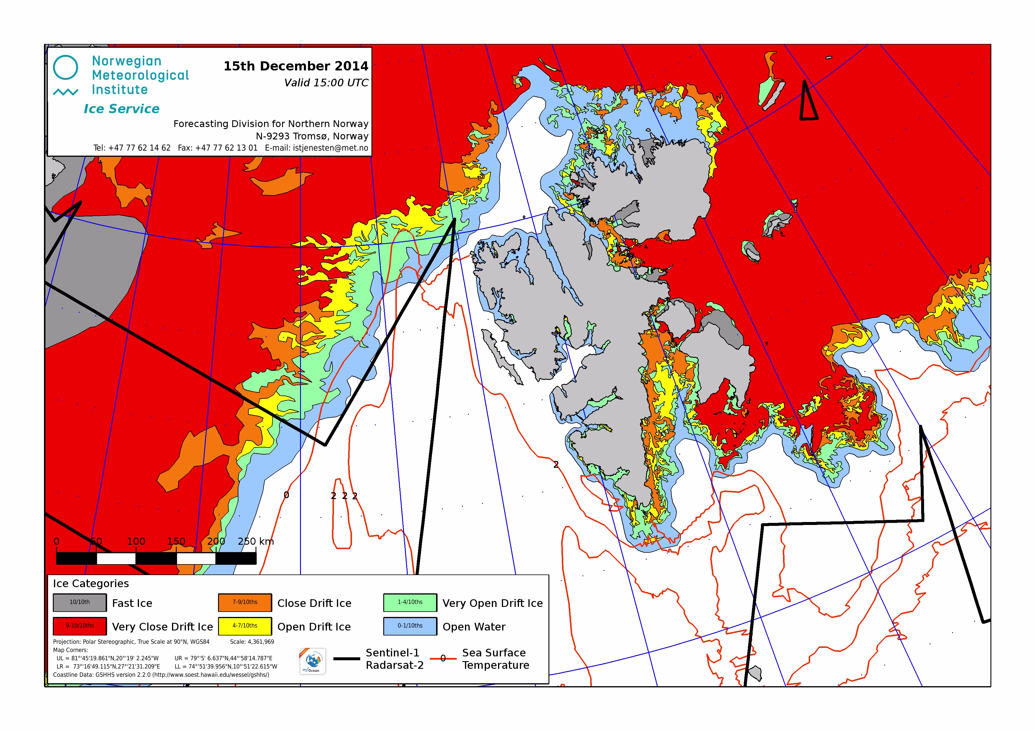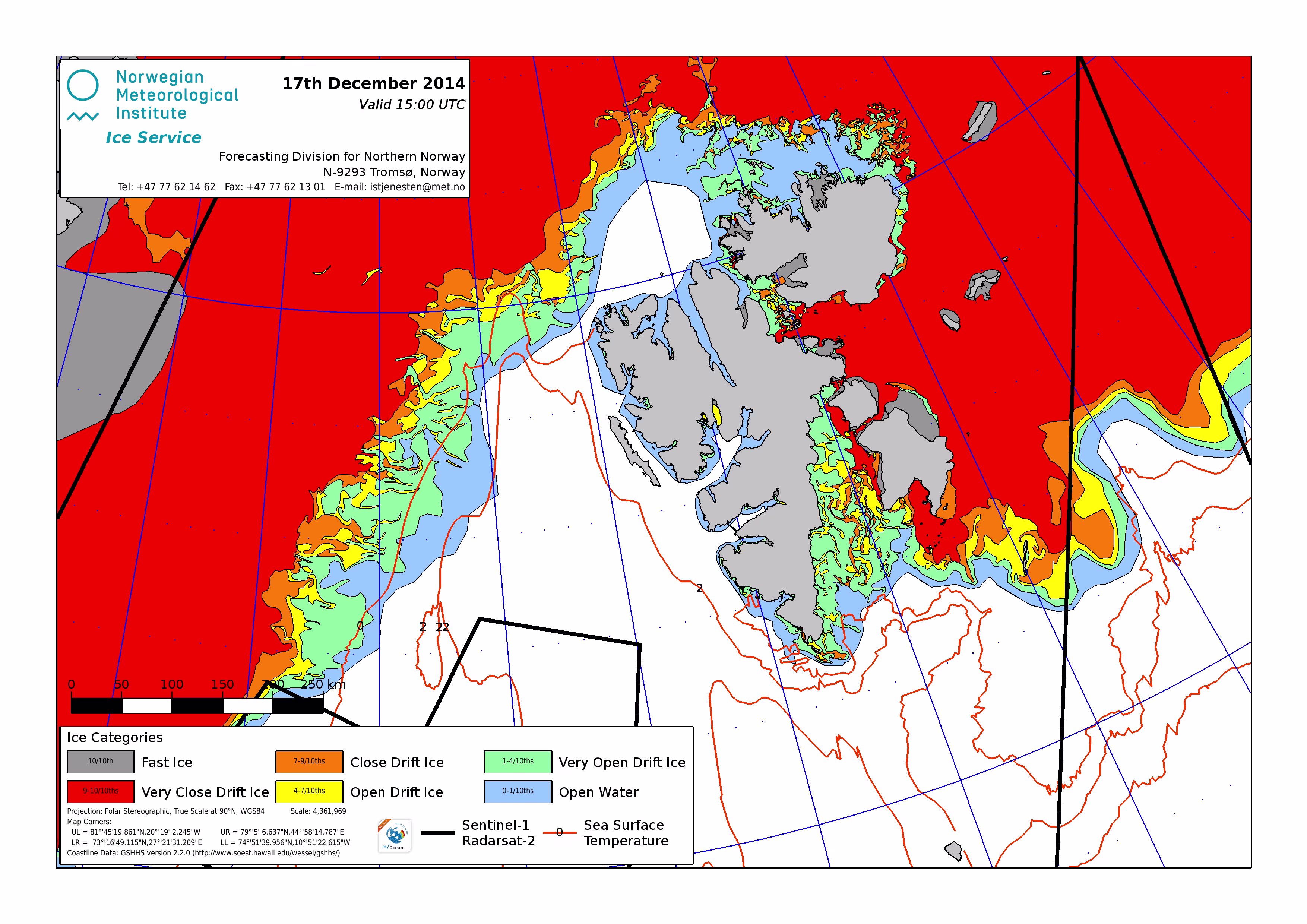 Hier werden immer die gerade aktuell gültigen Eiskarten angezeigt. Üblicherweise werden die Karten so gegen 16 Uhr aktualisiert. Allerdings nur an Werktagen, nicht am Wochenende oder (norwegischen) Feiertagen. Die Originaldaten hole ich mir von einem FTP-Server ftp.met.no, dort liegen die gewünschten Karten unterhalb von /projects/icecharts.