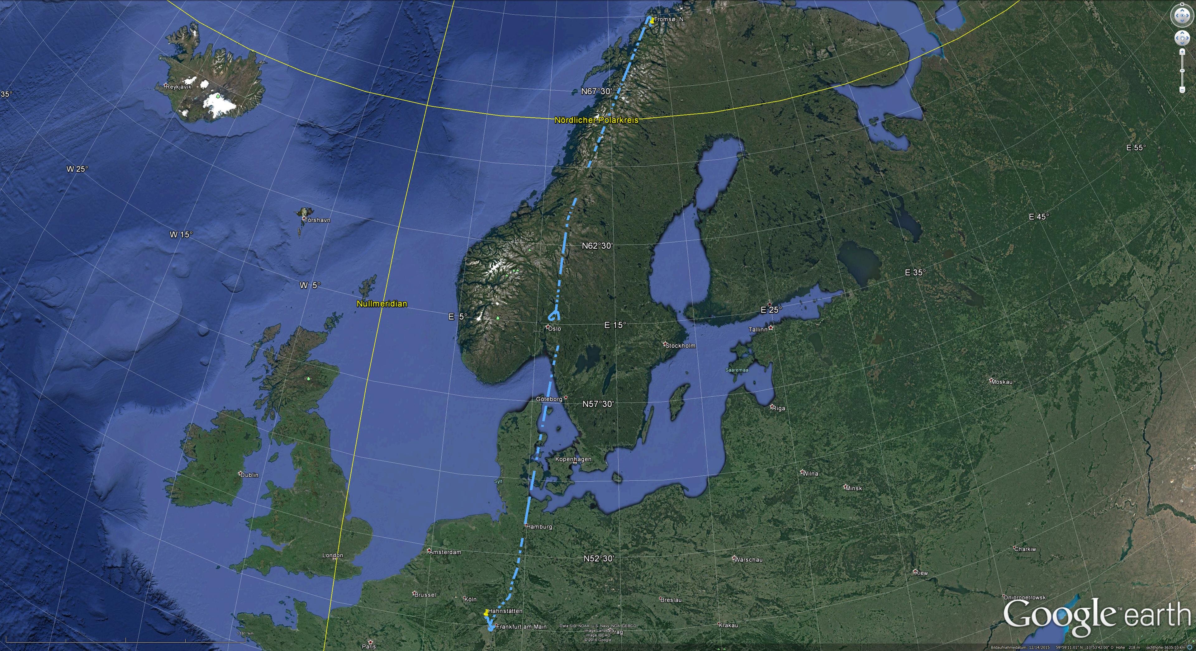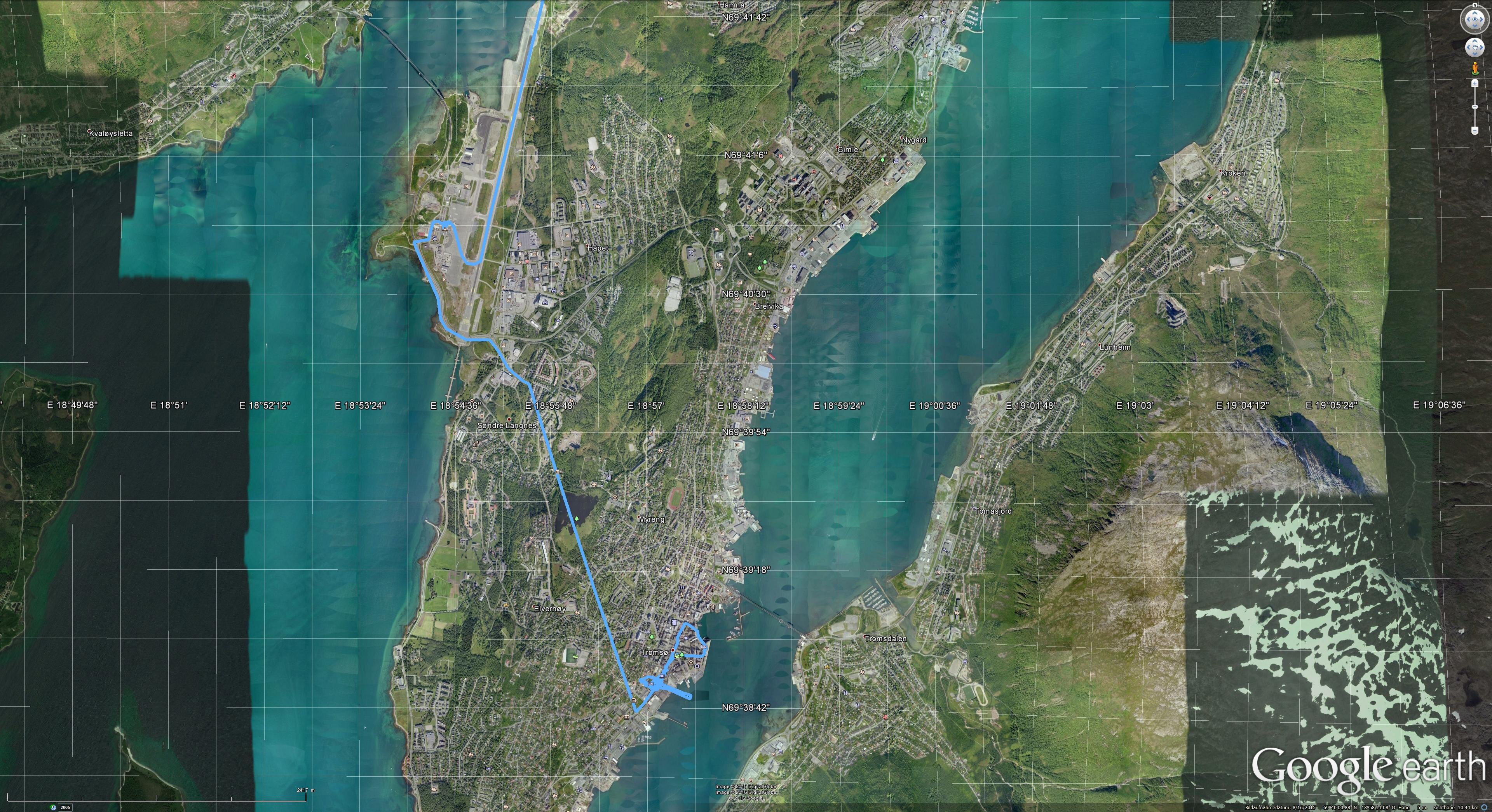Mit dem Zug von „Limburg Süd“ nach „Frankfurt am Main Flughafen Fernbahnhof“, dann mit dem Flieger nach Oslo. Dort dann Weiterflug nach Tromsø. Mit dem Flybuss ins Zentrum und dann in die Unterkunft „Viking Hotell Tromsø“.