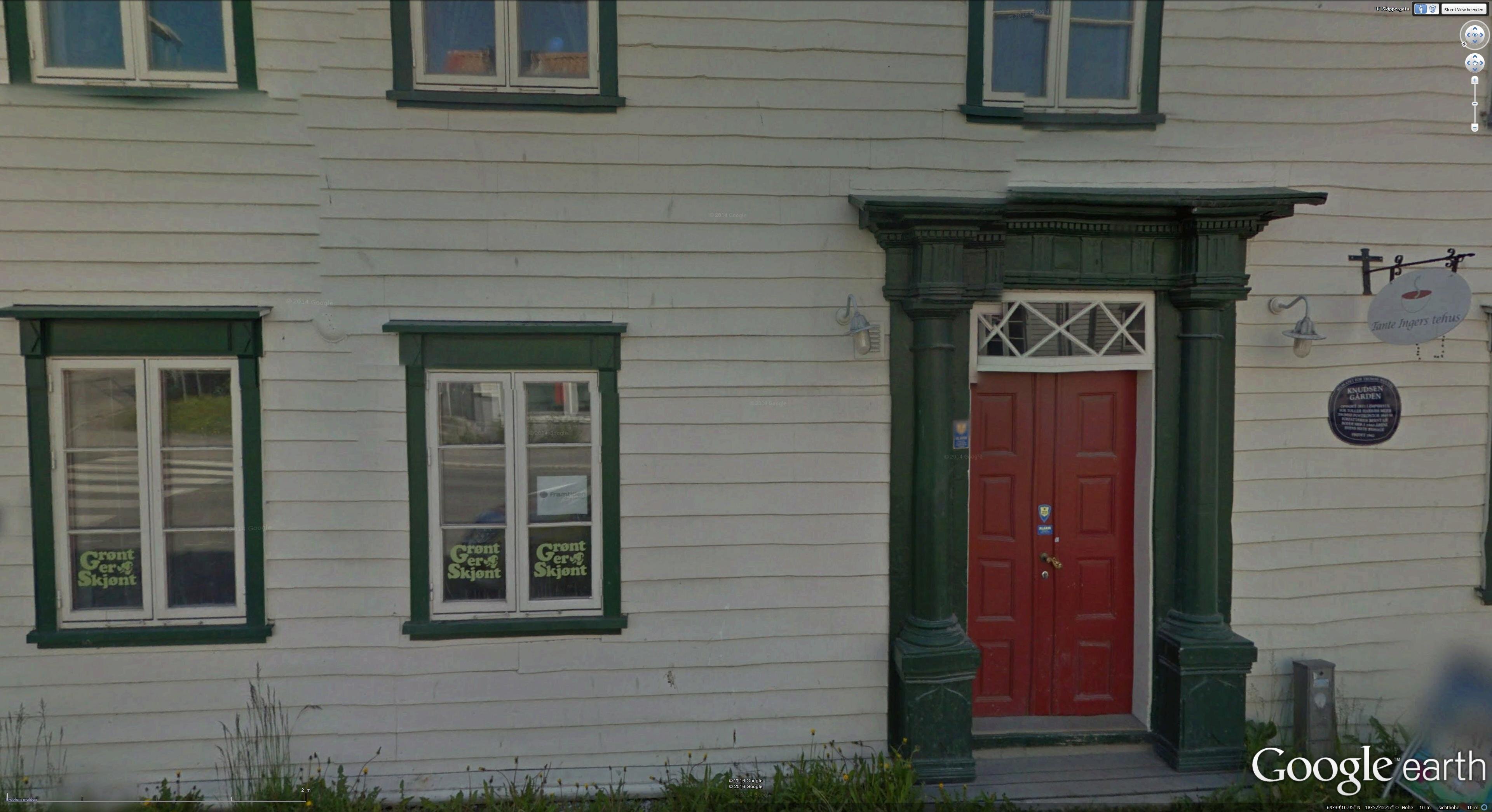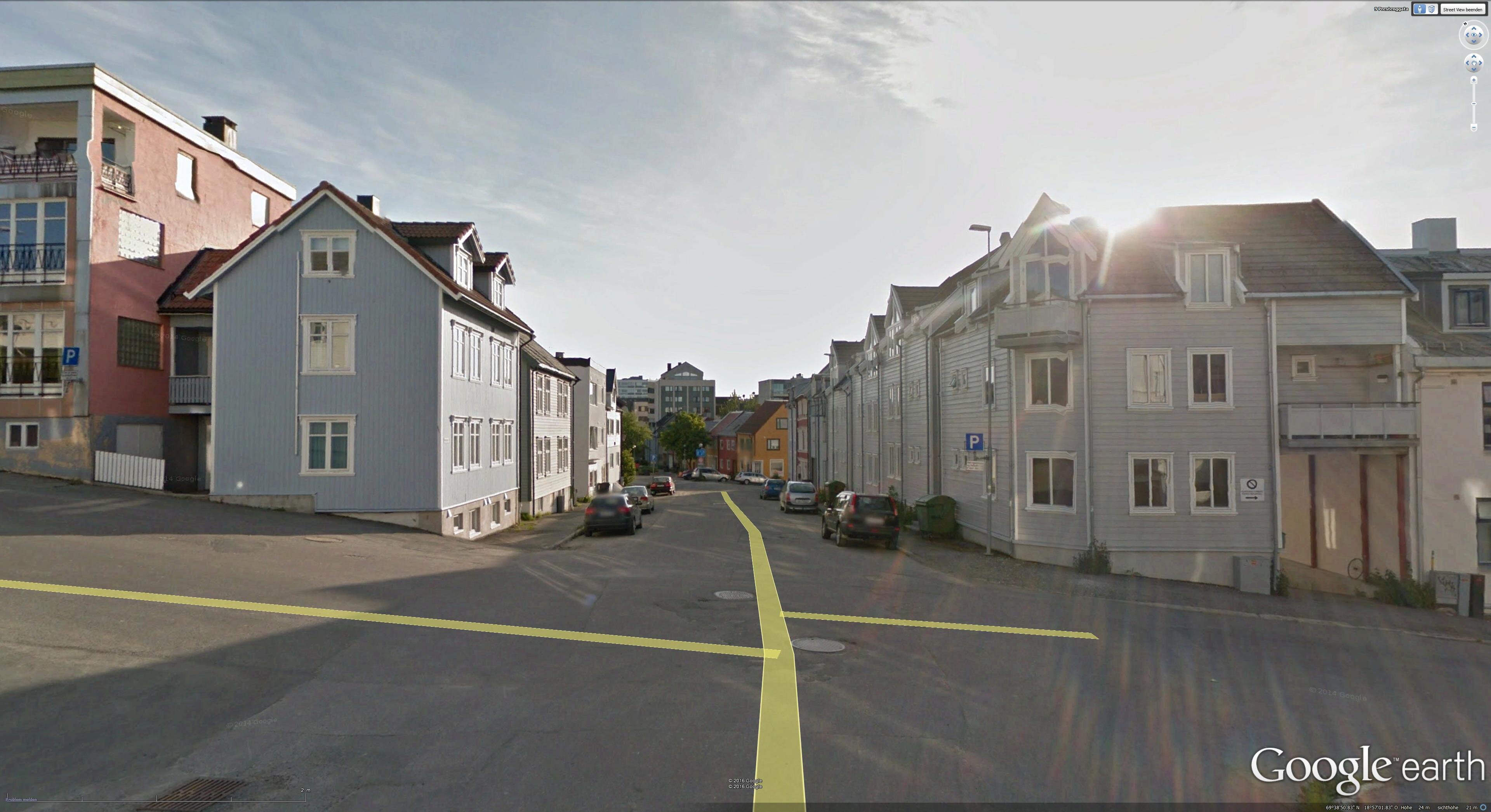 Links das Haus mit der Ferienwohnung, oberes und mittleres Stockwerk. Ecke Peder Hanssens gate / Prestenggata