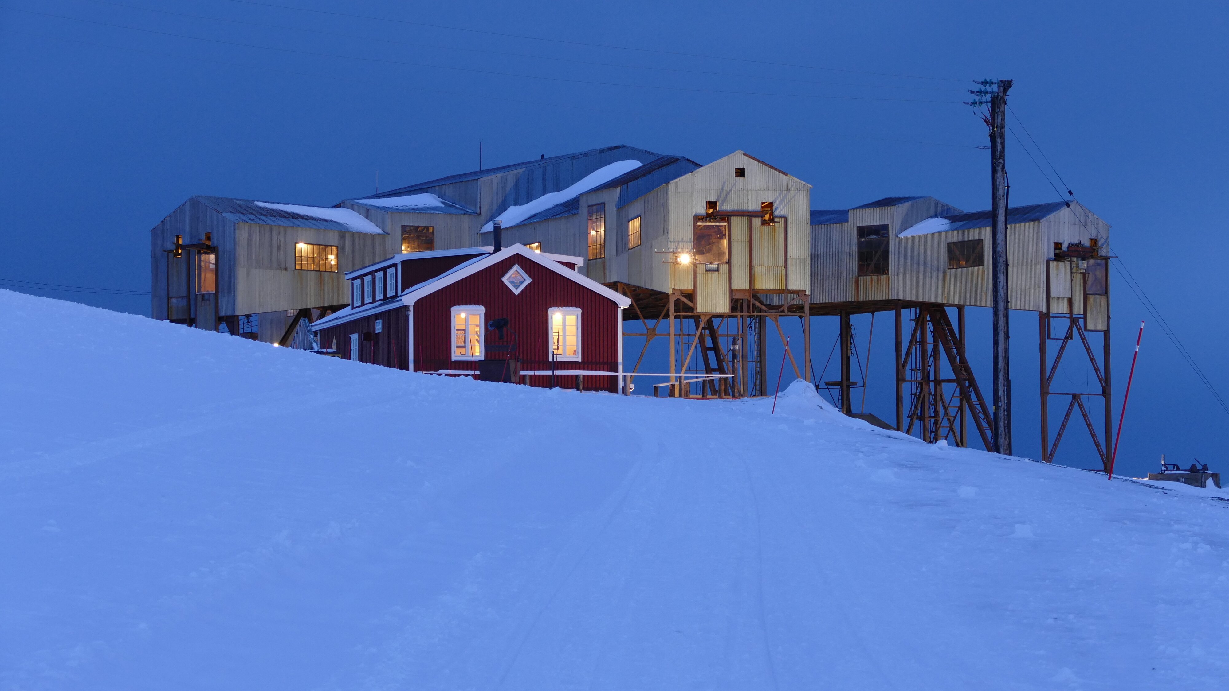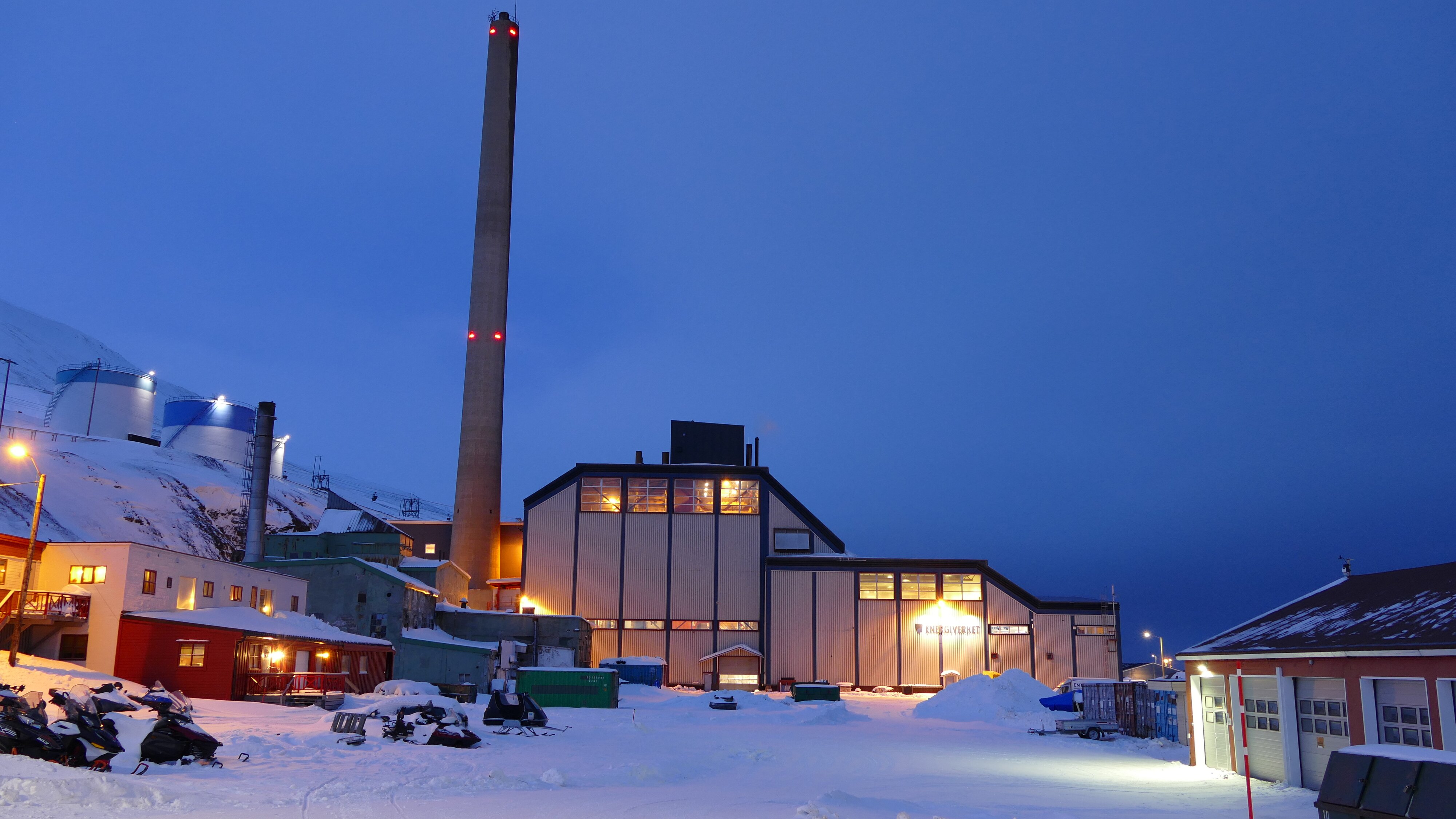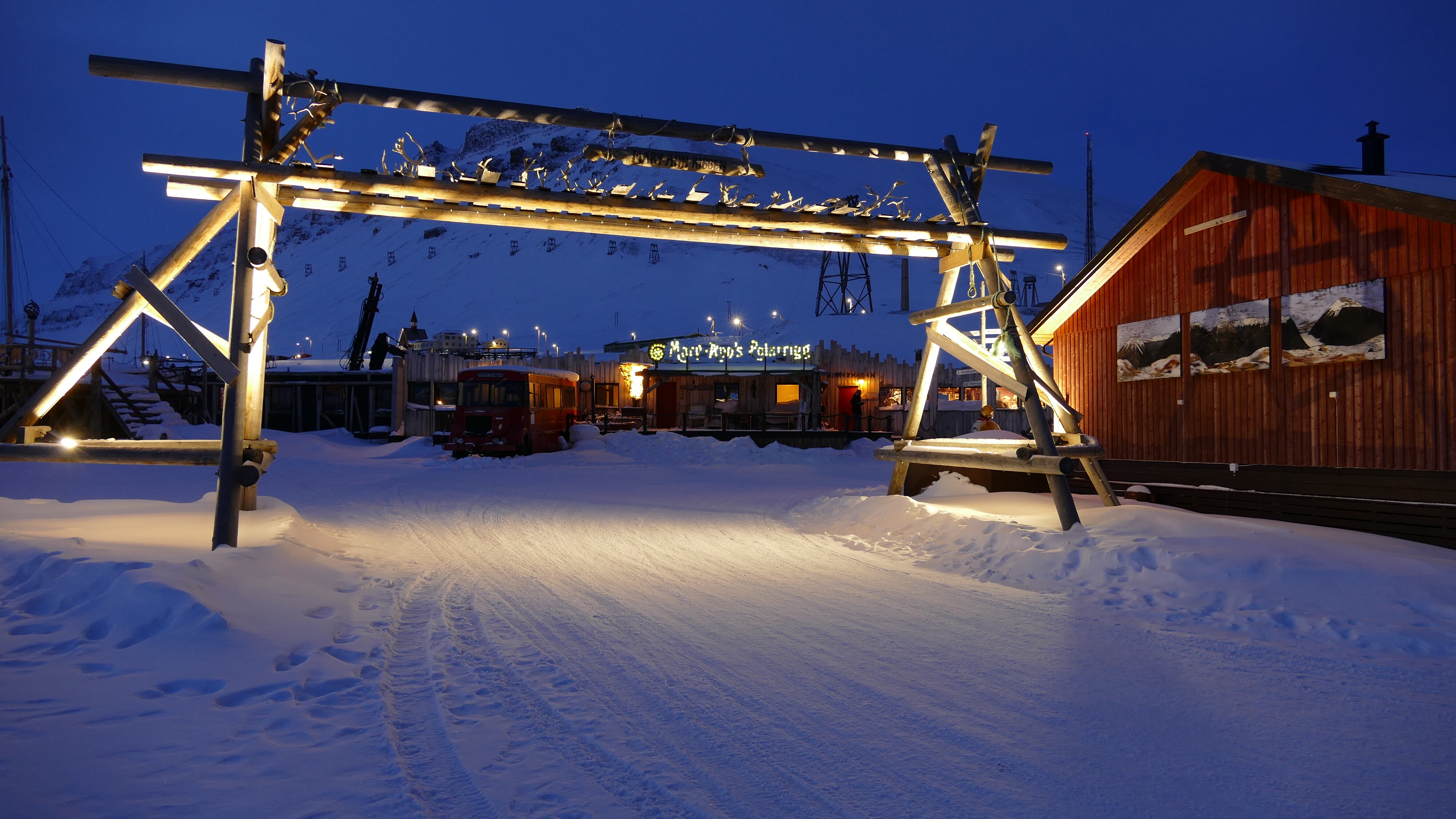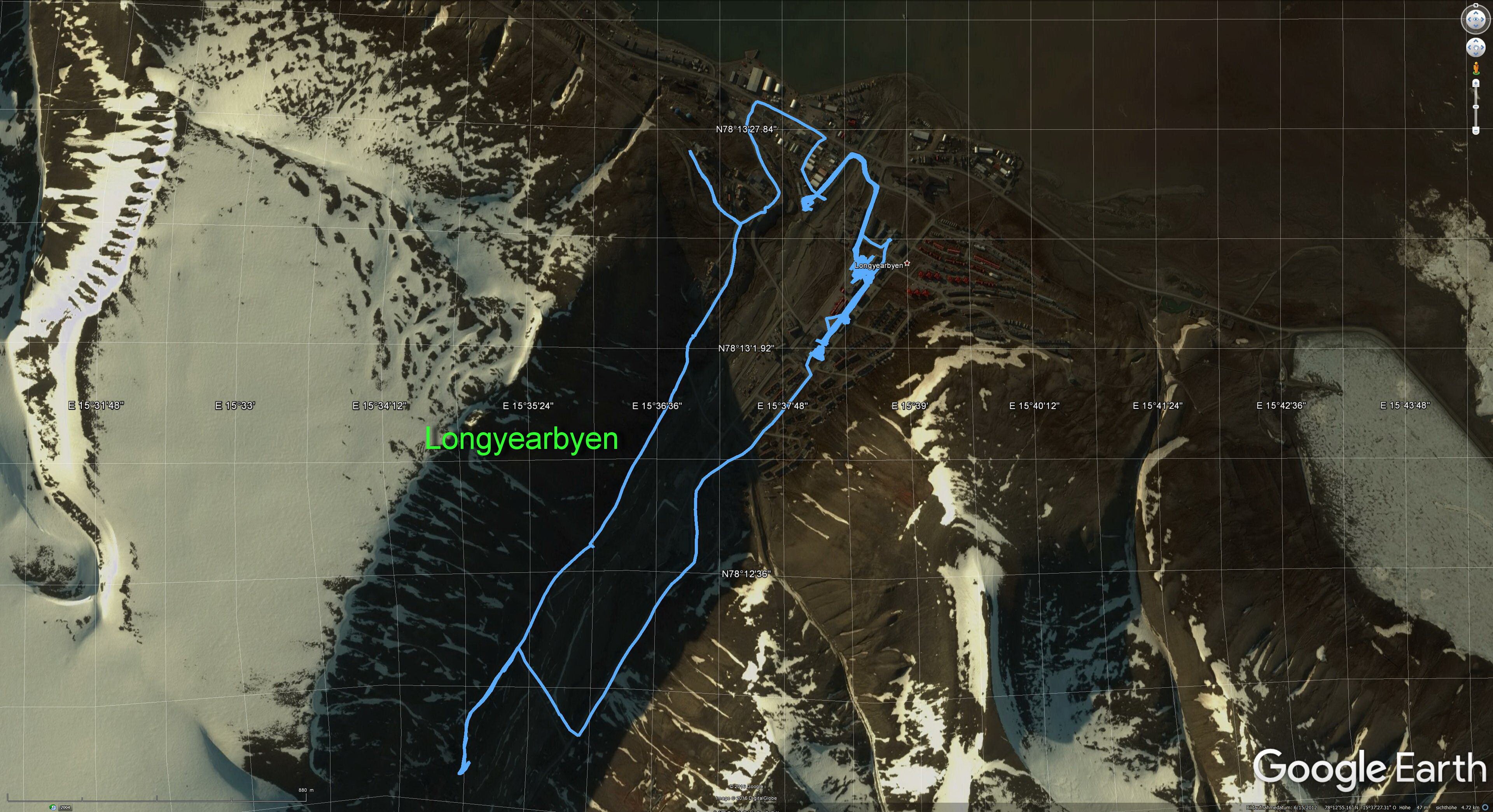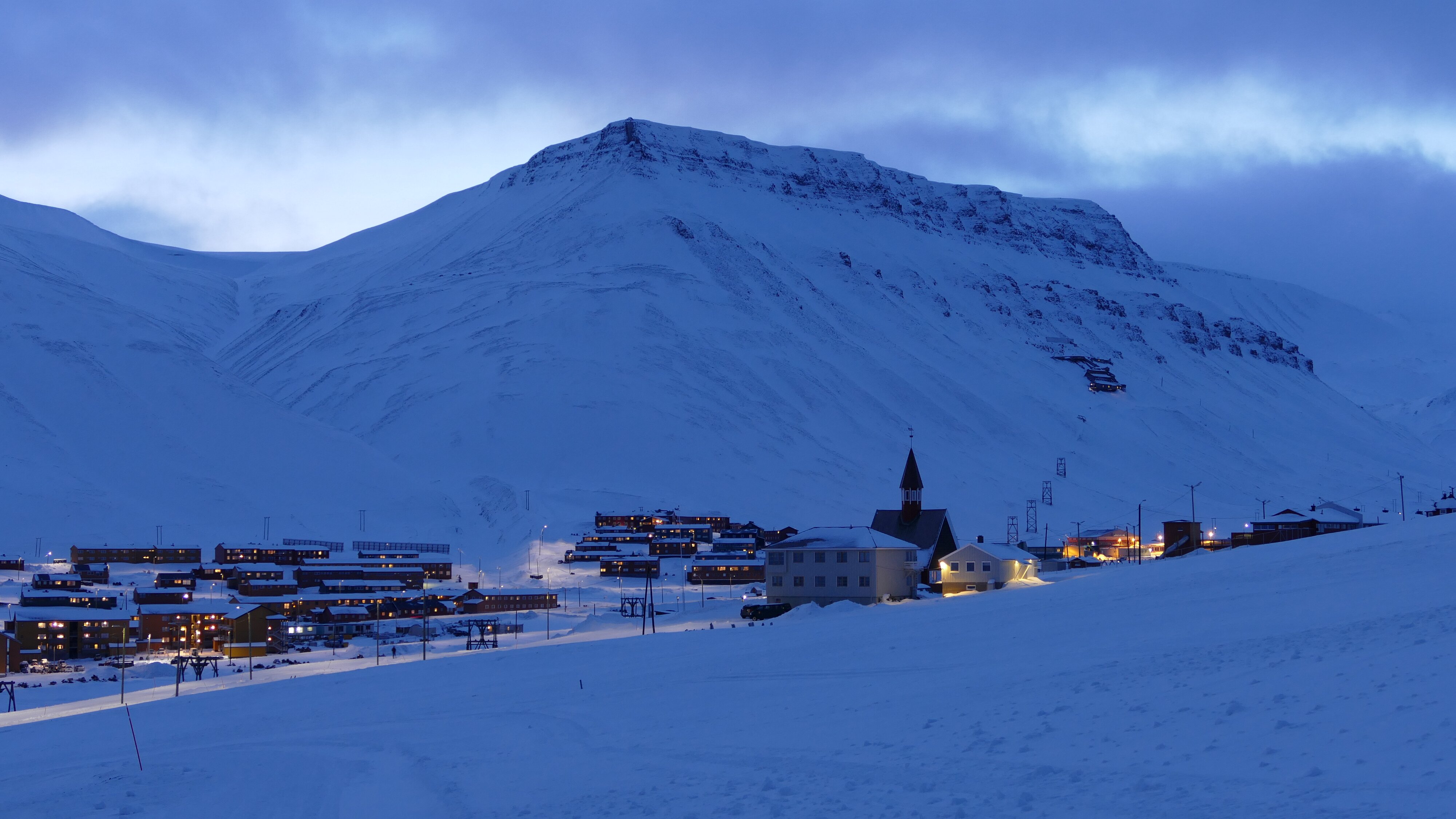 Heute gute Sicht, fast kein Wind, Temperaturen leicht unter dem Gefrierpunkt. Abmarsch dieses mal mit Stativ, das hätte ich gestern schon machen sollen. Bis zum Mittag wäre sogar die Sonne mal zu sehen gewesen, so sie denn den Horizont überschritten hätte. Will sagen, in Richtung Süd-Osten war es wolkenfrei und damit auch vergleichsweise hell. Die Tour zog sich lange hin, mit Abstechern auch zu den abseits gelegenen Orten wie der Taubanesentralen, da hatte ich mich das letzte Mal nicht hin getraut weil ich dachte das läge schon zu abseits. Auch über das Huset zum Gruvelageret bin ich gegangen, da geht es noch mal etwas den Berg hoch und es bietet sich praktisch ein kompletter Blick auf Longyearbyen, mit Adventfjorden und dem 924 m aufragenden Hiortfjelet.