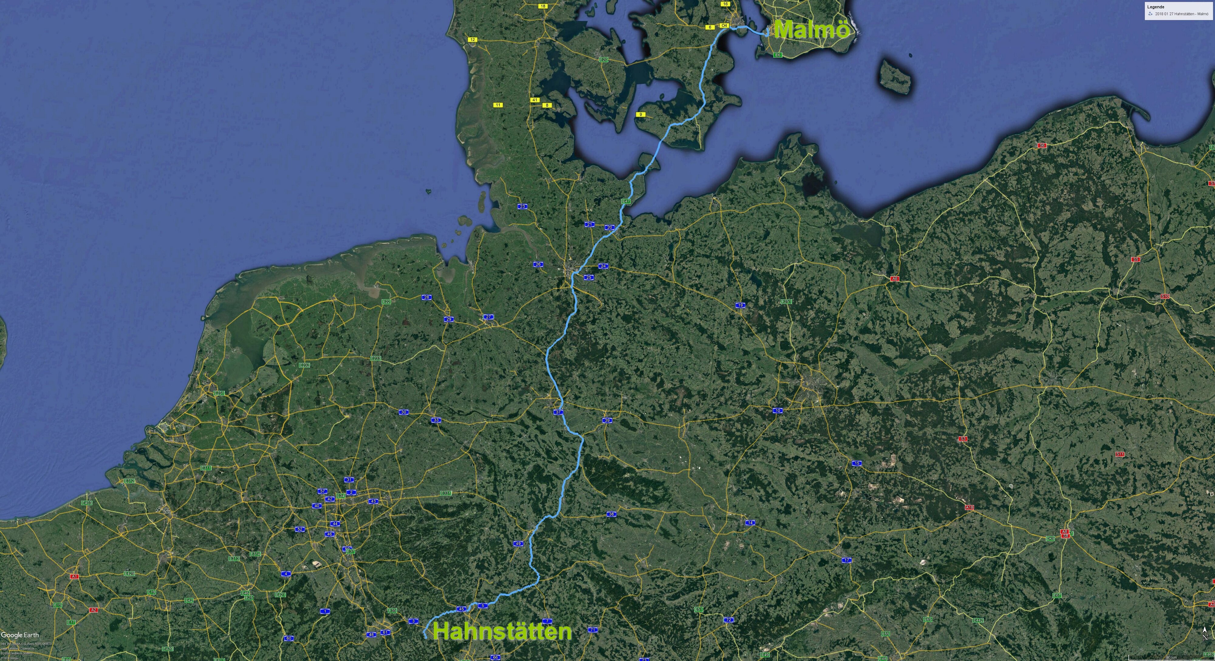 • Hahnstätten – Malmö, immer der Nase nach 😎. Die Fähre ist für die Abfahrt um 16:15 Uhr gebucht. Die Strecke von ca. 655 km (über A5/A7) bis nach Puttgarden wird mit 6 Std. 33 Min. prognostiziert.