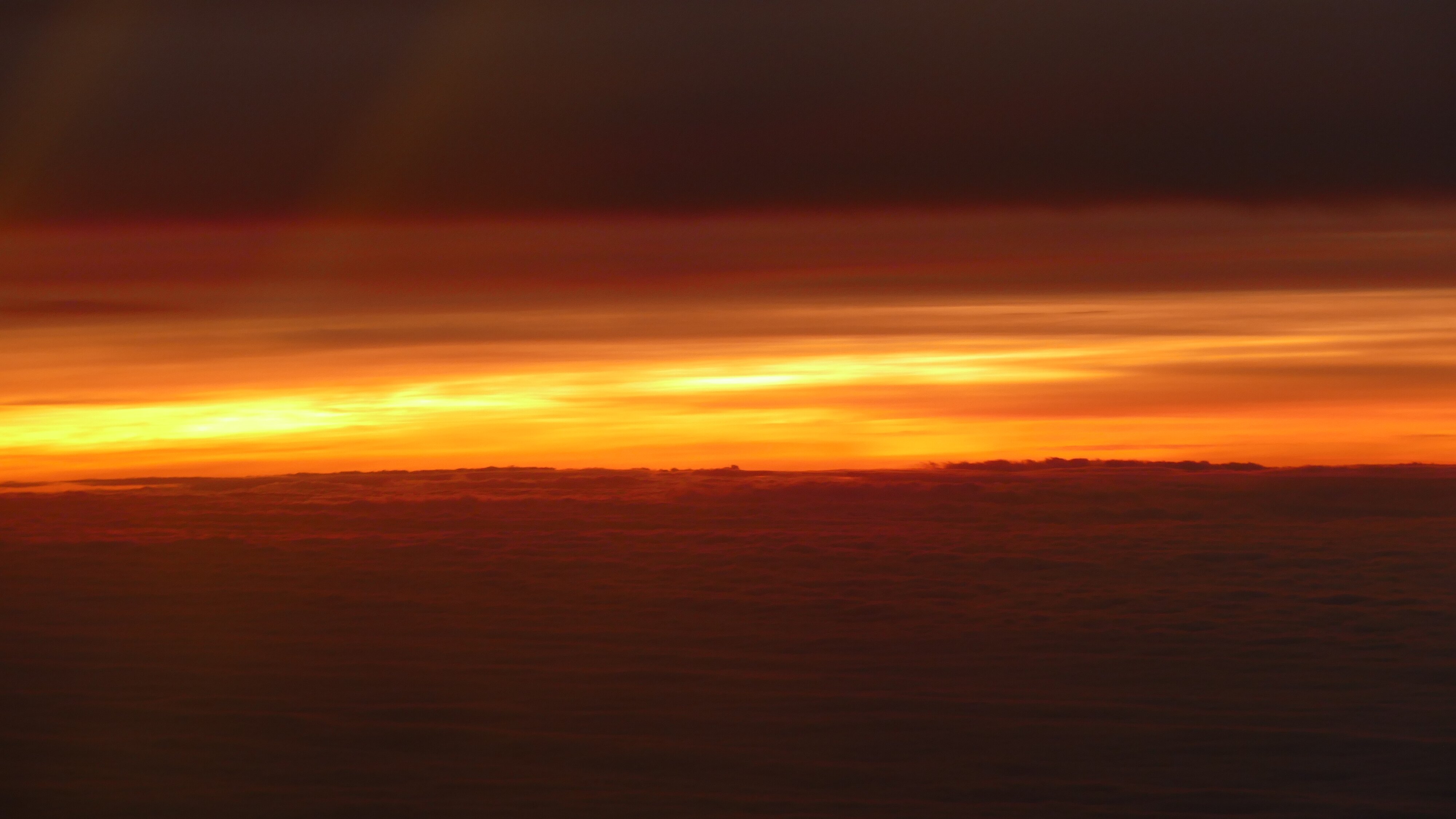 Ein wenig Verspätung hatte der Flieger, aber egal, es hetzte kein weiterer Termin heute. Einchecken per Internet klappte wieder nicht, und obwohl nur noch eine handvoll Plätze frei waren ergatterte ich noch einen Fensterplatz. Und auch dieses mal wieder auf der interessantesten Seite. Beim Start in Longyearbyen war es ja schon mehr oder weniger stockdunkel, aber kurz vor der Landung in Tromsø „brannte“ der Himmel wieder feuerrot.