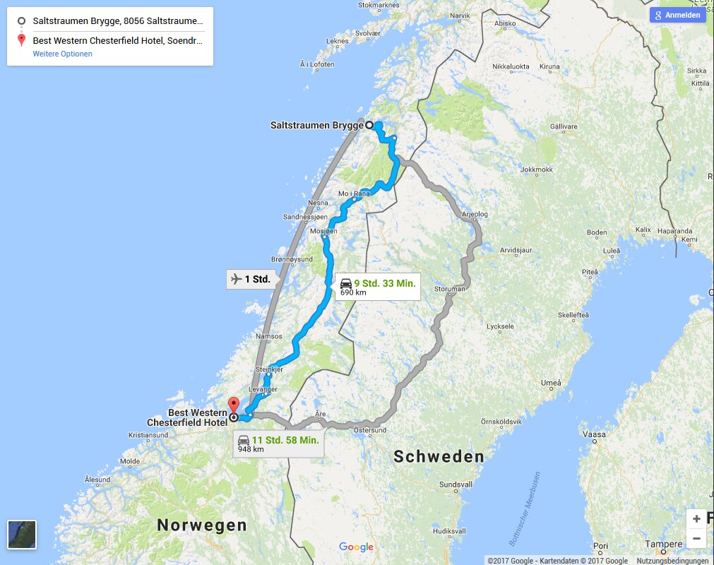Das Navi bot heute mal wieder eine Spezialvorstellung. Das es mich nicht auf meiner angedachten Route haben wollte konnte ich ja noch nachvollziehen, dass es mir meine Route auch nicht als Alternative anbot, obwohl diese deutlich kürzer war, ist allerdings schon weniger nett. Der Hit war allerdings die zeitliche Prognose, Ankunftszeit in Trondheim sollte am nächsten Tag um 6 Uhr in der Früh sein, ja wie abgedreht ist das denn?