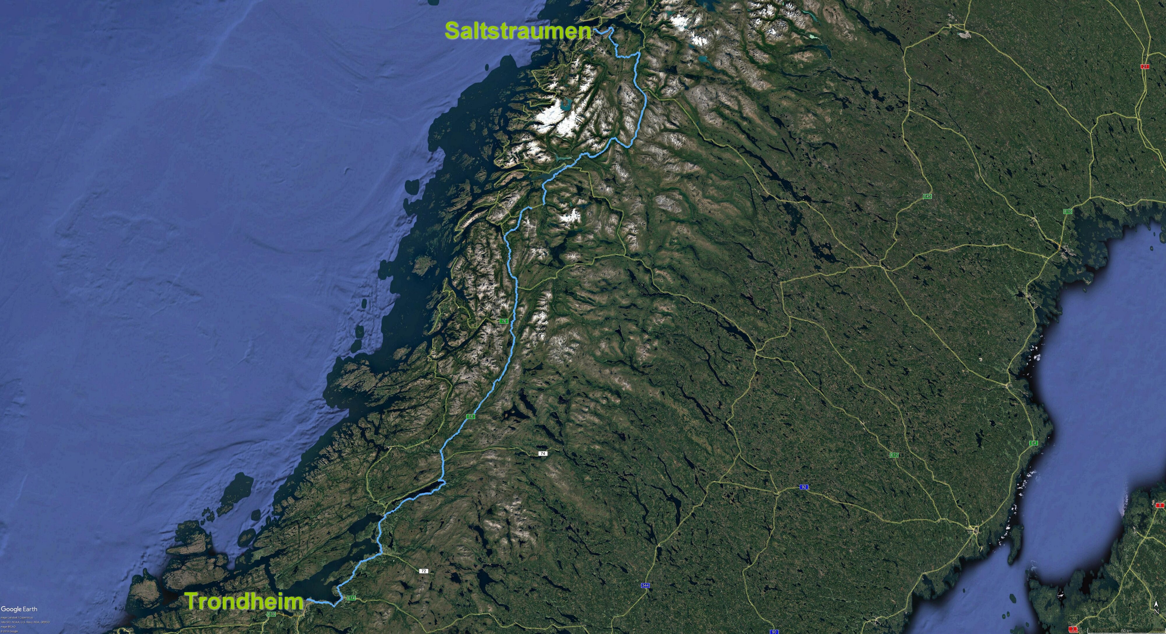 - Auf der Fahrt von Straumen nach Trondheim gibt es zwei alternative Streckenführungen neben der [E6]. Die erste zweigt in Korgen ab und geht über die [806], [291], [73], [273], [274] in der Nähe von Majav wieder auf die [E6]. Die Strecke nennt sich auch Villmarksveien.