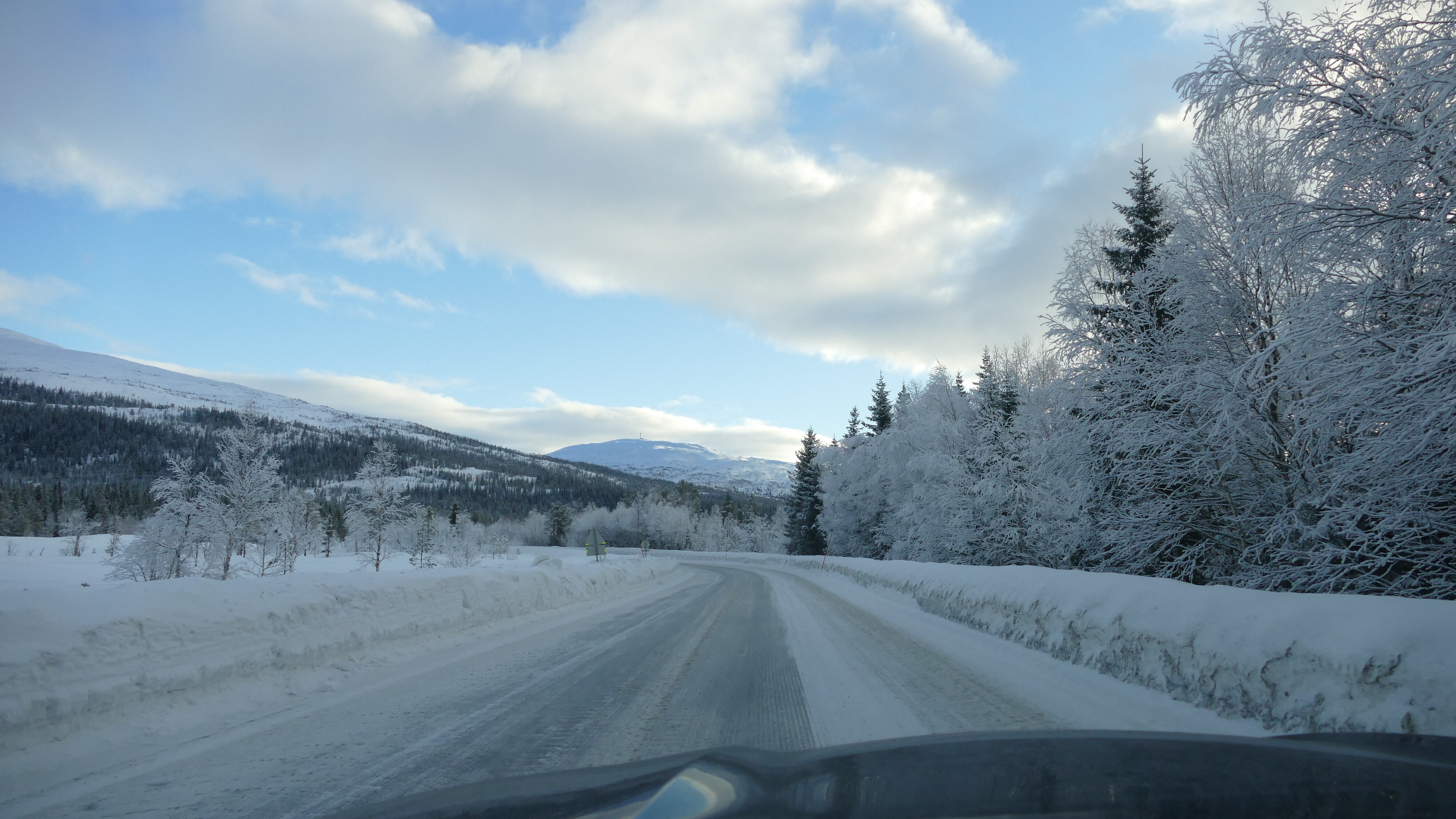 Für Sorsele hat es heute Temperaturvorhersagen von bis zu -28 °C, aber da komme ich leider nicht mehr vorbei. In Mo i Rana, wo ich heute durch fahre, soll es Sonnenschein geben, das wäre ja mal was. Und in Mosjøen und in Grong und Steinkjer auch. In Trondheim, dem Tagesziel soll es gegen Abend zumindest -4 °C werden, das ist ok.