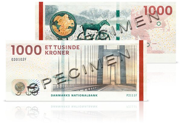 1000-kronesedlen – Storebæltsbroen og Solvognen. © Danmarks Nationalbank