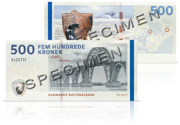 500-kronesedlen – Dronning Alexandrines bro og bronzespanden fra Keldby. © Danmarks Nationalbank