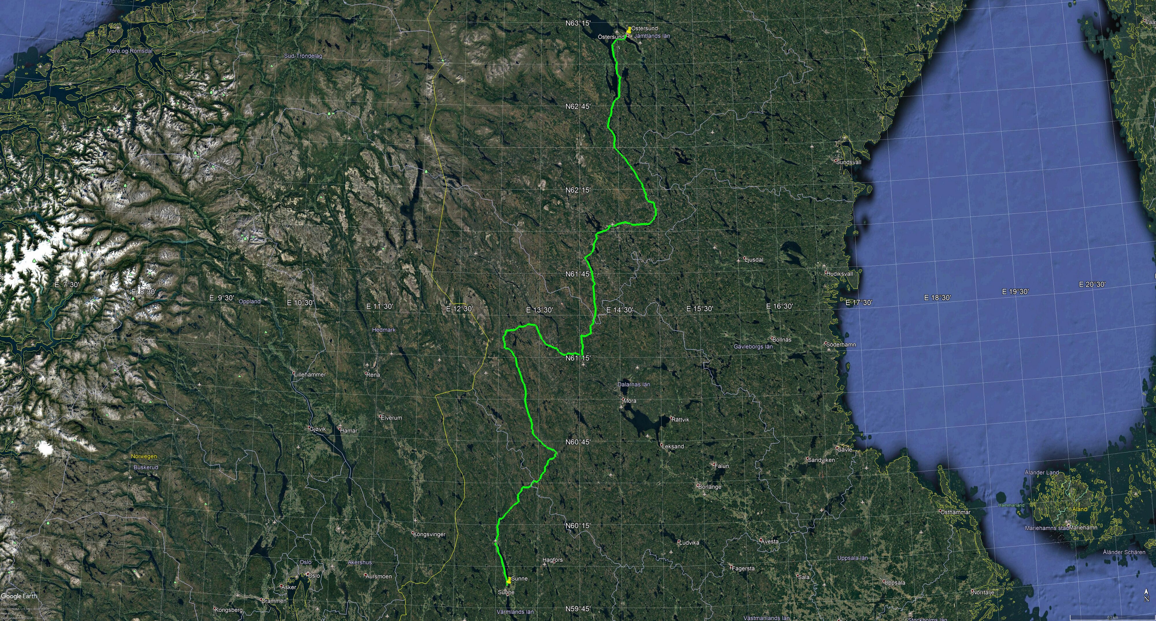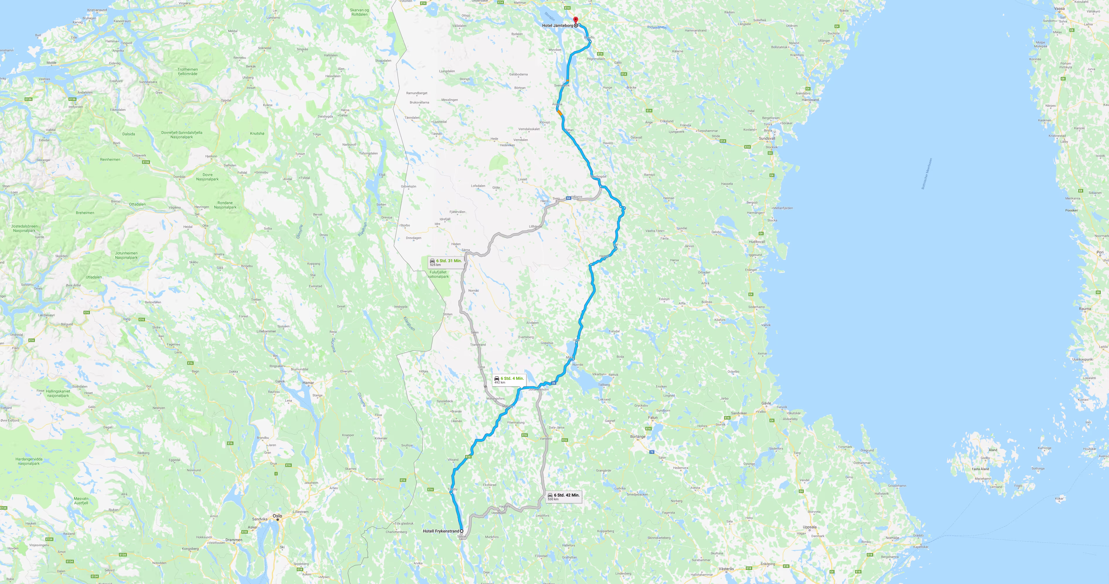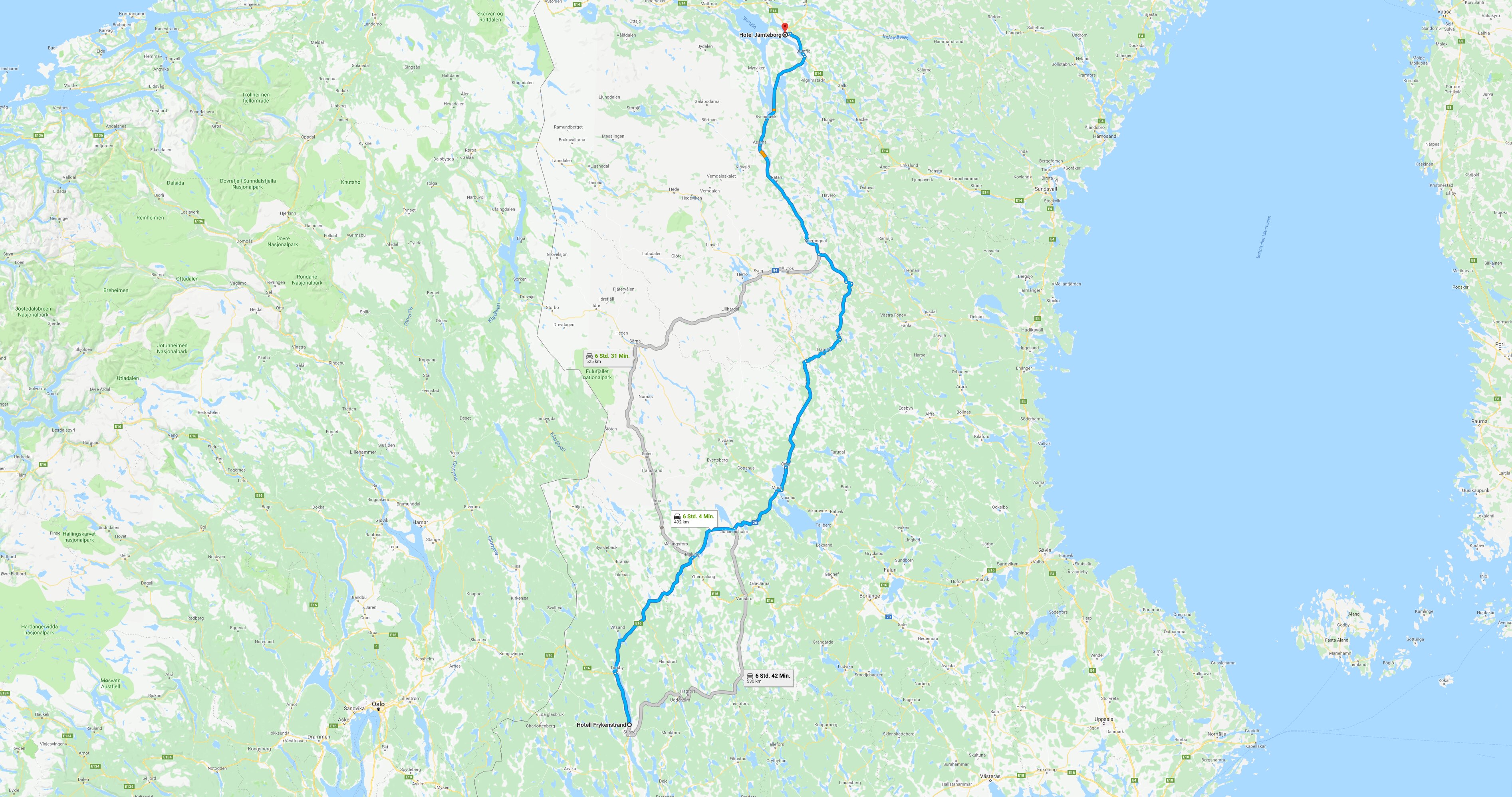 Auf der Karte sieht das auf den ersten Blick harmlos aus, aber unmittelbar an der Wegstrecke (einem Abschnitt auf der [311]) steht ein Berg (Fjätervålen) mit 1001 m. Auf einem Streckenabschnitt geht es auf 847 m ü. d. M. hoch und G__gle Streetview zeigt eine sehr schmale Single-Track-Road. Üha, ob diese Straße im Winter überhaupt befahrbar ist, kaum zu glauben. Die vorgeschlage Strecke, 7 Std. 12 Min. / 601 km. Da wäre allerdings der Straßenabschnitt der auf 847 m hoch geht nicht dabei.