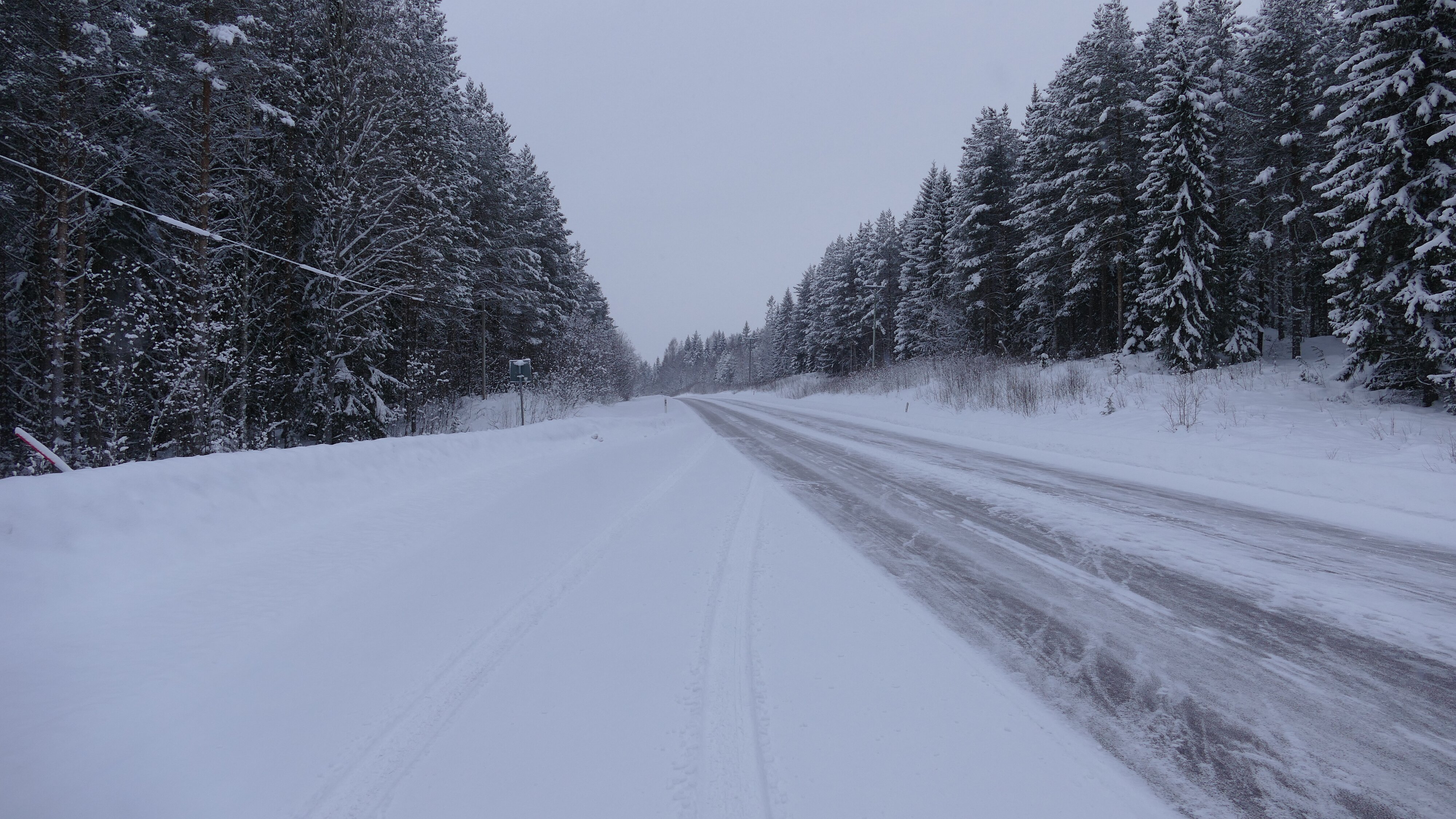 An einer Verzweigung bot sich eine gute Gelegenheit am Straßenrand anzuhalten und mal wieder die Reifenkästen von Schnee und Eis zu befreien, nicht das letzte Mal für heute. An der Stelle war auch noch klar, dass ich eine ganze Weile der 311 folgen muss. Das Navi hatte dann auch plötzlich ein Einsehen und wollte mich endlich nicht mehr zurück nach Malung schicken. Aber wenn man sich die weitere vorgeschlagene Strecke ansah wurde klar, dass ich dann in Mora raus kommen würde, dabei würde ich sogar wieder etwas in Richtung Süden fahren. Hmmm, aber die weitere Strecke auf der 311 nahm gar kein Ende und führte immer weiter nach Westen und die Straße die ich als über Glöte führend entdeckte war von der Darstellung nur eine graue Straße, auf so einer war ich glaube ich hier oben noch gar nicht unterwegs. Egal, lange Rede kurzer Sinne ich bin in Richtung Mora gefahren, was jetzt nicht bedeutete, dass mir Straße und Gegend nicht gefallen hätten, ganz im Gegenteil, es war ein Traum.