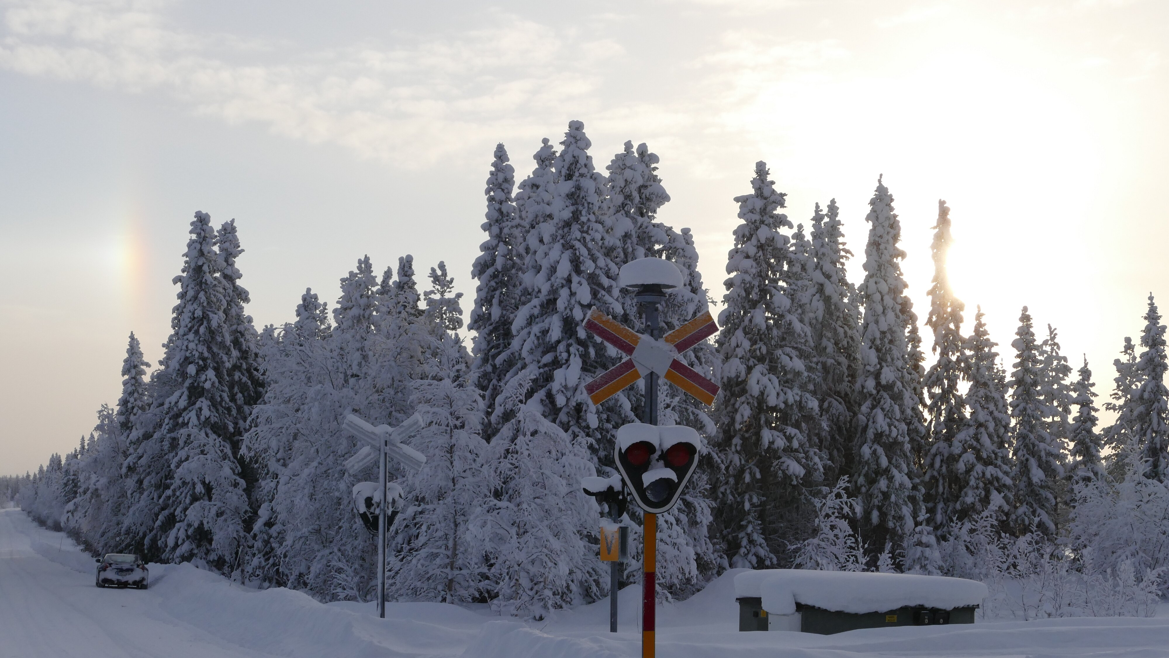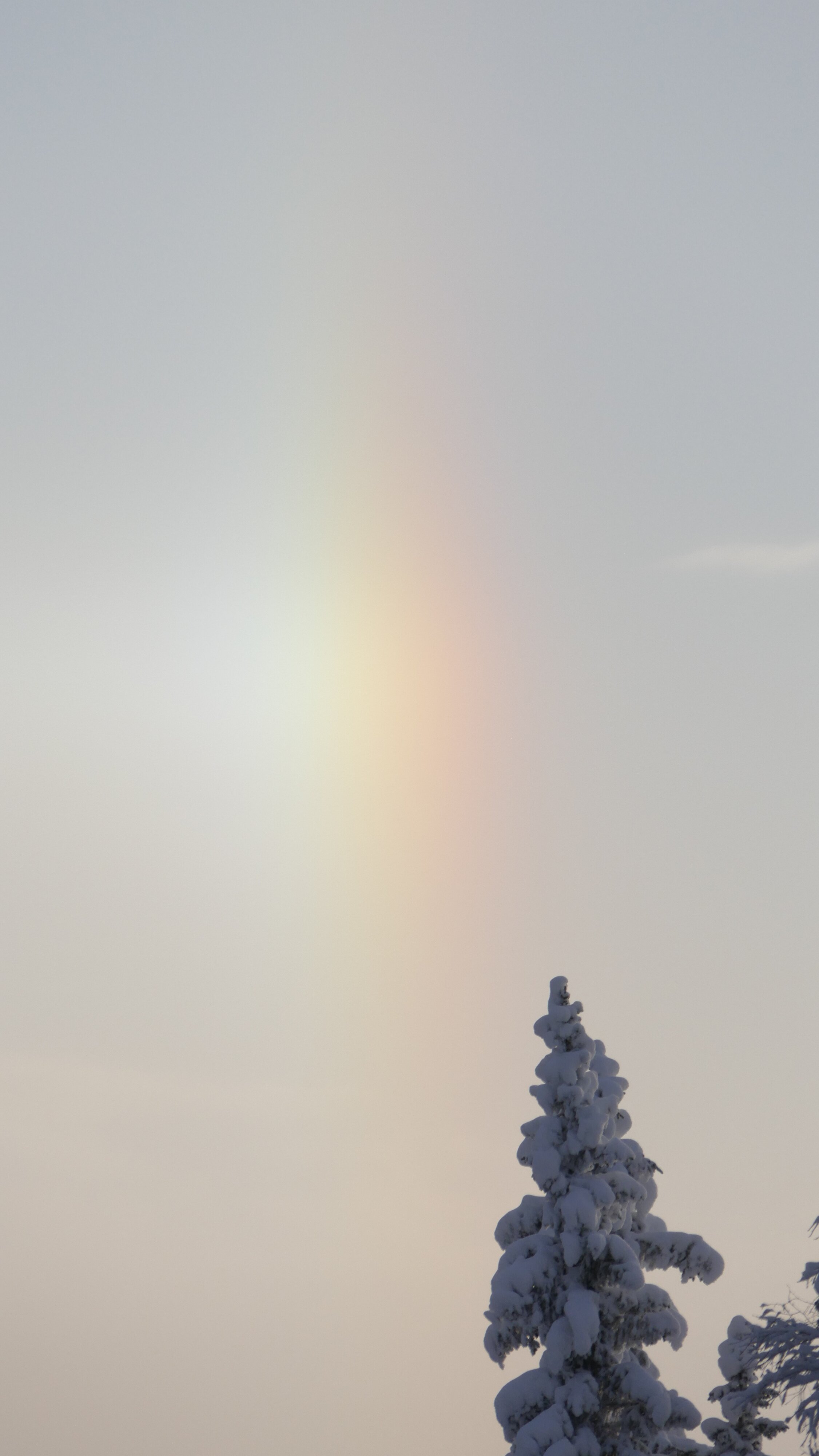 Geschenk #4: Am Halteplatz Fiandberg war ich unachtsam vorbei gefahren, wollte mir das aber nicht entgehen lassen und habe mitten auf der Straße gedreht. Die Situation habe ich ja nun schon oft fotografisch fest gehalten, aber es hat sich trotzdem gelohnt, denn erst da ist mir aufgefallen, dass es eine Nebensonne hat (die genau in der Straßenschneise stand die im 90° Winkel zur Straße in den Wald verschwindet), die zweite Nebensonne konnte man nicht sehen. Zwar war die Nebensonne nicht so intensiv wie in 2015 in Suomi, vermutlich weil die Sonne schon zu hoch war, keine Ahnung, aber trotzdem ein faszinierendes Ereignis.
