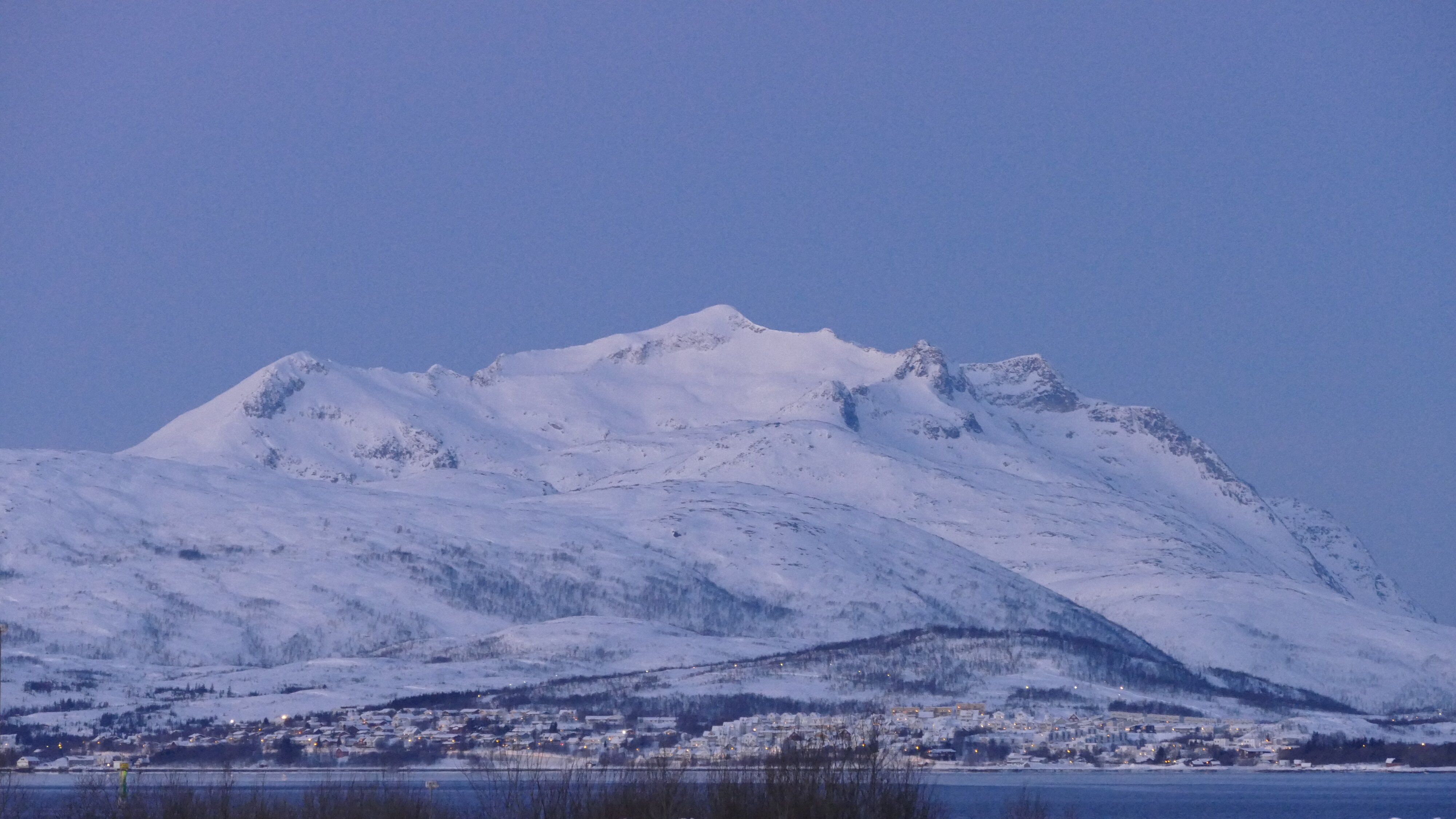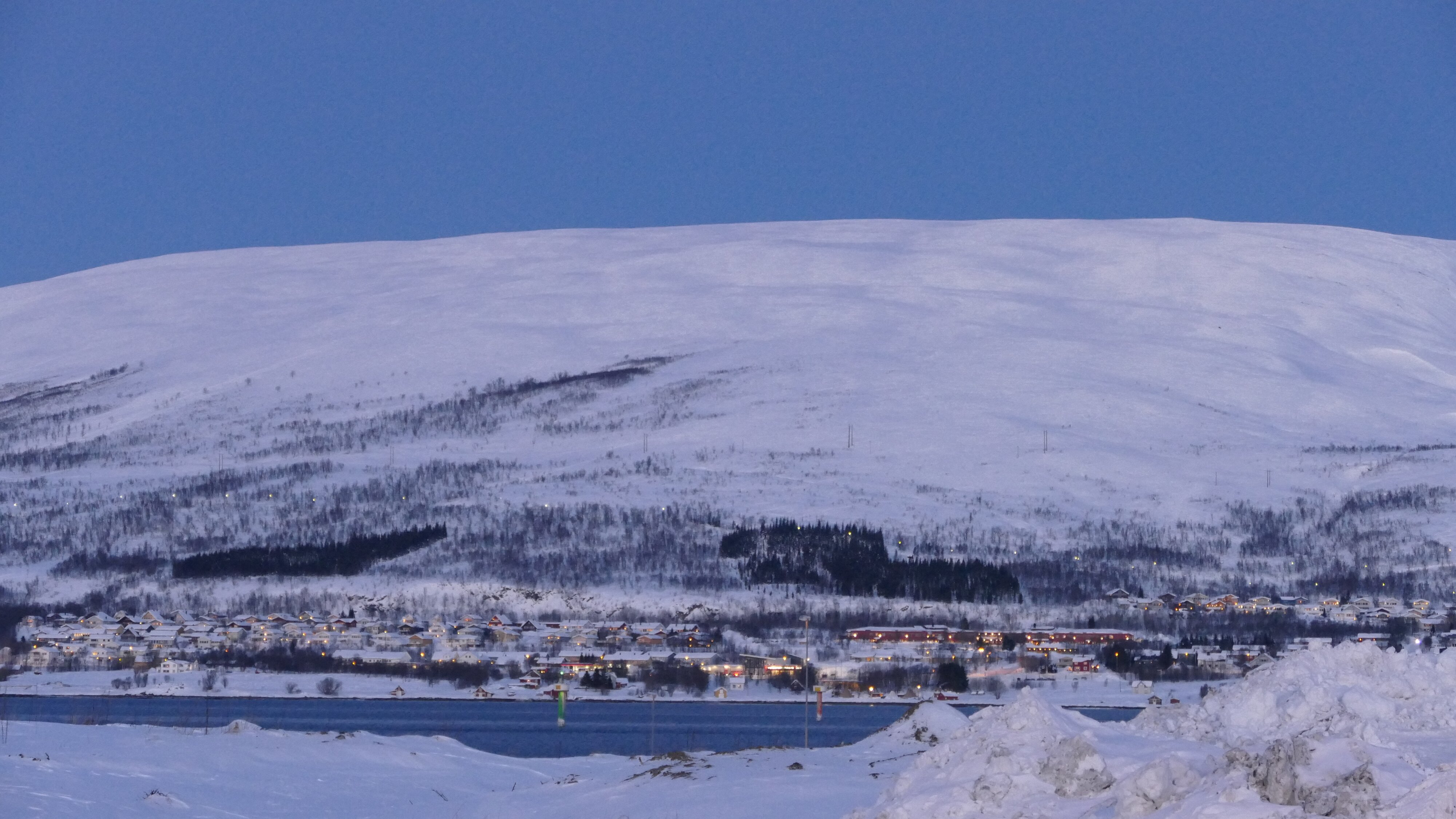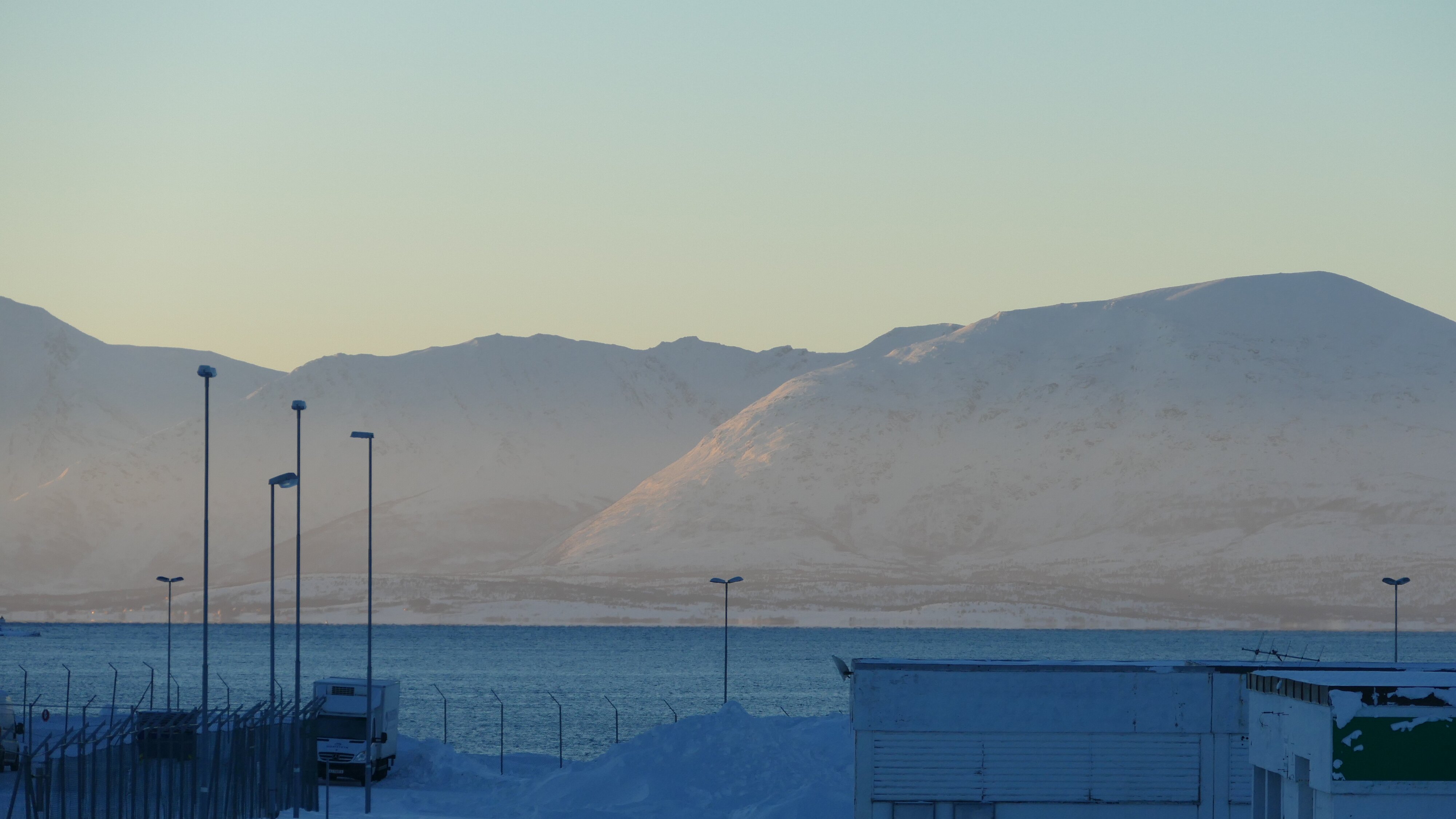 Bin wieder in der Baracke 5, diesmal aber im zweiten Stock und mit Blick auf die andere Hangseite mit dem Gruvelaget. Schon bei der Ankunft am Flughafen war es stockdunkel.