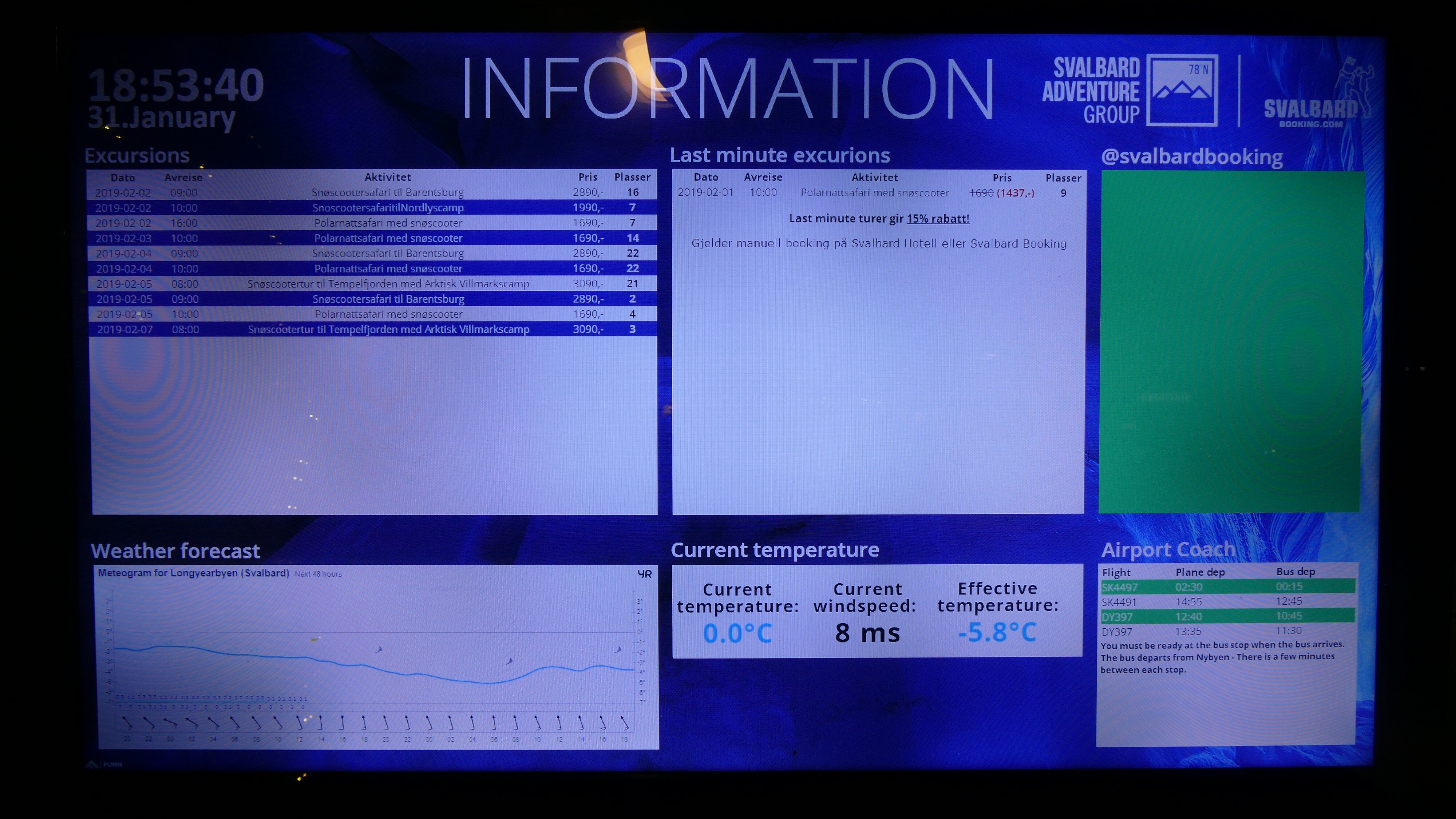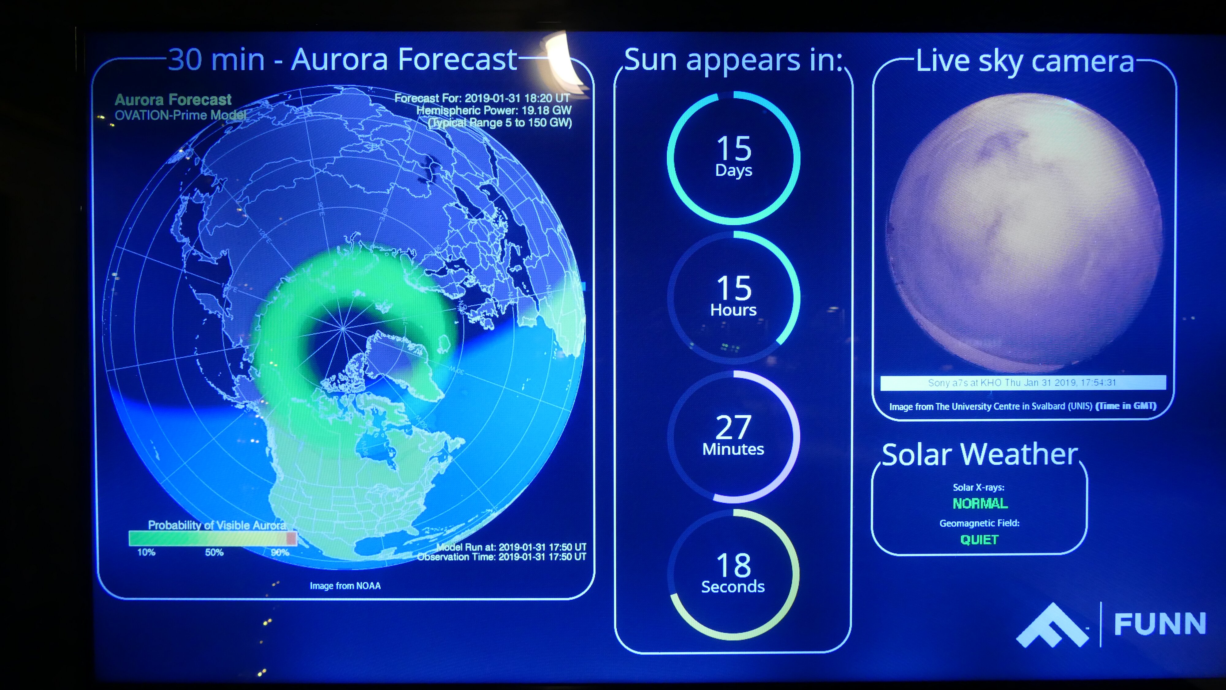 Beim Einloggen ins WiFi wird man gleich auf eine Internetseite von Hurtigruten-Svalbard gelenkt. Dort war ich schon am buchen der Nordlysfahrt am Freitag, aber zum Glück habe ich gesehen, dass auf der Bestätigungsseite was von 05.02.2019 stand und nicht 01.02.2019. Da buche ich das lieber gleich an der Rezeption, das ist sicherer. Denn die Wahrscheinlichkeit für Nordlicht steigt genau morgen Abend laut Vorhersage auf das Level G2, das war jetzt in den letzten Wochen wo ich das regelmäßig geprüft hatte eher selten der Fall. Vielleicht habe ich ja hier endlich Glück auf die ganz große Himmelsshow.