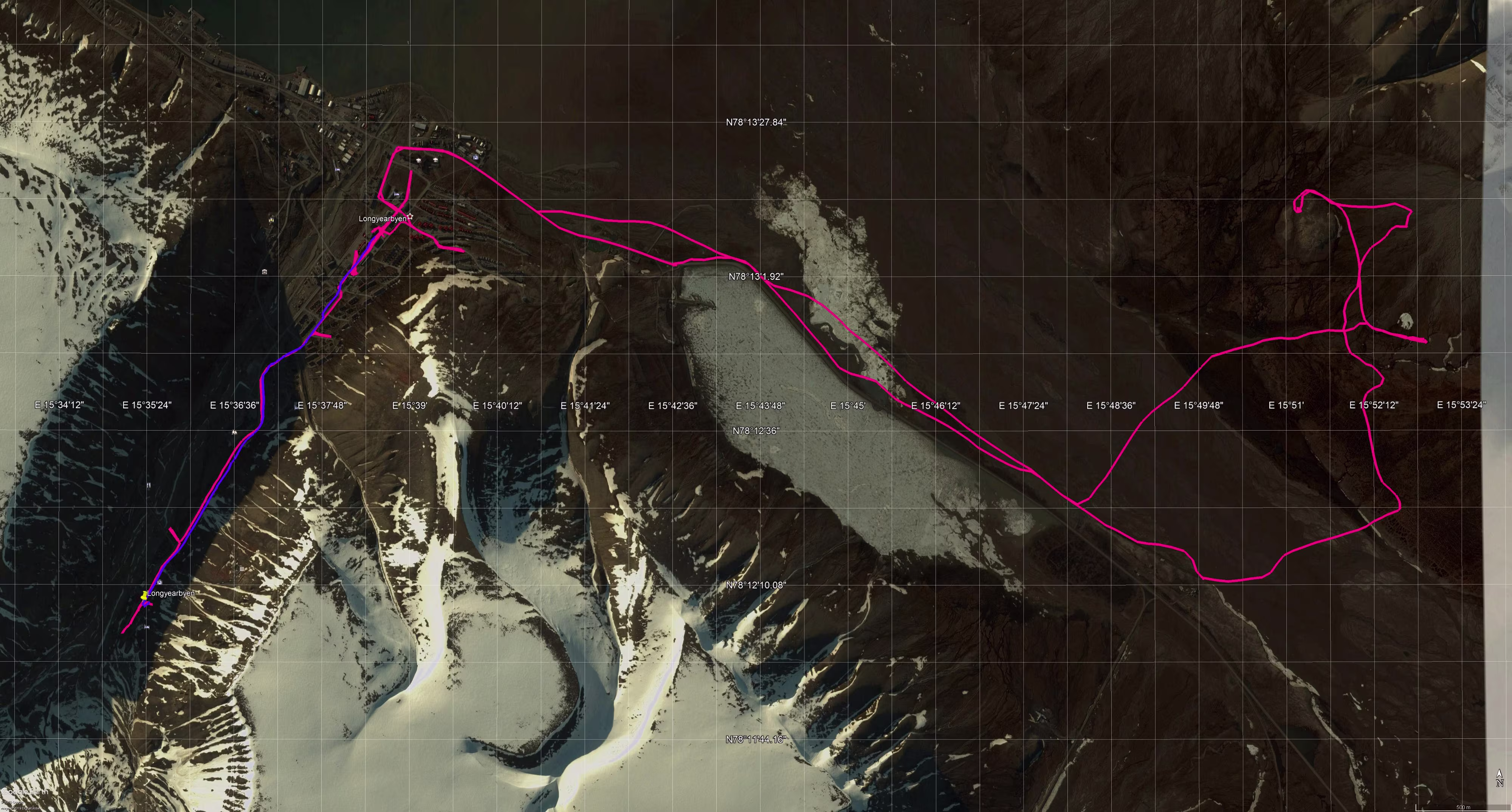 An einer Stelle an der wir anhielten war augenscheinlich nichts zu sehen, was nicht an der Dunkelheit lag. Wir standen auf einem „Pingu“ (äh, nee, Mist, hieß das wirklich so. Wenn man danach sucht kommt nur was mit einem Stofftier). Egal, diese „Dinger“ hat es sehr häufig auf Svalbard, insgesamt gibt es 20.000 davon. Im Prinzip herrscht ja hier Permafrostboden, aber irgendwo in der Tiefe fließt trotzdem Grundwasser und an einigen Stellen sucht sich dieses Wasser einen Weg an die Oberfläche und bildet dann wie bei Vulkanen eine leichte Erhebung die aus Eis besteht. Da meistens dann doch auch Schnee und Erde drauf liegt sieht ein ungeübtes Auge das natürlich nicht. Ja, klar, die Dinger heißen natürlich Pingo.