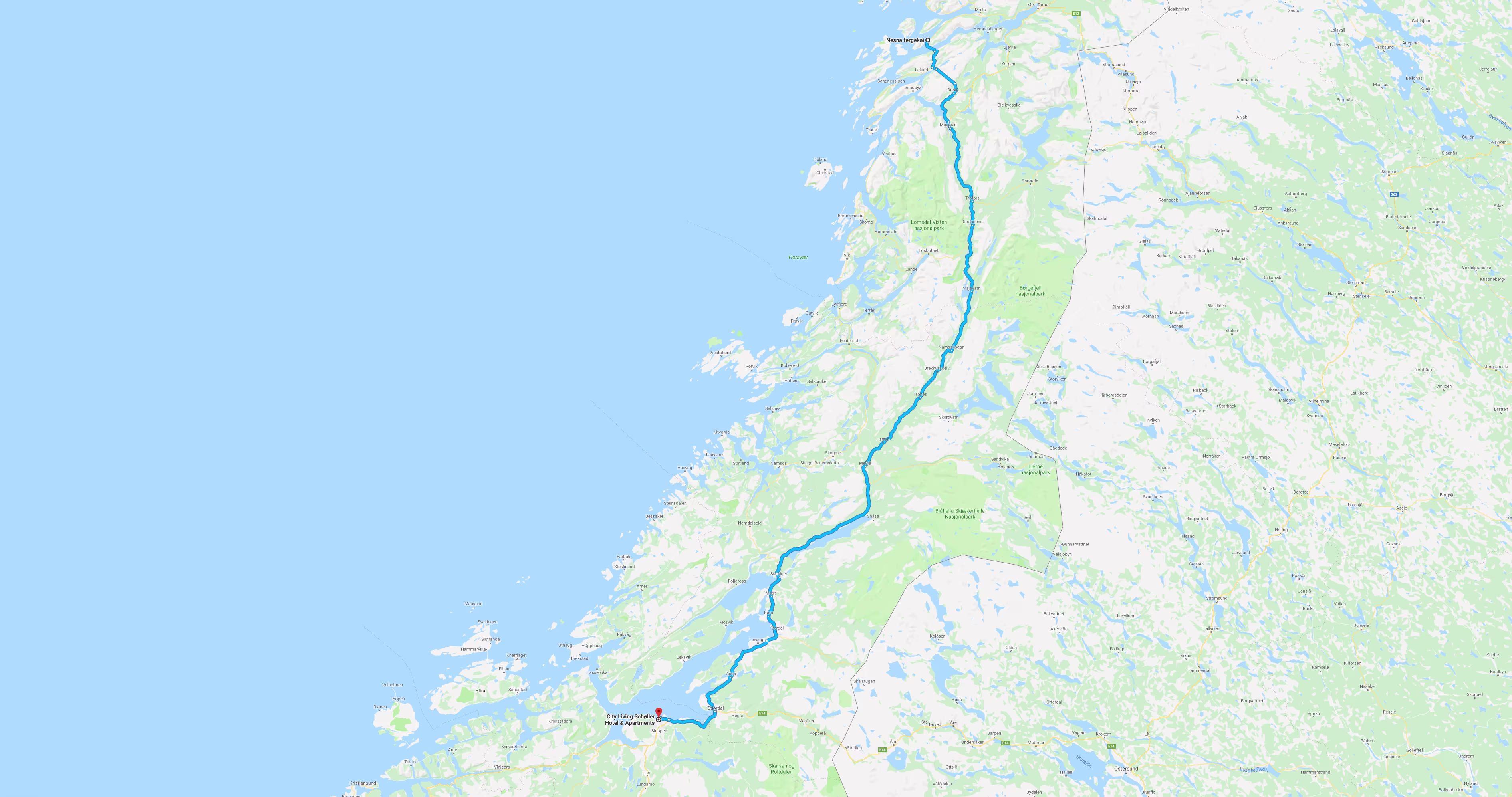 Das Hurtigruten-Schiff legt um 11:00 Uhr in Nesna an. Um 11:45 Uhr fährt eine Fähre von Nesna nach Levang.