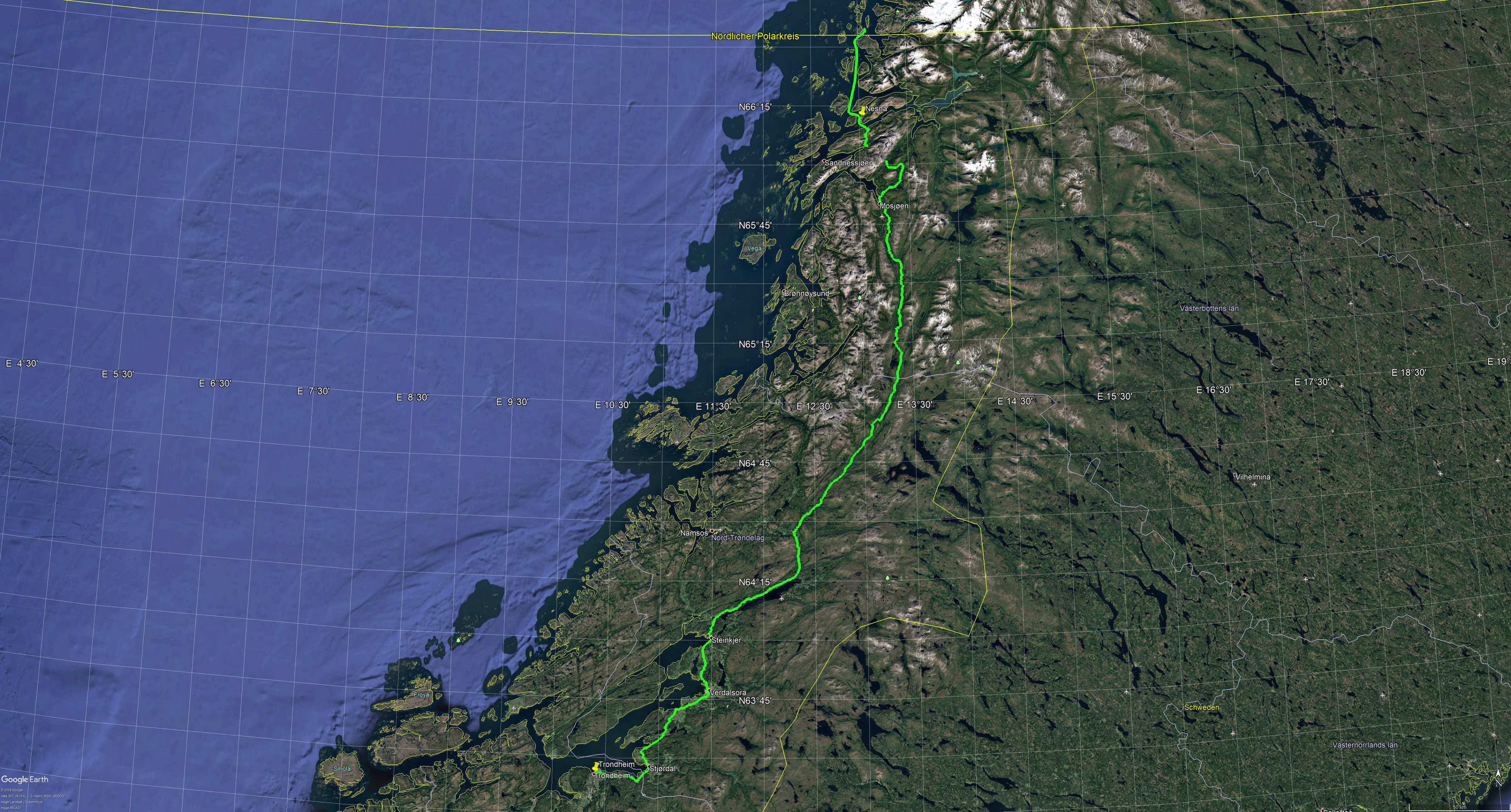 So kurz (ca. 50 km) vor Trondheim dachte ich noch was ist es da im Süden an einigen Stellen noch so hell am Himmel und vermutete es sei die Sonne die sich da durch die Wolken kämpft, aber dafür war es schon viel zu spät und die Erleuchtung ging viel zu weit in den Himmel. Das konnten also nur Polarlichter sein. Da es bewölkt war konnte man ein „tanzen“ nicht ausmachen.