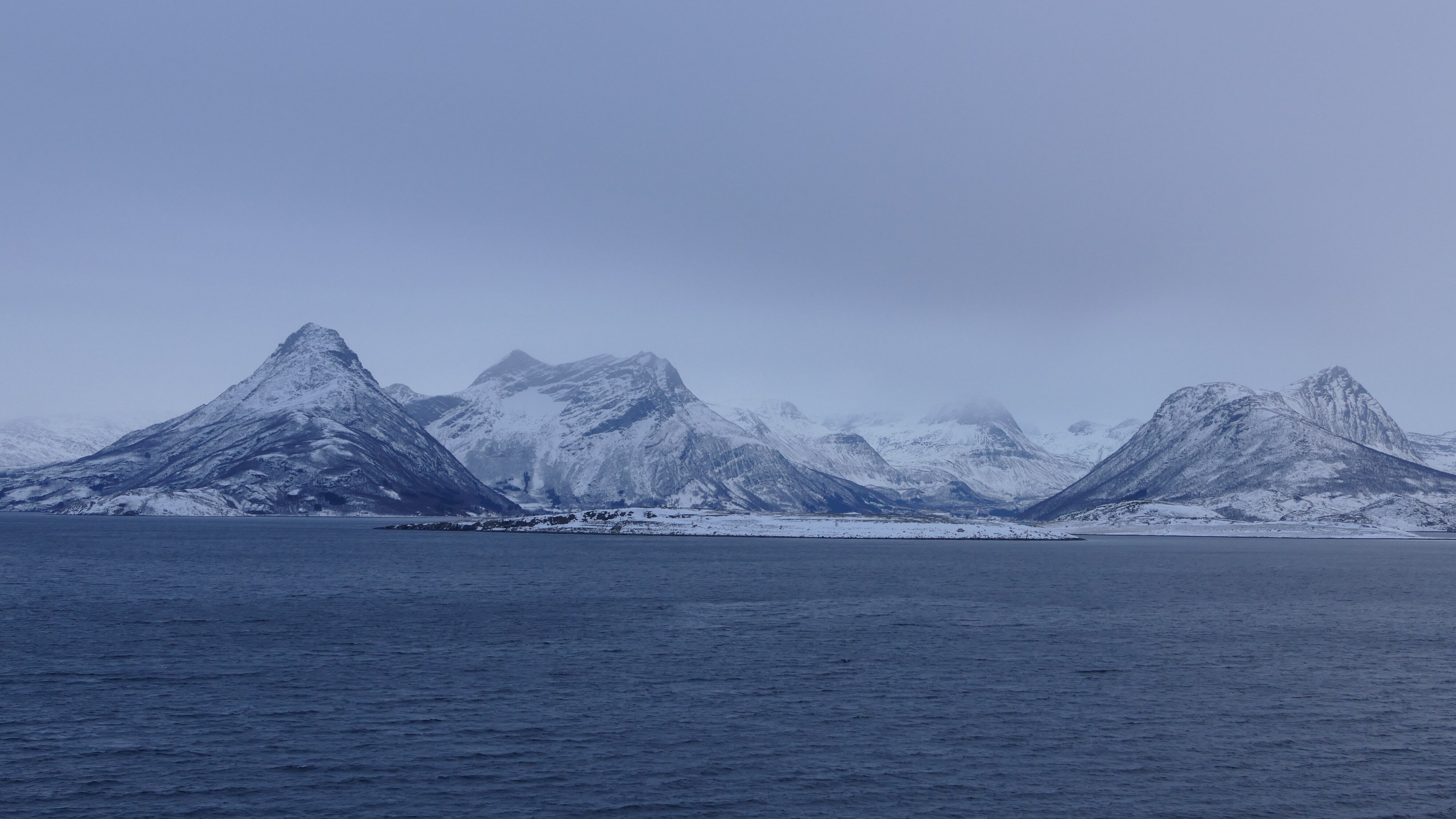 Beim Anlaufen von Nesna wurde die See etwas rauher und ich hoffte, dass das nun auch gut gehen wird, was auch der Fall war. Meine weitere Fähre nach Levang fuhr ca. eine halbe Stunde später. Es schneite wie wild und der Wagen war in der Wartezeit gut verschneit. Die Überfahrt dauerte nicht lange. Auf der kleinen Fähre standen sonst nur noch ein LKW und drei weitere Autos. Ich kann mir nicht vorstellen, dass die Fähre mit einer „schwarzen“ Null betrieben werden kann.