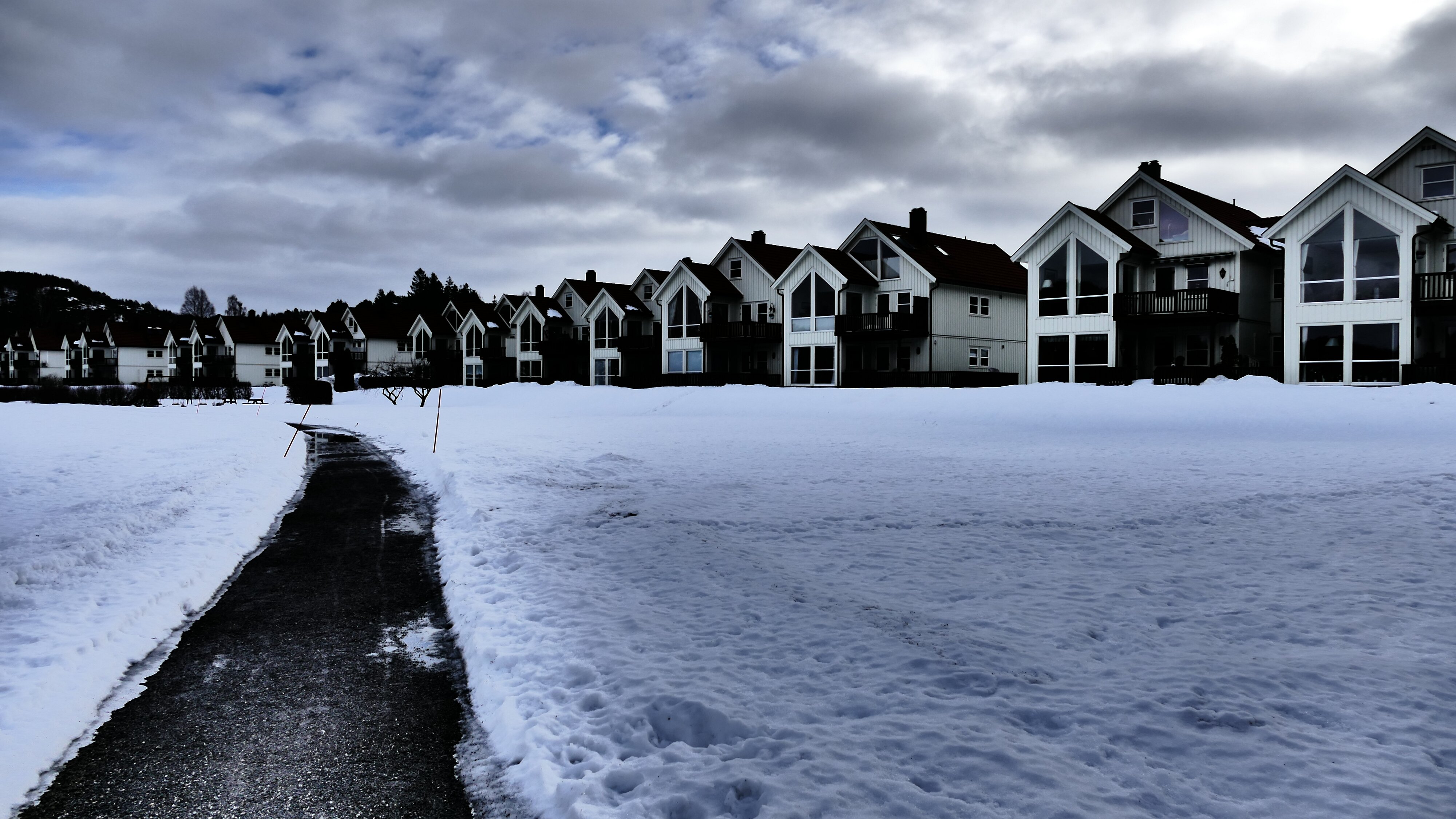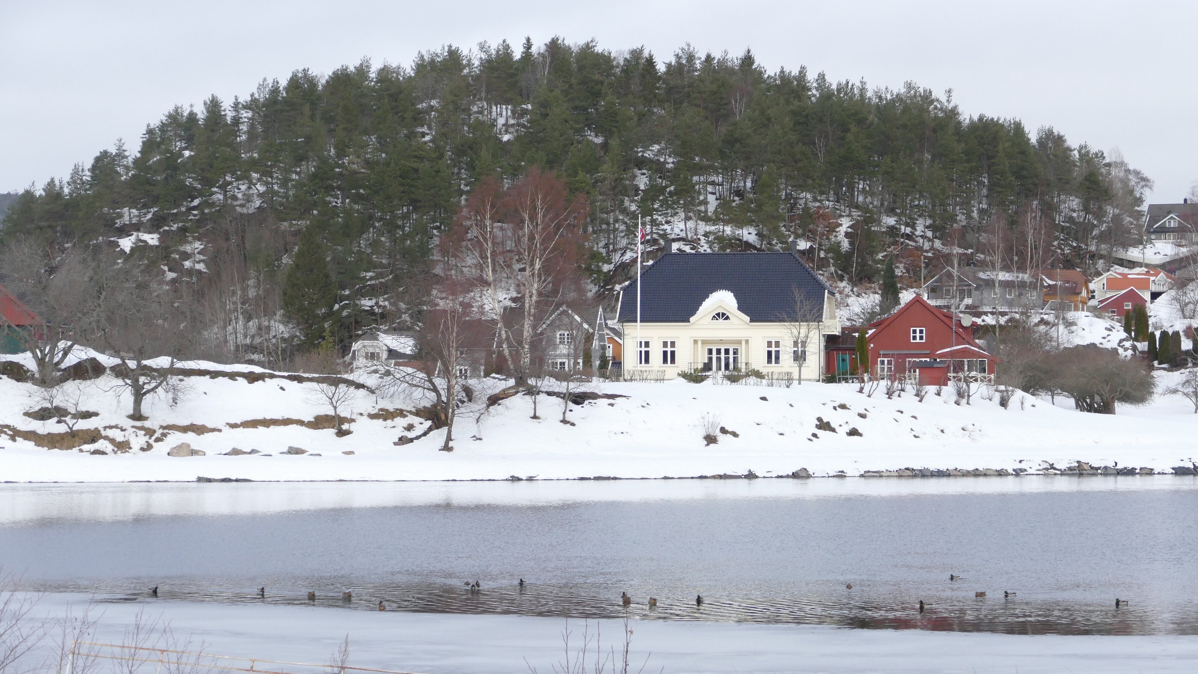 Selbst die äußerst konservative Prognose des Navi lässt mich lange vor Abfahrt der Fähre in Kristiansand ankommen. Da sehe ich einen kleinen Umweg nach Kristiansand und biege auf eine kleinere Straße ab. Sehr kurvig, Berg und Tal, dann öffnet sich die enge Schlucht und bietet einen Blick auf einen See und ein kleines Dorf auf einem Bergrücken. Das sah gut aus, da könnte man hin fahren und mal schauen, ob sich dort ein guter Blick auf den See bietet. Aber gar nicht nötig, etwas weiter am See entlang sehe ich Leute direkt am Ufer entlang laufen. Da ist ein kleiner geräumter Weg, ja super. Also zum Seeufer gefahren und einen kleinen Spaziergang absolviert. Wunderbar, die Sonne kam sogar mal kurz durch die Wolken und so sah alles gleich viel „hyggeliger“ aus.