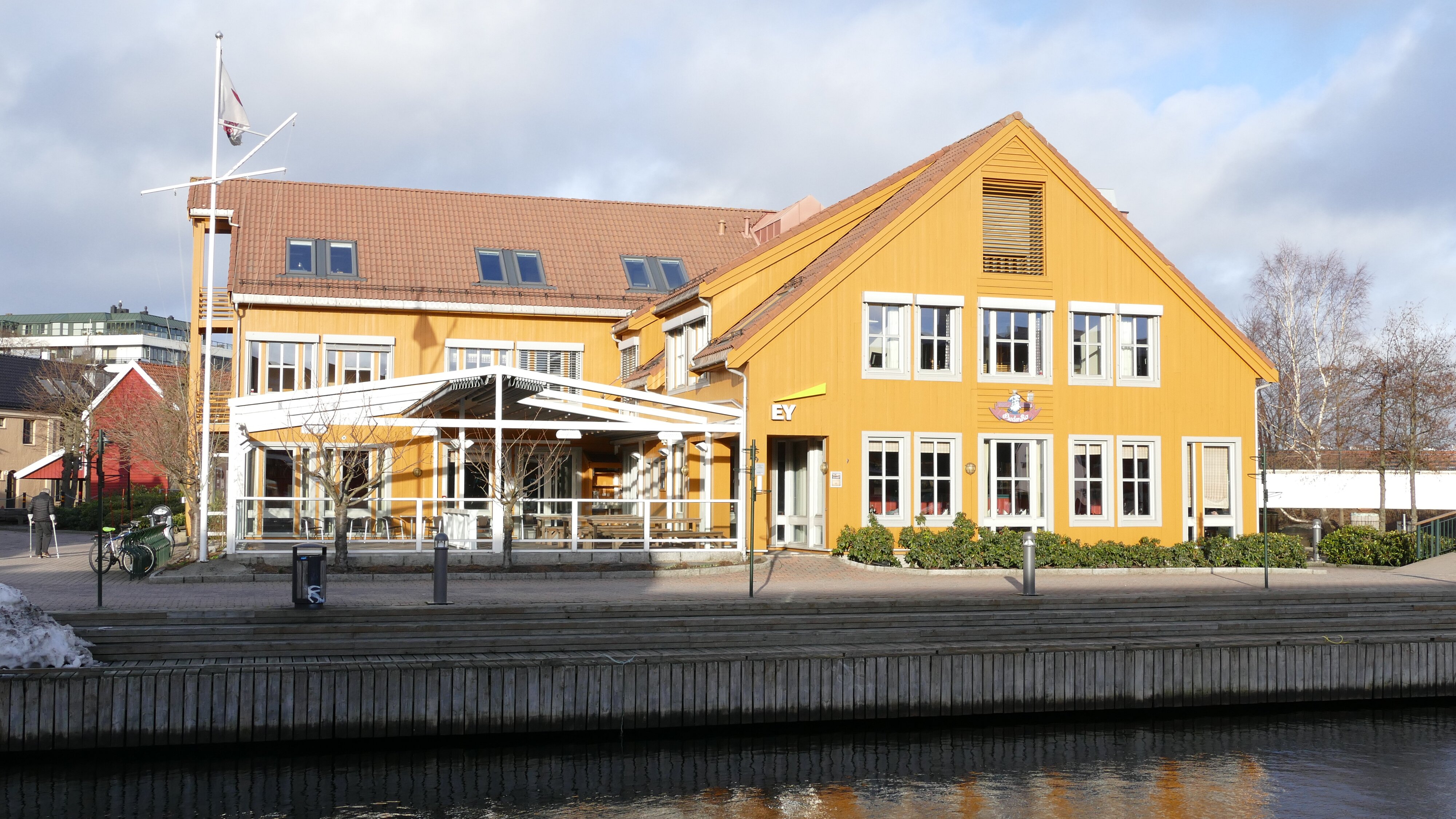 Trotzdem war es für die direkte Fahrt ans Terminal noch zu früh. Also erst mal an den Bahnhof gefahren, ein paar Fotos schießen und eruieren, ob man Material für Daheimgebliebene abgreifen kann. Weiter in die Stadt, ziellos. Wenn man parken will ist überall das Parkschwein zu füttern. Dann bot sich plötzlich der Anblick von einer schönen Stelle am Ufer und dann auch noch mit blauem Himmel. Da muss sich doch ein Plätzchen finden lassen, wo man mal die Karre für ein paar Minuten abstellen kann. Ja, gibt es. Und die Ecke da ist wirklich nett. Der genaue Name des Viertels ist mir schon wieder entfallen, muss ich später noch mal nachschlagen. Dort hat es auf jeden Fall jede Menge Restaurants und Kneipen und das alles um eine kleine Wasserfläche gruppiert. Wenn ich noch mal so viel vor der Zeit in Kristiansand ankommen sollte, dann wäre das der Platz wo man sicher was Leckeres zu essen bekommen würde. Unterwegs hatte ich nämlich nur einen Salat gegessen. Dort wunderte ich mich zuerst noch, warum aus der Tankstelle eine Frau mit zwei Packen Blumen in Plastikfolie umschlagen kam. Als ich drinnen saß und den Salat, mit „reke“ (also „Würmchen“, sprich Krabben), verknabberte, trabte wieder jemand mit Blumen aus dem Laden. Ja klar, das hatte ich doch die letzten Tage schon häufiger gesehen: „Husk, søndag, morsdag“, also am Sonntag ist Muttertag. Ja ja, Muttertag fällt von Land zu Land auf sehr unterschiedliche Tage.