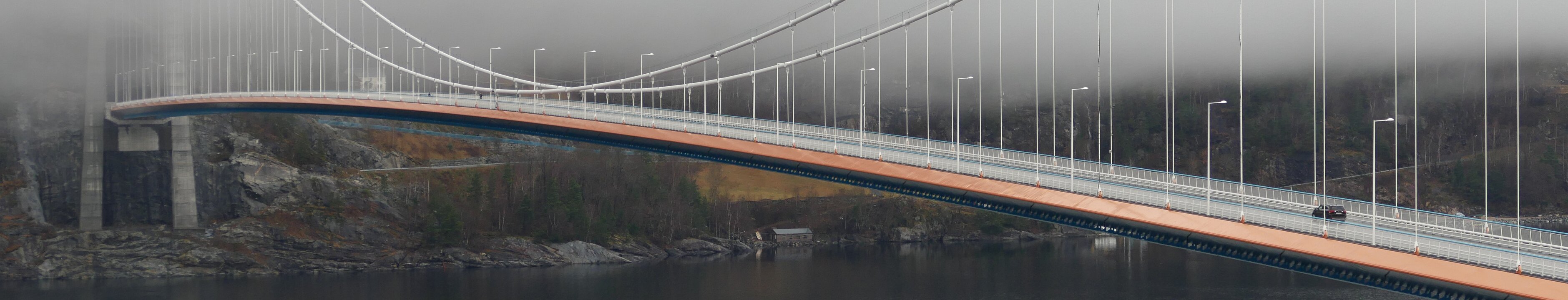 Ab Odda dann also östlich am Hardangerfjord entlang, die Straße kannte ich noch nicht. Sie ist deutlich kurvenreicher und schmäler als die Westuferstraße. Bevor es dann über die Hardangerbrua ging bin ich noch mal kurz von der Straße abgebogen, mitten an einem Kreisel im Tunnel und habe einen Parkplatz angesteuert. Von dort aus ging es am Hang einen Weg nach unten, immer die Brücke im Blick. Im Moment habe ich die Zahlen nicht im Kopf, aber sie ist glaube ich kürzer als die Hålogalandsbrua. Aber definitiv nicht minder imposant. Auf der Brücke hat es nicht nur zwei Fahrspuren für Fahrzeuge sondern auch einen richtig breiten Weg für Fußgänger und Fahrradfahrer. Der Weg den ich entlang lief führte direkt in den Tunnel hinein, der dann unmittelbar auf die Brücke übergeht. Es war mehr oder weniger windstill und somit überhaupt kein Problem sich auf der Brücke aufzuhalten. So etwa 1/3 der Strecke über die Brücke bin ich wohl gelaufen, es fing an zu regnen. Aber so schnell wie es anfing hörte es auch wieder auf.