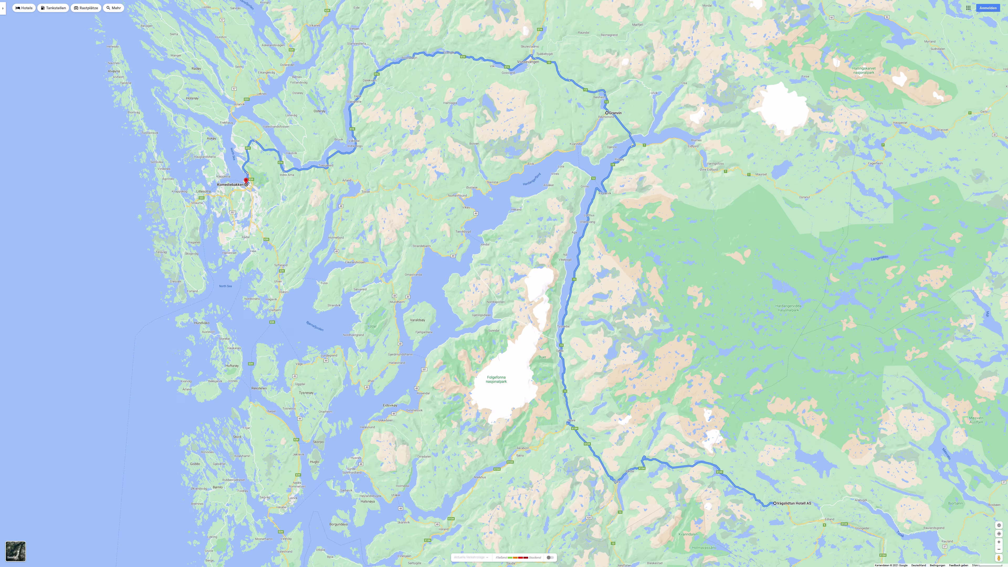 4 Std. 41 Min. (279 km) über Granvin (Hardangerbrua und Vallaviktunnel)