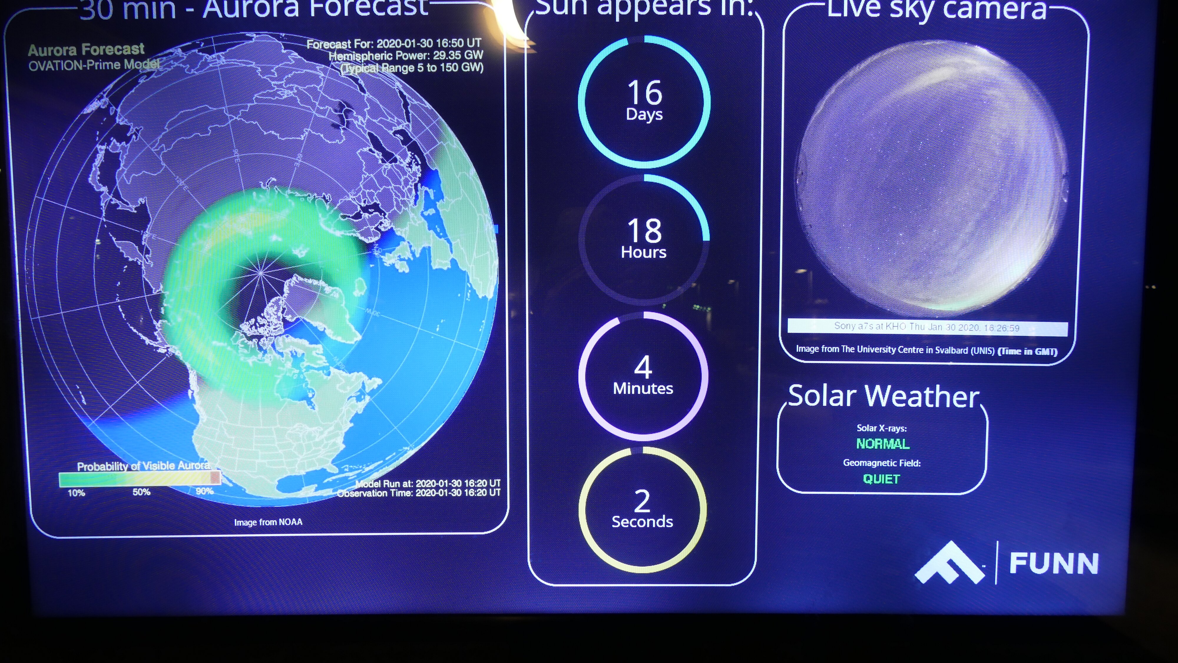 Beim Einchecken im „Radisson Blu Polar Hotel“ meinte der Rezeptionist, „Oh, ein Upgrade von den 'Coal Miners’ Cabins'“. Ja, so ist das. Die Einweisung was man wann wo alles im Hotel machen kann dauerte eine halbe Ewigkeit. Wie ich schon vorher auf der Homepage des Hotels gesehen hatte, hat sich eine Menge verändert. Dort wo 2015 noch die PolarJazz Abende begannen ist jetzt ein Restaurant bzw. der Frühstücksraum. Selbst die „Barentz Pub & Spiseri“ wurde umgebaut. Die neue Außenterrasse ist jetzt zu der Jahreszeit nicht so spannend.