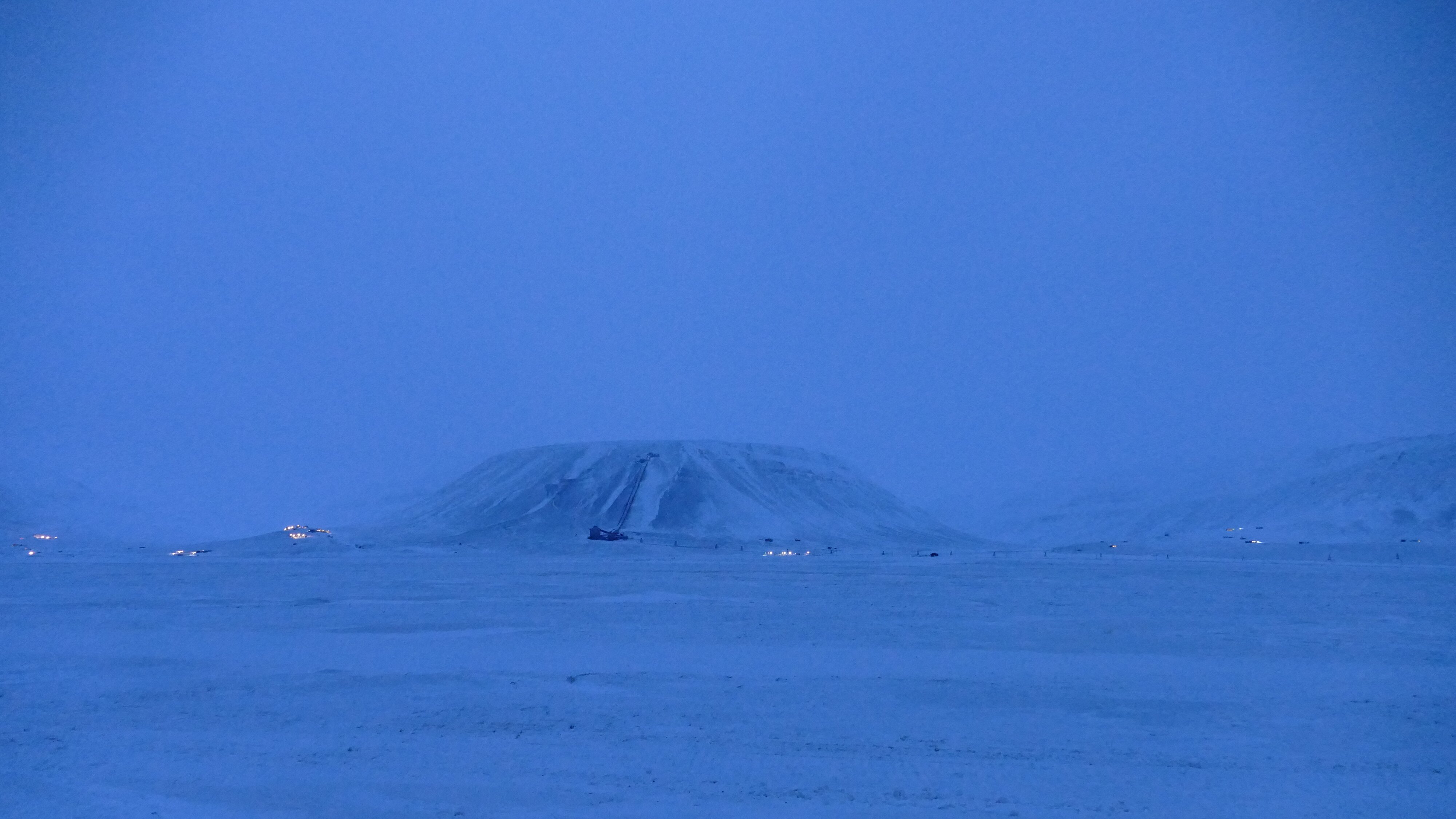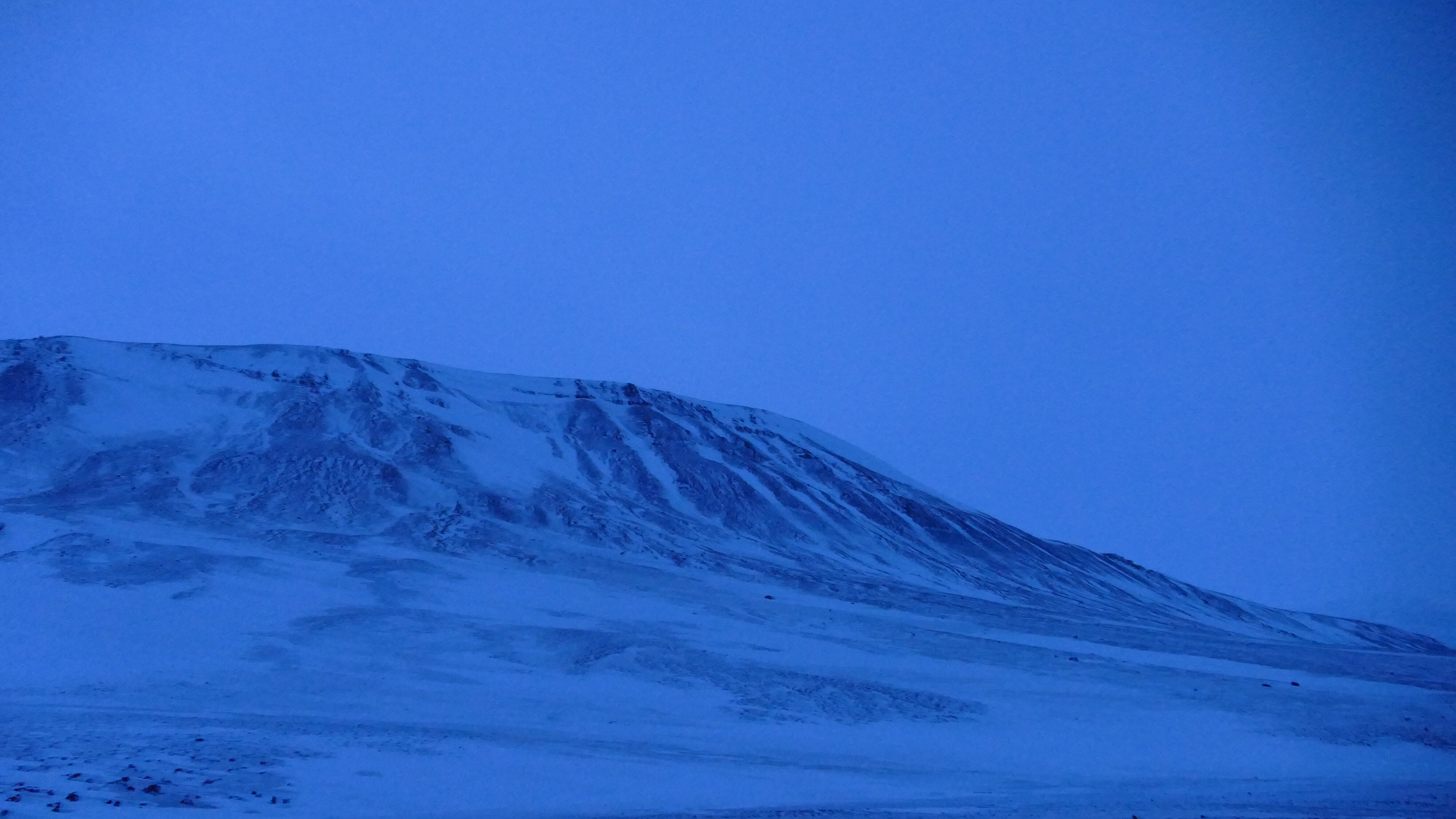 Da wir sehr flott unterwegs waren konnten wir weiter fahren als normal üblich. Also wieder aufsitzen und weiter geht es in das Adventdalen hin. Der Name kommt übrigens von Adventure Bay, also Abenteuerbucht, dass die Norweger der leichten Aussprache wegen umbenannt hatten. Wir hielten dann nach einer ganzen Weile wieder an. Neben uns lag ein ungewöhnlicher kleiner Hügel, bestehend aus Geröll und auch aus purem Schnee und Eis. Bei der Frage von Amelie was das wohl sein könnte konnte ich natürlich mit meinem Wissen von der letztjährigen Tour antworten, ein Pingo. Dieses Exemplar hier war deutlich mächtiger, man hätte es so ohne weiteres nicht besteigen können, so steil ging es bergauf. Dann gab es noch das leckere süße und heiße Getränk auf Basis von Solbær zu trinken, lecker.