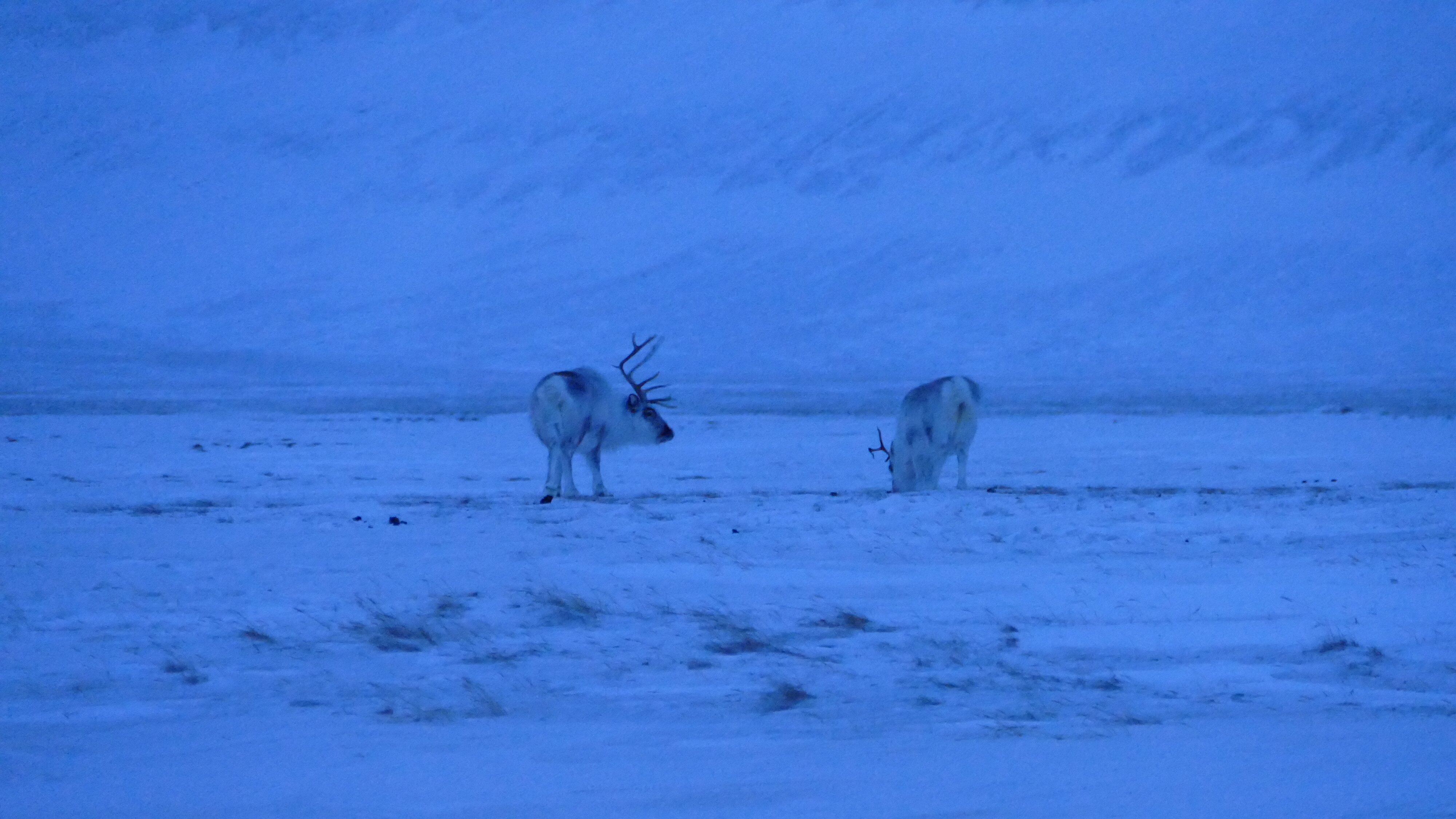 Die Tiere hier auf Svalbard sind kleiner, kompakter, haben kürzere Beine, als die Verwandten auf dem Festland. Die Beine können sie temperaturtechnisch so runterfahren, dass das Blut nur noch knapp 0 Grad hat.