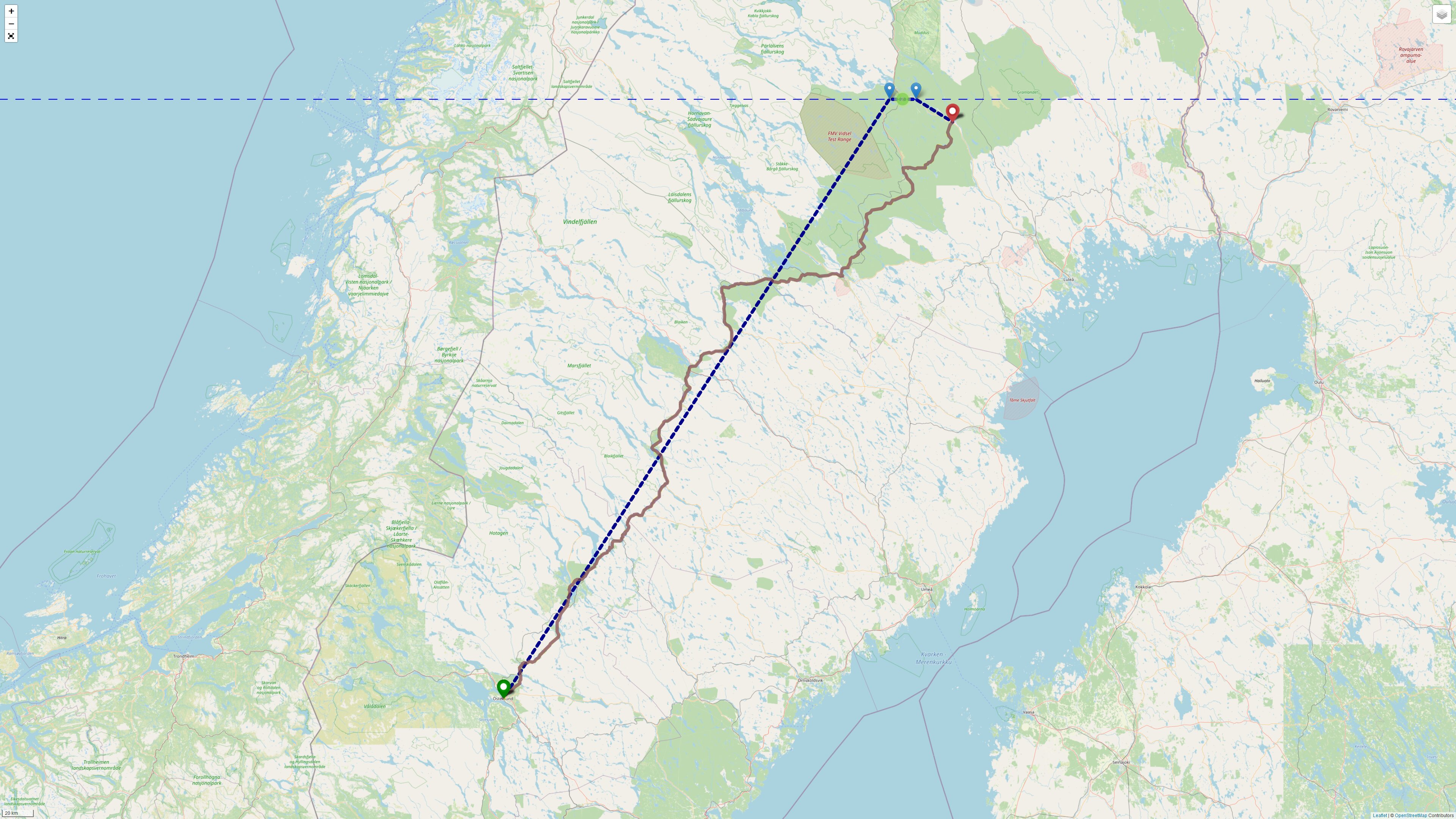 Sowohl G__gle Maps als auch OSM lotsen einem vor Jokkmokk von der [E45] runter auf eine Seitenstraße [BD 682] die in die [BD 740] übergeht und südöstlich nach Vuollerim führt. Womit man sich gleich zwei Polarkreisüberquerungen beraubt hätte. Aber diese Seitenstraße wäre mal eine willkommene Abwechslung, auch wenn sie auf G__gle Street View ziemlich schmal aussieht. Die Abkürzung bringt ca. 40 km Ersparnis.